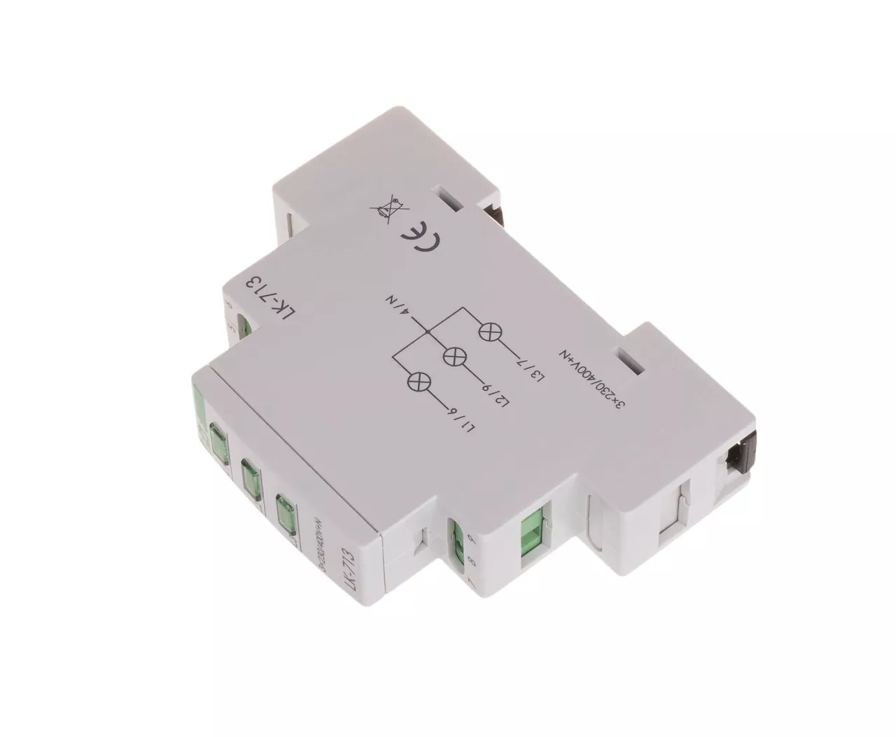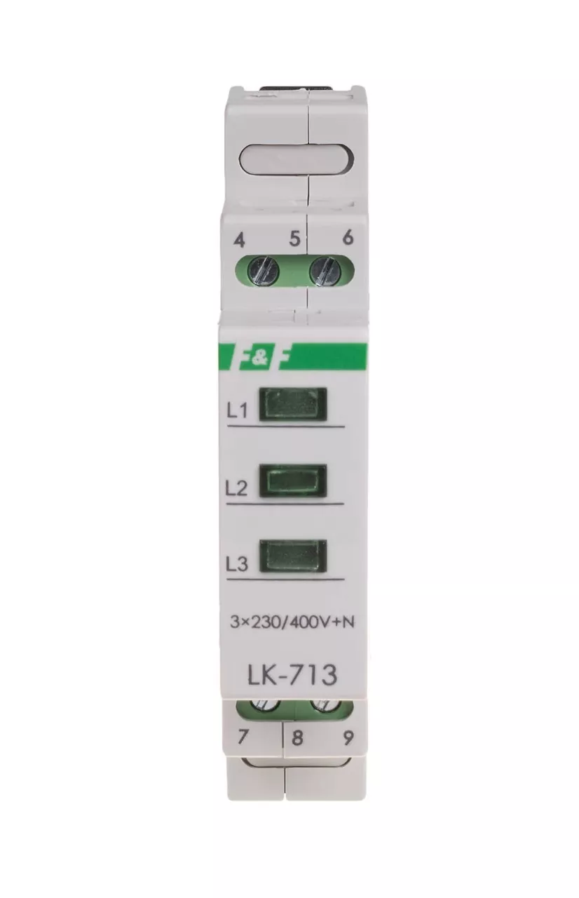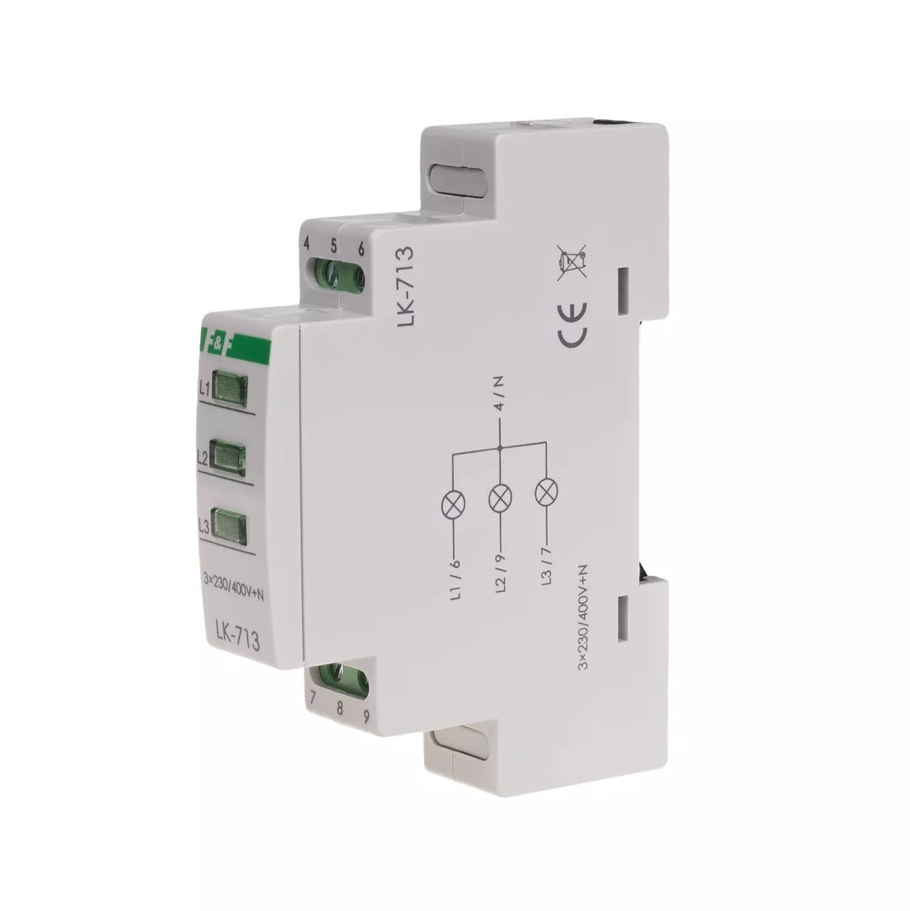 Napięcie zasilania 3×230 V+N Kontrola zasilania 3 × LED Ø5 mm Kolory LED 3 x zielona Prąd znamionowy 1,7 mA Przyłącze zaciski śrubowe 2,5 mm² Moment dokręcający 0,4 Nm Pobór mocy 1,1 W Temperatura pracy -25 ÷ 50 °C Wymiary 1 moduł (18 mm) Montaż na szynie 35 mm Stopień ochrony IP20