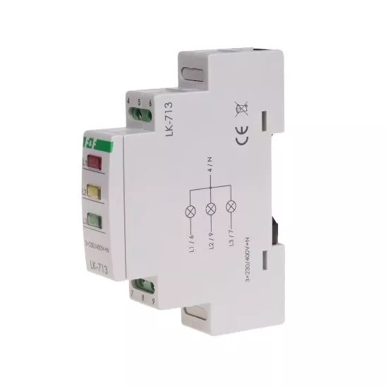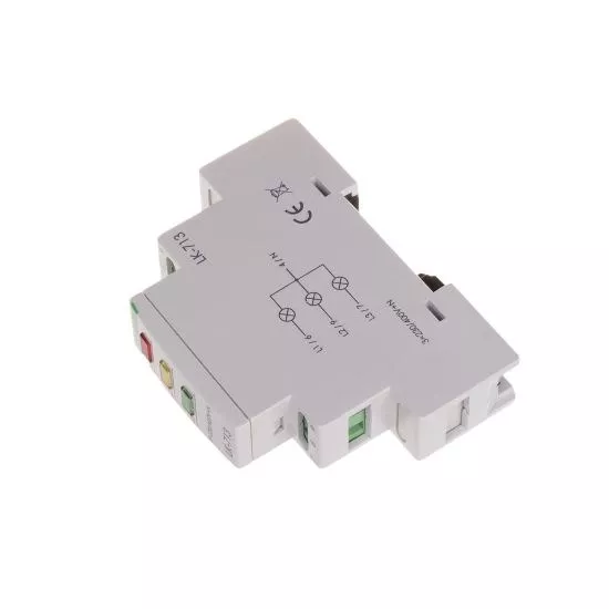 Napięcie zasilania 3×230 V+N Kontrola zasilania 3 × LED Ø5 mm Kolory LED 3 x czerwona Prąd znamionowy 1,7 mA Przyłącze zaciski śrubowe 2,5 mm² Moment dokręcający 0,4 Nm Pobór mocy 1,1 W Temperatura pracy -25 ÷ 50 °C Wymiary 1 moduł (18 mm) Montaż na szynie 35 mm Stopień ochrony IP20
