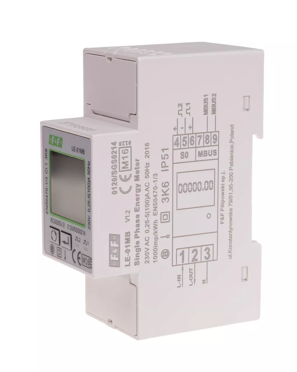Typ jednofazowy Porty M-Bus Protokół komunikacyjny M-Bus Napięcie odniesienia 3×400 V+N Prąd bazowy 5 A Prąd maksymalny 100 A Minimalny prąd mierzony 0,02 A Dokładność pomiaru zgodnie z IEC61036 klasa 1 Pobór własny licznika 10 VA; 2 W Zakres wskazań liczydła 0÷99999,99 kWh Stała licznika 1, 10, 100, 1000 imp/kWh Sygnalizacja sczytywania 2 x LED Stała licznika kvarh 1, 10, 100, 1000 imp/kvar Wyjście impulsowe kWh/kvarh otwarty kolektor Napięcie podłączenia kWh/kvarh maks. 30 V DC Prąd podłączenia kWh/kvarh maks. 27 mA Czas impulsu kWh/kvarh 60, 100, 200 ms Napięcie mierzone 176÷276V AC Przeciążalność 30×lmax/10 ms Izolacja 4 kV/1 min.; 6 kV/1 μs Przyłącze zaciski śrubowe 1,5 mm² Temperatura pracy -20÷55°C Wymiary 2 moduły (35 mm) Montaż na szynie 35 mm Stopień ochrony IP51