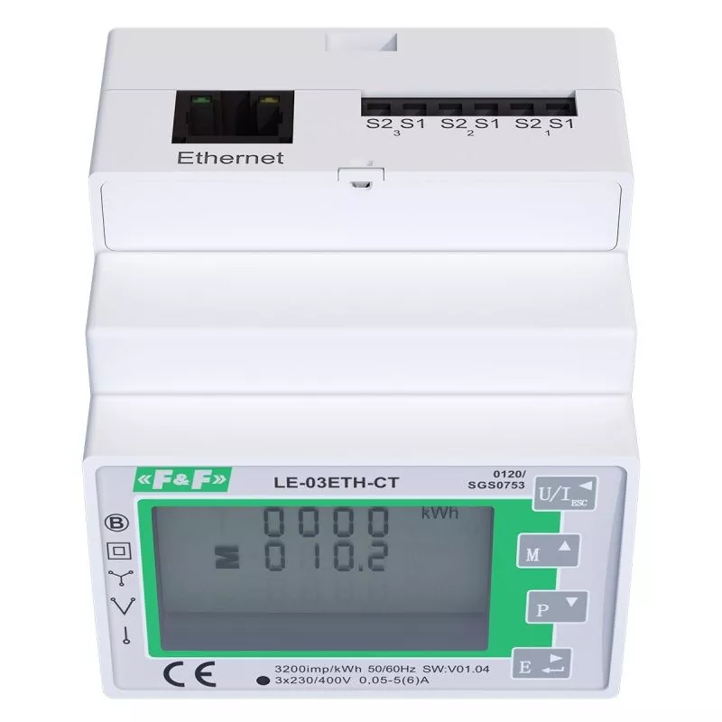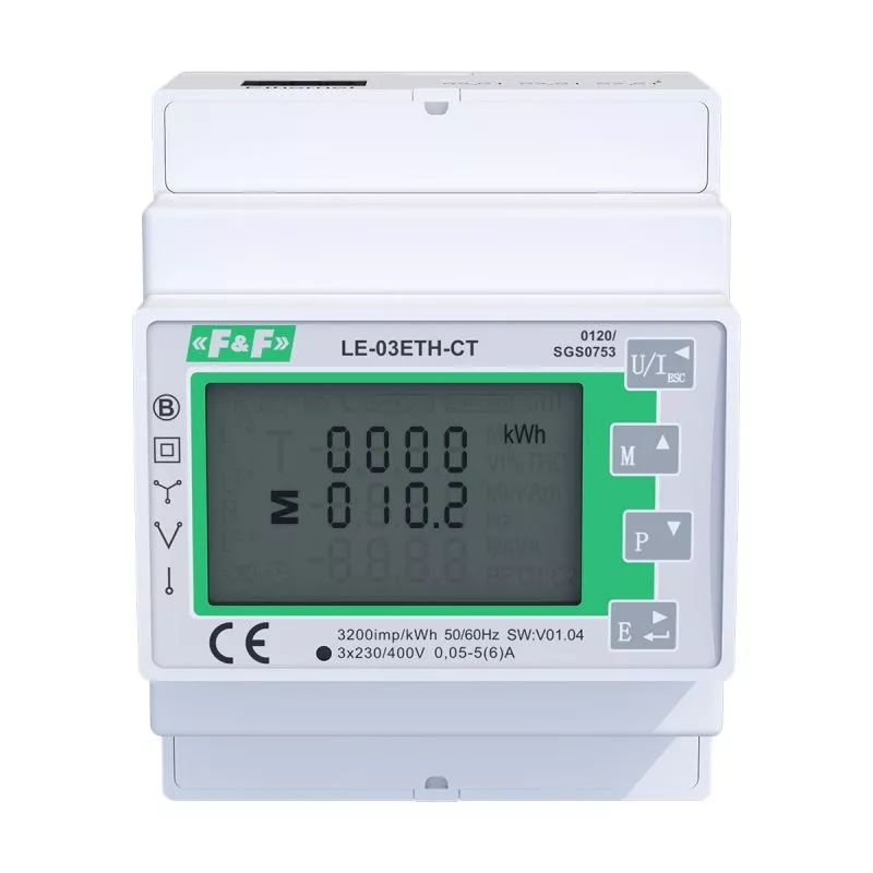 Napięcie zasilania 85÷275 V AC Porty komunikacyjne Ethernet Protokół komunikacyjny Modbus TCP Prąd bazowy 3×5 A Prąd maksymalny 3×6 A Minimalny prąd mierzony 0,02 A Pobór własny licznika 10 VA; 2 W Zakres wskazań liczydła 0÷9999999,9 kWh Sygnalizacja sczytywania LED czerwona Napięcie znamionowe 3×230/400 V Częstotliwość znamionowa 50 Hz Przeciążalność 20×Imax/0,5 s Izolacja 4 kV/1 min.; 6 kV/1,2 μs Przyłącze zaciski śrubowe 2,5 mm² Temperatura pracy -40÷70°C Wymiary 4 moduły (70 mm) Montaż na szynie 35 mm Stopień ochrony IP51 Kategoria pomiarowa (CAT) III Dokładność pomiaru - energia czynna (EN504070-3:2022) klasa B Dokładność pomiaru - energia bierna (IEC62053-23) klasa 2 Dokładność pomiaru - napięcie 0,5% Dokładność pomiaru - prąd 0,5% Dokładność pomiaru - częstotliwość 0,2% Dokładność pomiaru - współczynnik mocy 1% Dokładność pomiaru - moc czynna i bierna ±1% Zakres pomiarowy napięć fazowych (1p2w i 3p4w) 100÷276 V AC Zakres pomiarowy napięć międzyfazowych (3p3w) 172÷480 V AC Moc wejść prądowych mniej niż 1 VA IP (domyślnie) 192.168.1.200 Port 502 Maska podsieci 255.255.255.0 Brama 192.168.1.1 DHCP (domyślnie) wyłączony
