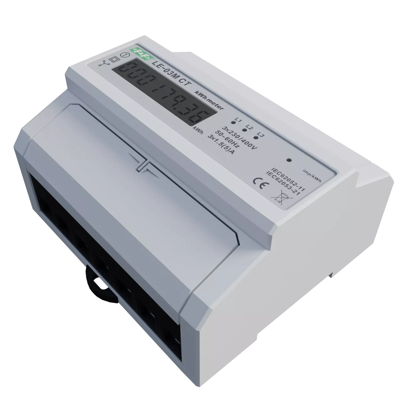 Typ trójfazowy Protokół komunikacyjny MODBUS RTU Zgodność Dyrektywa MID 2014/32/EU Napięcie odniesienia 3×400 V+N Prąd bazowy 1,5 A Prąd maksymalny 5 A Minimalny prąd mierzony 0,04 A Dokładność pomiaru zgodnie z IEC61036 klasa 1 Pobór własny licznika 10 VA; 2 W Zakres wskazań liczydła zależny od przekładni Stała licznika zależna od przekładni Sygnalizacja sczytywania LED czerwona Wyjście impulsowe SO+ SO- otwarty kolektor Napięcie podłączenia SO+ SO- maks. 30 V DC Prąd podłączenia SO+ SO- maks. 27 mA Czas impulsu SO+ SO- 35 ms Liczba znaków LCD 7 Przyłącze zaciski śrubowe 25 mm² Temperatura pracy -20÷55°C Wymiary 7 modułów (122 mm) Montaż na szynie 35 mm Stopień ochrony IP20