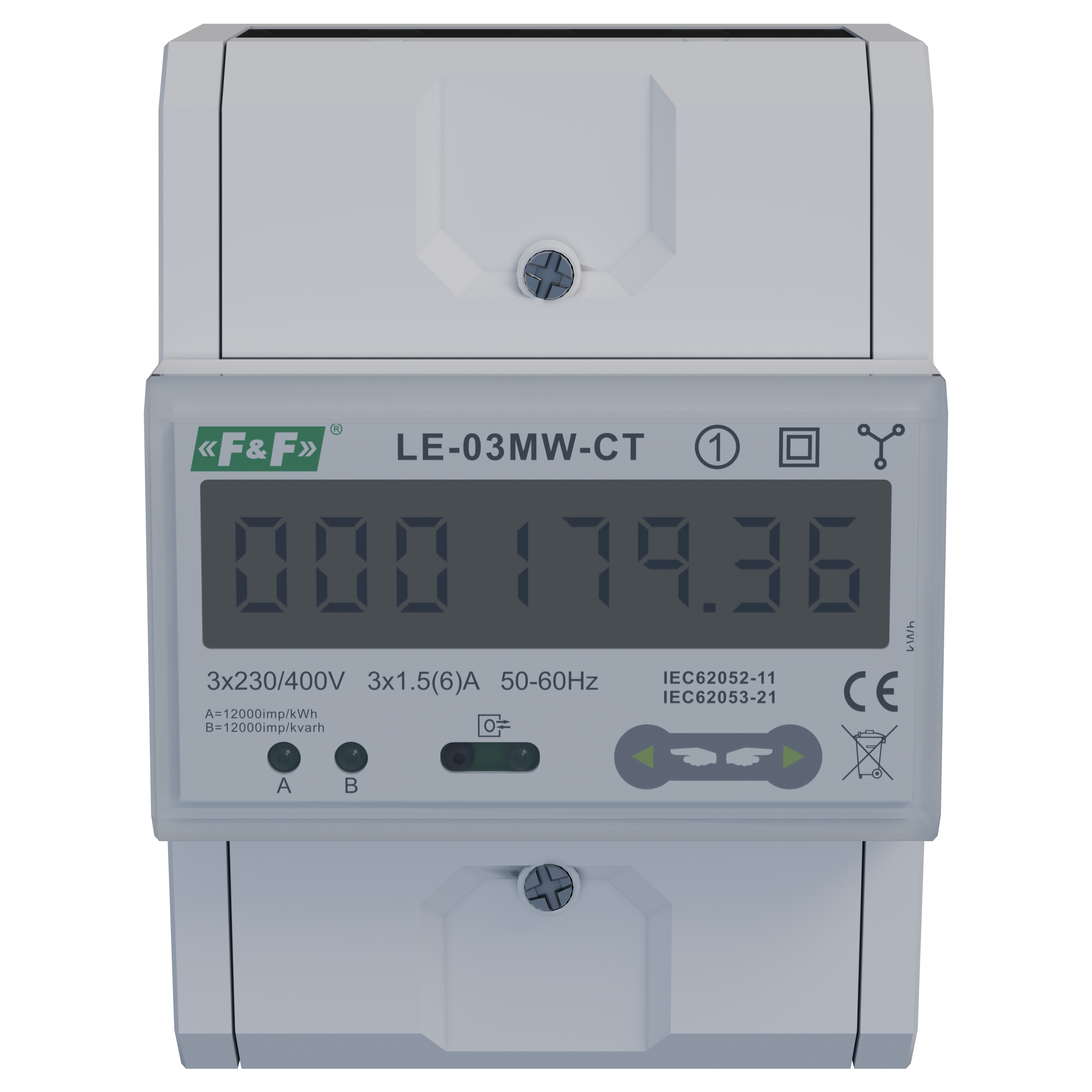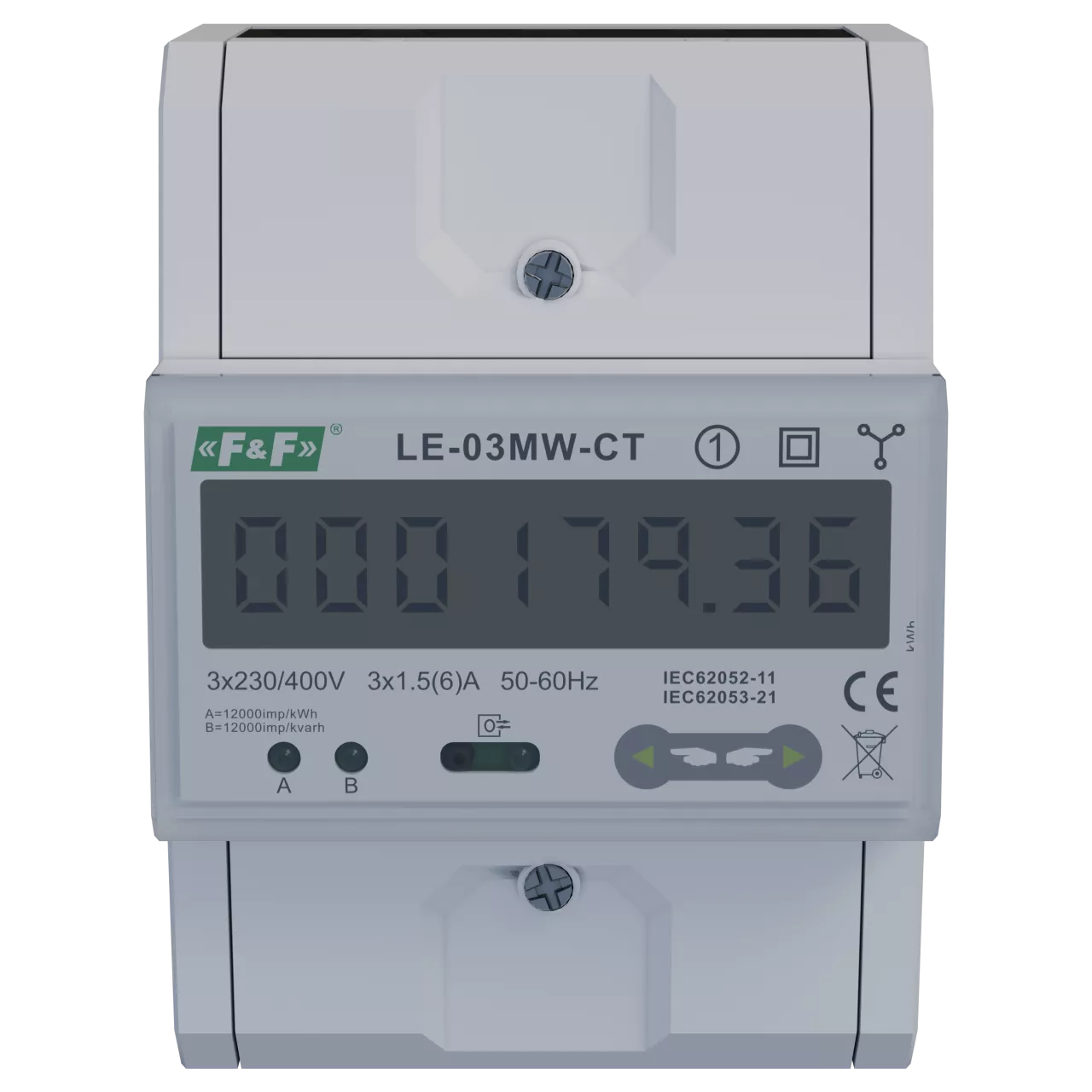 Typ trójfazowy Porty RS-485 Protokół komunikacyjny MODBUS RTU Zgodność IEC61036 Napięcie odniesienia 3×230/400 V+N Prąd bazowy 1,5 A Prąd maksymalny 6 A Minimalny prąd mierzony 0,003 A Dokładność pomiaru zgodnie z IEC61036 klasa 1 Pobór własny licznika 10 VA; 2 W Zakres wskazań liczydła zależny od przekładni Stała licznika zależna od przekładni Sygnalizacja sczytywania 2 x LED Wyjście impulsowe SO+ SO- otwarty kolektor Napięcie podłączenia SO+ SO- maks. 30 V DC Prąd podłączenia SO+ SO- maks. 27 mA Czas impulsu SO+ SO- 35 ms Klasa dokładności 1 Liczba znaków LCD 8 Napięcie mierzone L-N 100÷289 V AC Napięcie mierzone L-L 173÷500 V AC Przyłącze zaciski śrubowe 25 mm² Temperatura pracy -20÷55°C Wymiary 76×100×65 mm (4,5 modułu DIN) Montaż na szynie 35 mm Stopień ochrony IP51