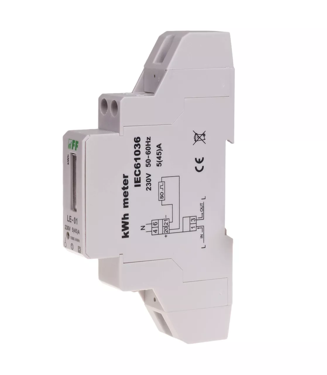 Typ jednofazowy Protokół komunikacyjny brak Napięcie odniesienia 230 V AC ±30% Prąd bazowy 5 A Prąd maksymalny 45 A Minimalny prąd mierzony 0,02 A Dokładność pomiaru zgodnie z IEC61036 klasa 1 Pobór własny licznika 8 VA; 0,4 W Zakres wskazań liczydła 0÷99999,9 kWh Stała licznika (1 Wh/imp) 1000 imp/kWh Sygnalizacja sczytywania LED czerwona Wyjście impulsowe SO+ SO- otwarty kolektor Napięcie podłączenia SO+ SO- maks. 27 V DC Prąd podłączenia SO+ SO- maks. 27 mA Czas impulsu SO+ SO- 70 ms Przyłącze zaciski śrubowe 6,0 mm² Temperatura pracy -25 ÷ 65°C Wymiary 1 moduł (18 mm) Montaż na szynie 35 mm Stopień ochrony IP20