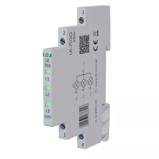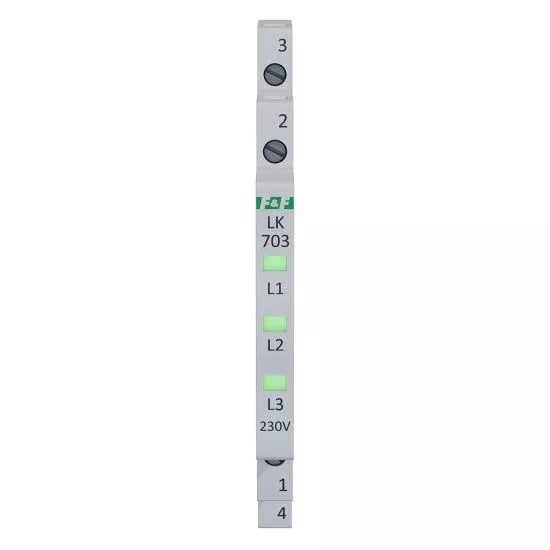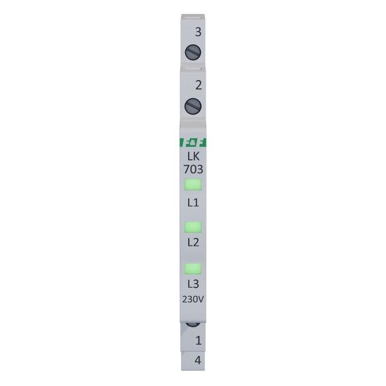 Napięcie zasilania 3×230 V+N Kontrola zasilania 3 x LED Kolory LED 3 x zielona Prąd znamionowy 1 mA/kanał Przyłącze zaciski śrubowe 2,5 mm² Moment dokręcający 0,4 Nm Pobór mocy 0,15 W/kanał Temperatura pracy -30÷50°C Wymiary 1/3 modułu (6,2 mm) Montaż na szynie 35 mm Stopień ochrony IP20