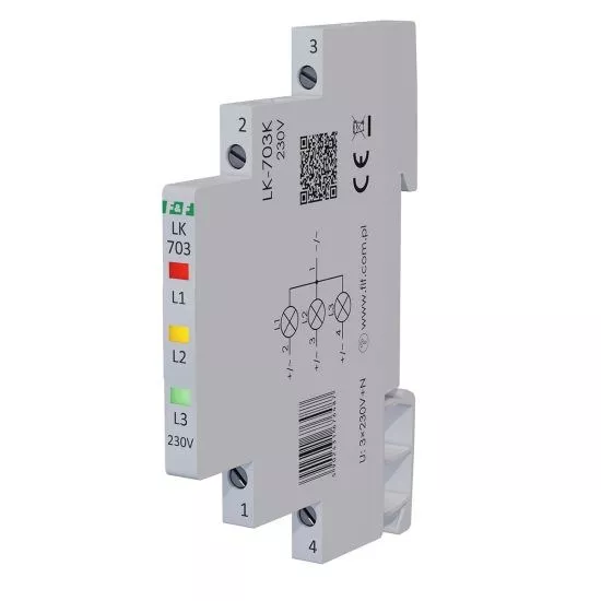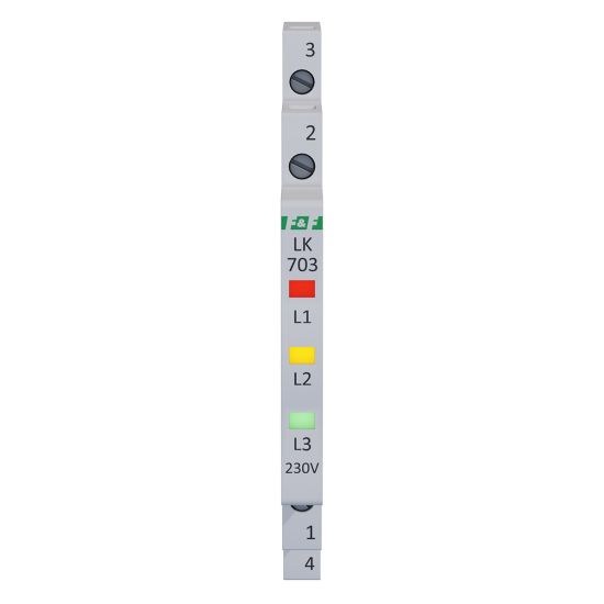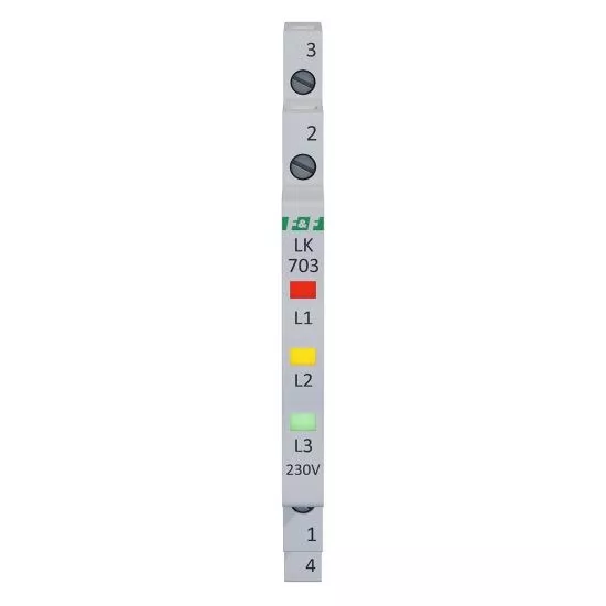 Napięcie zasilania 3×24 V+N; 3×110 V+N; 3×230 V+N Kontrola zasilania 3 x LED Kolory LED 3 x zielona; 3 x czerwona; 3 x żółta; czerwona-żółta-zielona; Prąd znamionowy 1 mA/kanał Przyłącze zaciski śrubowe 2,5 mm² Moment dokręcający 0,4 Nm Pobór mocy 0,15 W/kanał Temperatura pracy -30÷50°C Wymiary 1/3 modułu (6,2 mm) Montaż na szynie 35 mm Stopień ochrony IP20