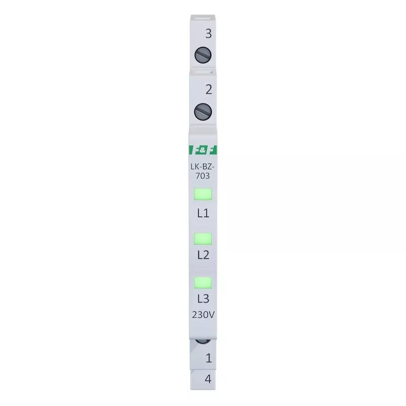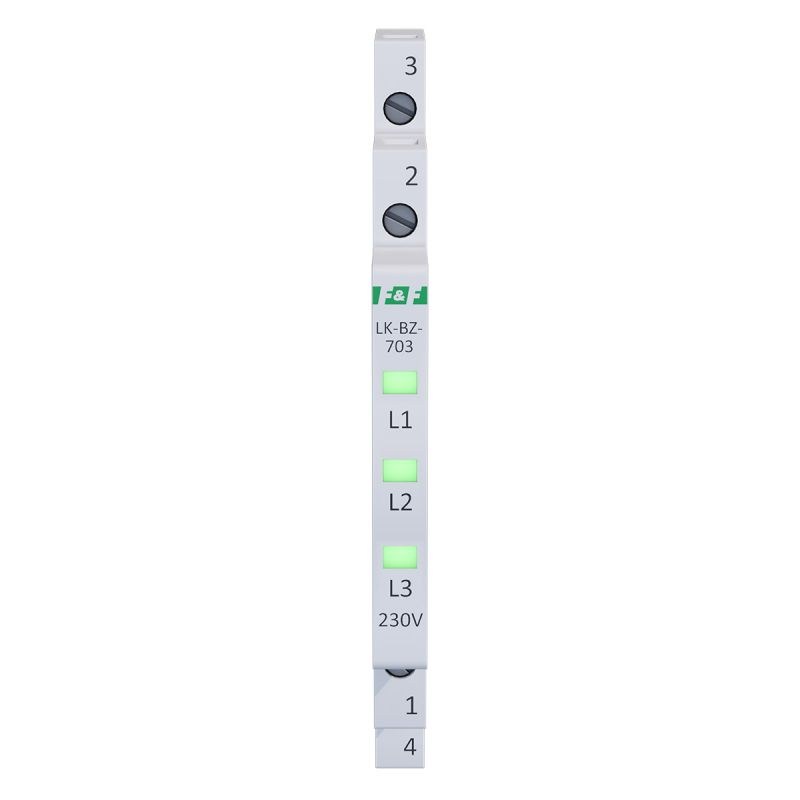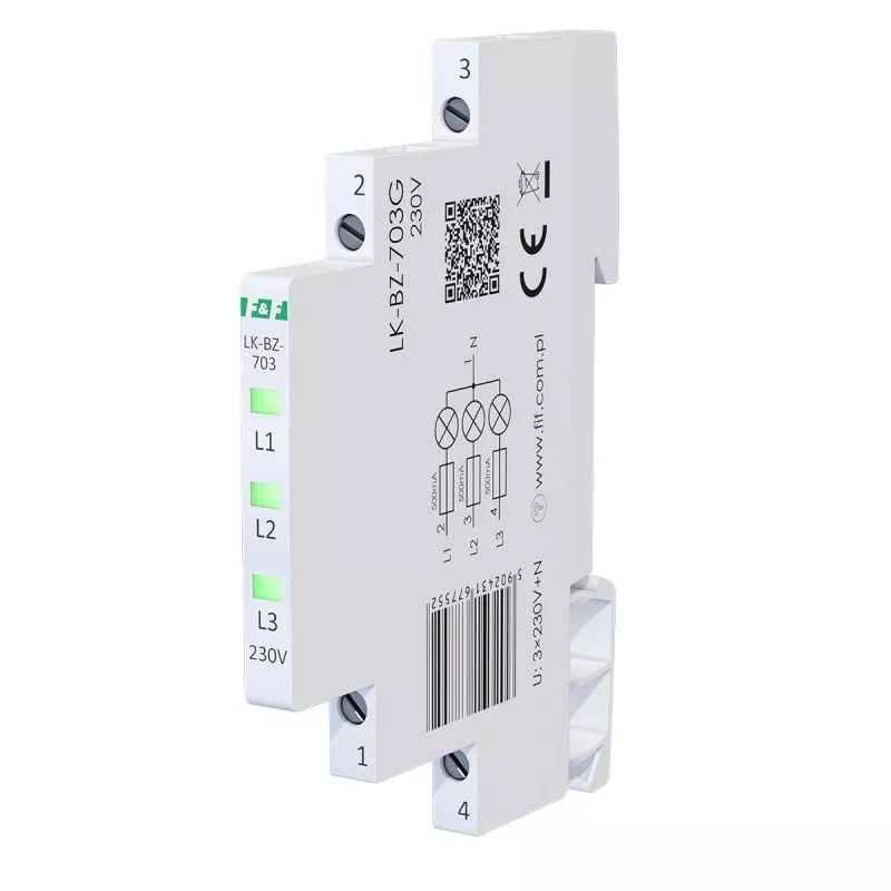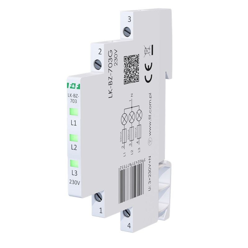 Napięcie zasilania 3×230 V+N Kontrola zasilania 3 x LED Kolory LED 3 x zielona Prąd znamionowy 1 mA/kanał Przyłącze zaciski śrubowe 2,5 mm² Moment dokręcający 0,4 Nm Pobór mocy 0,15 W/kanał Rodzaj bezpiecznika szybki bezpiecznik topikowy Bezpiecznik - prąd znamionowy 500 mA/kanał Bezpiecznik - zdolność wyłączania 100 A @250 V AC Temperatura pracy -30÷50°C Wymiary 1/3 modułu (6,2 mm) Montaż na szynie 35 mm Stopień ochrony IP20