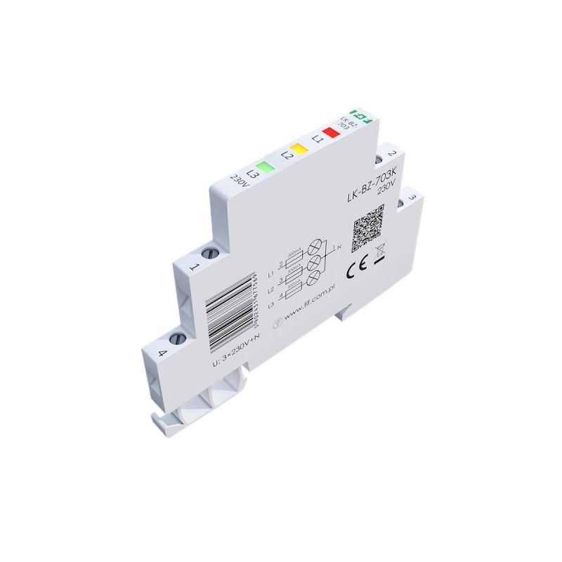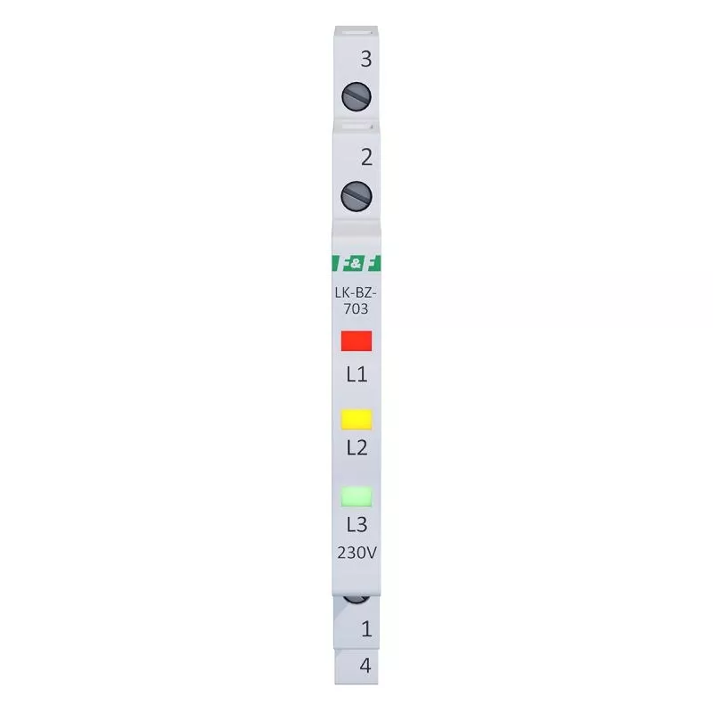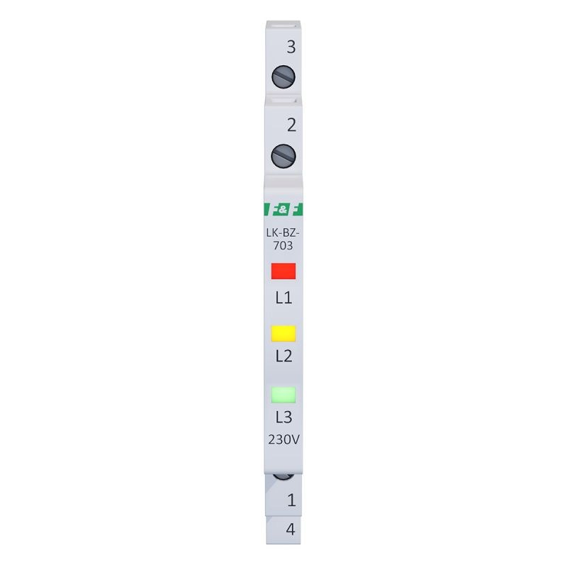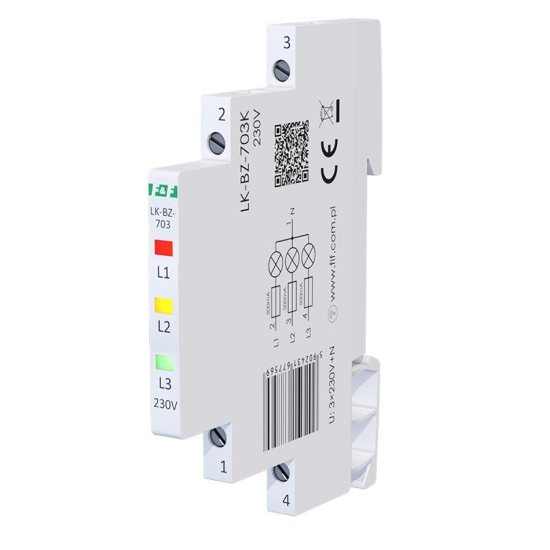Napięcie zasilania 3×230 V+N Kontrola zasilania 3 x LED Kolory LED żółta-czerwona-zielona Prąd znamionowy 1 mA/kanał Przyłącze zaciski śrubowe 2,5 mm² Moment dokręcający 0,4 Nm Pobór mocy 0,15 W/kanał Rodzaj bezpiecznika szybki bezpiecznik topikowy Bezpiecznik - prąd znamionowy 500 mA/kanał Bezpiecznik - zdolność wyłączania 100 A @250 V AC Temperatura pracy -30÷50°C Wymiary 1/3 modułu (6,2 mm) Montaż na szynie 35 mm Stopień ochrony IP20