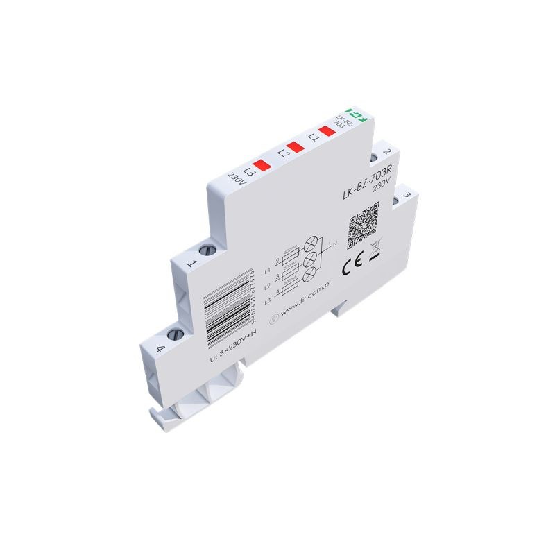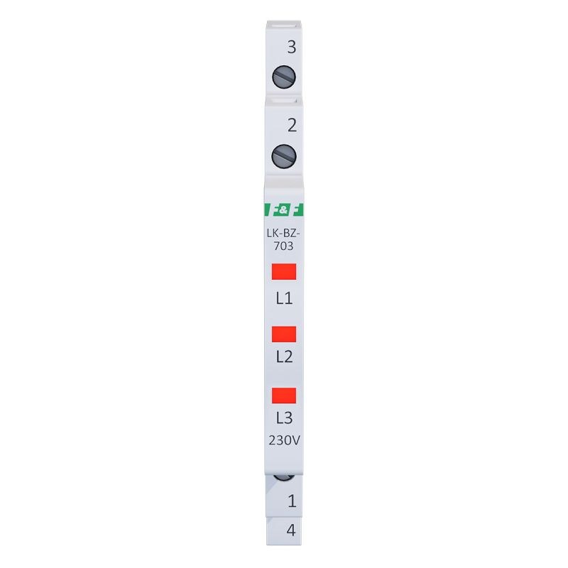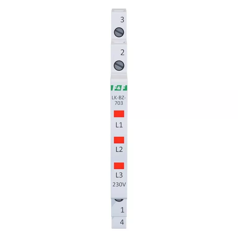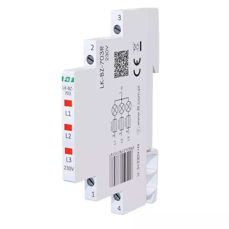 Napięcie zasilania 3×230 V+N Kontrola zasilania 3 x LED Kolory LED 3 x czerwona Prąd znamionowy 1 mA/kanał Przyłącze zaciski śrubowe 2,5 mm² Moment dokręcający 0,4 Nm Pobór mocy 0,15 W/kanał Rodzaj bezpiecznika szybki bezpiecznik topikowy Bezpiecznik - prąd znamionowy 500 mA/kanał Bezpiecznik - zdolność wyłączania 100 A @250 V AC Temperatura pracy -30÷50°C Wymiary 1/3 modułu (6,2 mm) Montaż na szynie 35 mm Stopień ochrony IP20
