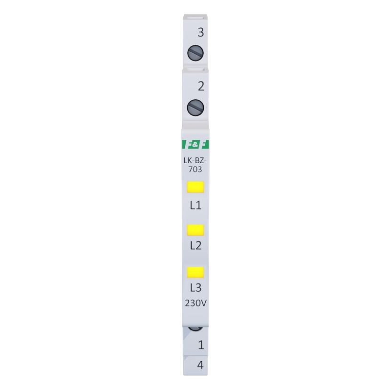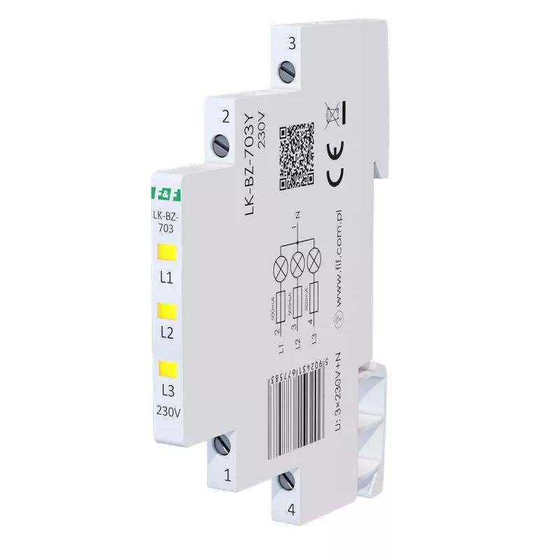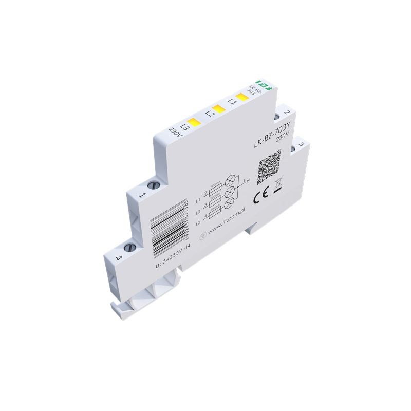 Napięcie zasilania 3×230 V+N Kontrola zasilania 3 x LED Kolory LED 3 x żółta Prąd znamionowy 1 mA/kanał Przyłącze zaciski śrubowe 2,5 mm² Moment dokręcający 0,4 Nm Pobór mocy 0,15 W/kanał Rodzaj bezpiecznika szybki bezpiecznik topikowy Bezpiecznik - prąd znamionowy 500 mA/kanał Bezpiecznik - zdolność wyłączania 100 A @250 V AC Temperatura pracy -30÷50°C Wymiary 1/3 modułu (6,2 mm) Montaż na szynie 35 mm Stopień ochrony IP20
