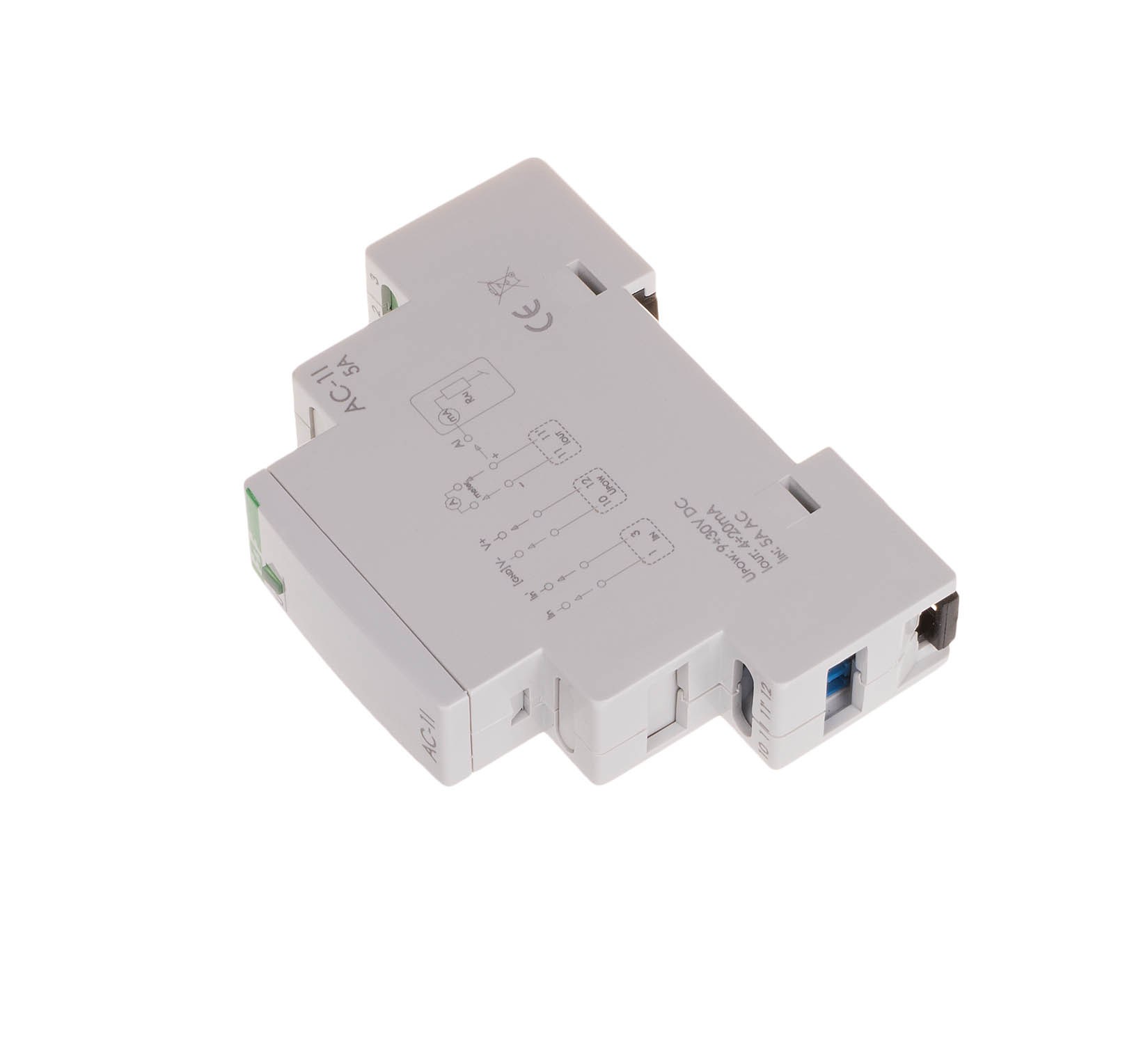 Napięcie zasilania 9÷30 V DC Napięcie przebicia WE-WY 2,1 kV Maksymalny błąd pomiarowy ±0,2 A Sygnał wyjściowy 4÷20 mA Błąd przetwarzania ±0,5% Długość przewodu wyjścia sygnałowego 300 m Zakres pomiarów TrueRMS/maksymalne napięcie 0÷15 A/285 V AC; 0÷20 A/400 V DC Dopuszczalne przeciążenie 100 A/100 ms Przyłącze zaciski śrubowe 2,5 mm² Moment dokręcający 0,4 Nm Pobór mocy 0,8 W Temperatura pracy -20÷50°C Wymiary 1 moduł (18 mm) Montaż na szynie 35 mm Stopień ochrony IP20