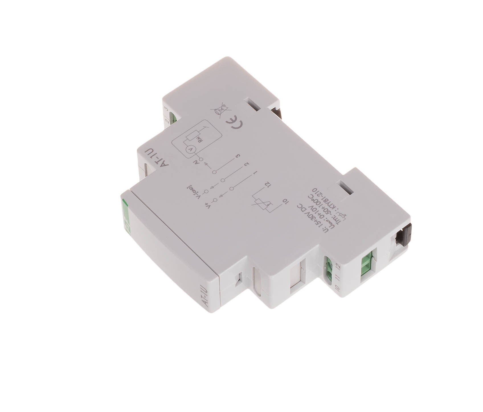 Napięcie zasilania 9÷30 V DC Zakres pomiarowy -50°С÷100°С Sonda temperatury RT/RT2 Maksymalny błąd pomiarowy ±1,5°С Sygnał wyjściowy 0÷10 V Błąd przetwarzania ±0,5% Długość przewodu wyjścia sygnałowego 20 m Przyłącze zaciski śrubowe 2,5 mm² Moment dokręcający 0,4 Nm Pobór mocy 0,8 W Temperatura pracy -20÷50°C Wymiary 1 moduł (18 mm) Montaż na szynie 35 mm Stopień ochrony IP20