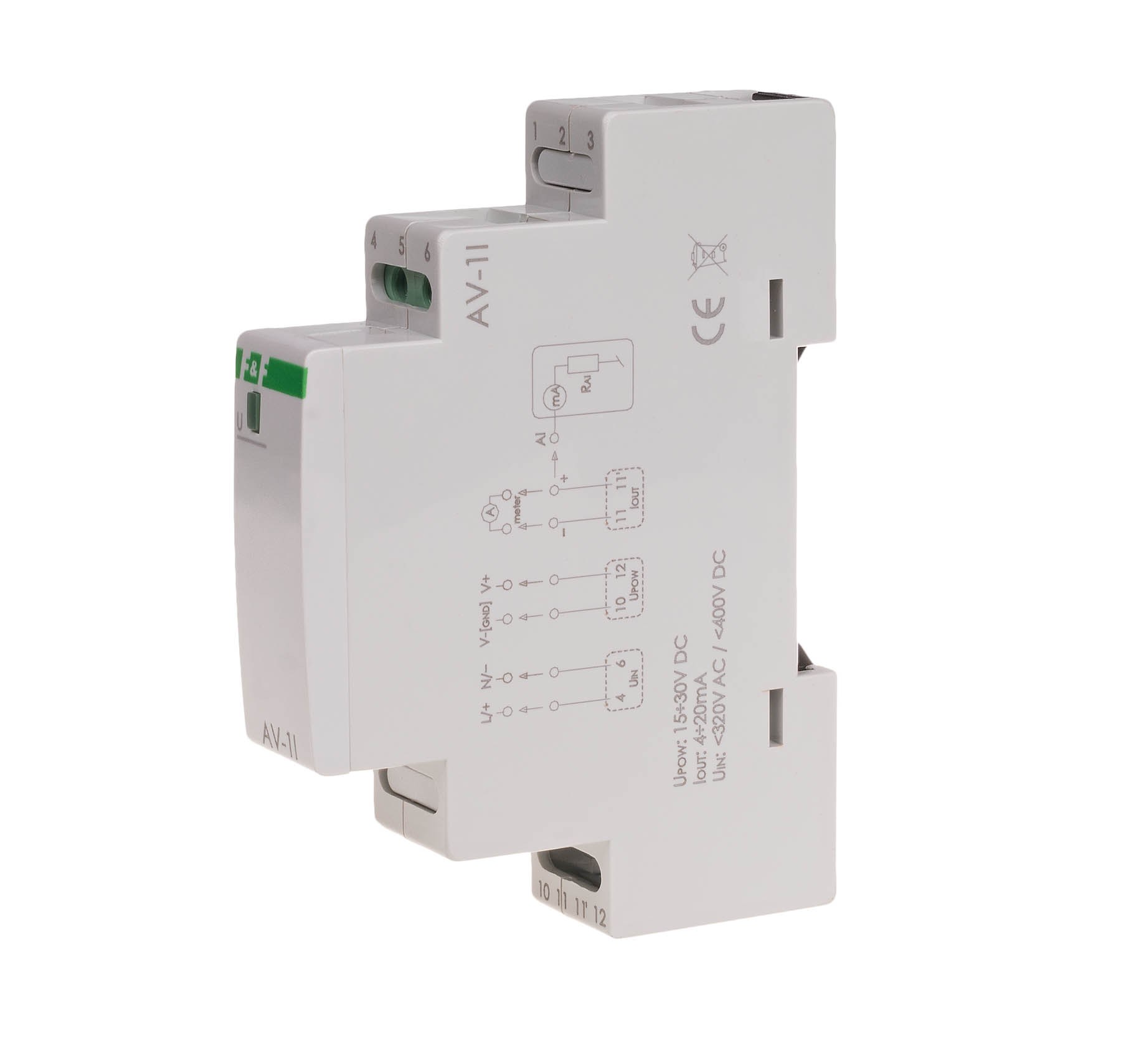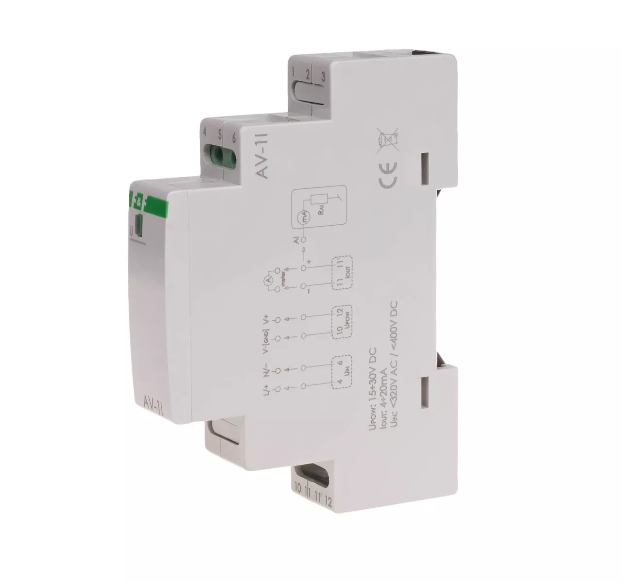 Napięcie zasilania 9÷30 V DC Napięcie maksymalne 320 V AC / 450 V DC Napięcie przebicia WE-WY 3 kV Maksymalny błąd pomiarowy ±0,5 V Sygnał wyjściowy 4÷20 mA Błąd przetwarzania ±0,5% Długość przewodu wyjścia sygnałowego 300 m Zakres pomiarów TrueRMS - napięcie przemienne AC 0÷285 V Zakres pomiarów TrueRMS - napięcie stałe DC 0÷400 V Przyłącze zaciski śrubowe 2,5 mm² Moment dokręcający 0,4 Nm Pobór mocy 0,8 W Temperatura pracy -20÷50°C Wymiary 1 moduł (18 mm) Montaż na szynie 35 mm Stopień ochrony IP20