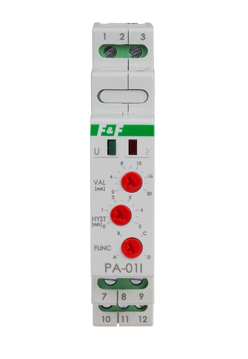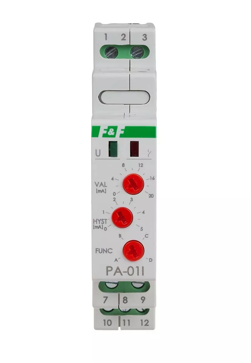 Opis produktu Przekaźnik analogowy z wejściem prądowym. Przekaźnik PA-01I przekształca sygnał analogowy 0÷20 mA/4÷20 mA na sygnał sterujący wyjściem przekaźnikowym. Umożliwia zastosowanie czujników z wyjściem analogowym w układach automatyki. Działanie przekaźnika analogowego z wejściem prądowym Przekaźnik analogowy z wejściem prądowym PA-01I dokonuje ciągłego pomiaru sygnału prądowego podłączonego do zacisków wejściowych (7-9) i na podstawie zmierzonej wartości oraz wybranego trybu pracy decyduje o załączeniu przekaźnika wykonawczego. Wejście pomiarowe jest odseparowane galwanicznie od zasilania urządzenia oraz styków wykonawczych dzięki czemu możliwe jest wpięcie PA-01I również w szereg z innymi odbiornikami 4÷20 mA. PA-01I pracować może w czterech różnych trybach wybieranych pokrętłem FUNC.