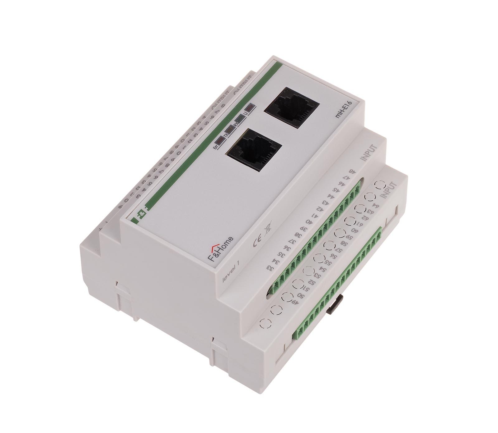 Moduł silnikowy mH-E16 dedykowany jest do sterowania wszelkimi odbiornikami silnikowymi. Nadaje się zarówno do sterowania roletami zewnętrznymi (antywłamaniowymi) zasilanymi silnikami 230V lub 24V, jak również żaluzjami pionowymi i poziomymi. Moduł montowany jest w rozdzielni i zajmuje pole 6 modułów i zasilany jest napięciem 24VDC. Do wejść modułu sprowadzane są przyciski rozlokowane na budynku, podłączona za pomocą przewodów typu UTP. Moduł zarządza silnikami rolet lub żaluzji na zasadzie góra-dół (lub prawo-lewo) za pośrednictwem przekaźnikowych modułów wykonawczych typu mH-R8x8 lub mH-R2x16. Sterowanie odbywa się w pełni po linii niskiego napięcia 24V, co zapewnia pełne bezpieczeństwo i możliwość dowolnego rozmieszczenia przycisków sterujących w budynku. Moduł mH-E16 komunikuje się z panelami dotykowymi poprzez linię CAN. Dowolne wyjście modułu może być wyzwolone z poziomu paneli dotykowych poprzez wybranie konkretnego urządzenia lub sceny (grupy urządzeń). Z poziomu panelu dotykowego istnieje możliwość zaprogramowania czasowego samoczynnego załączania/wyłączania urządzeń lub grup urządzeń sterowanych z modułu wejść/wyjść. W przypadku potrzeby stosowania większej ilości wejść/wyjść można zastosować kilka modułów silnikowych, przy czym należy pamiętać że muszą to być moduły kolejnych poziomów (mH-E16 – poziom 1, mH-E16-poziom 2…). Wejścia/wyjścia Wejścia modułu mH-E16 przystosowane są do podłączenia łączników monostabilnych (dzwonkowych) zasilanych napięciem bezpiecznym 24V. Do sterowania każdego z silników przeznaczone są dwa wejścia (góra/dół lub lewo/prawo). Wyzwolenie wejścia następuje w momencie zamknięcia łącznika i podania +24V na wejście modułu. Wyjścia modułu mH-E16 przystosowane są do współpracy z modułami wyjść przekaźnikowych typu mH-R8x8 lub mHR2x16. Dobór ilości oraz rodzaju modułów przekaźnikowych zależny jest od ilości i wielkości obciążenia odbiorników. Oprogramowanie modułu uniemożliwia jednoczesne załączenie napędów na ruch w obu kierunkach. Moduł mH-E16 oferowany jest w wykonaniu na różne poziomy, umożliwiając w ten sposób rozbudowę sieci wejść/wyjść podłączonych do systemu F&Home. W pierwszej kolejności należy instalować moduł z poziomu 1, następnie z poziomu 2, itd. Każdy z poziomów charakteryzuje się oddzielną numeracją, dzięki czemu zapewniony jest łatwiejszy montaż instalacji. Zestawienie wejść/wyjść dla modułu mH-E16 przedstawione jest w poniższej tabeli. Zasada działania Wejścia modułu podzielone są na pary umożliwiające sterowanie kolejnymi silnikami podłączonym poprzez moduły przekaźnikowe. Wyzwolenie wejścia powoduje załączenie wyjścia odpowiadającego wyzwolonemu wejściu tak długo, jak długo wyzwolone będzie wejście. W oprogramowaniu sterownika zdefiniowany jest maksymalny czas załączenia napędu, jego przekroczenie spowoduje zatrzymanie silnika pomimo zamkniętego łącznika. Wyjścia umożliwiają załączanie poprzez moduły przekaźnikowe mH-R8x8 lub mH-R2x16 obwodów silnikowych. Dla każdego silnika przewidziane są dwa przekaźniki umożliwiające realizację ruchu w dwóch kierunkach, przy czym oprogramowanie modułu uniemożliwia jednoczesne wymuszenie ruchu w dwóch kierunkach. Wyjścia mogą być wyzwalane lokalnie i wtedy przekaźniki załączony będzie tak długo jak załączony będzie łącznik na wejściu (przy czym narzucone jest ograniczenie w postaci maksymalnego czasu załączenia silnika. Dodatkowo wyjścia mogą być wyzwalane zdalnie z panelu dotykowego i wtedy przekaźnik załączany jest na zdefiniowany okres czasu.