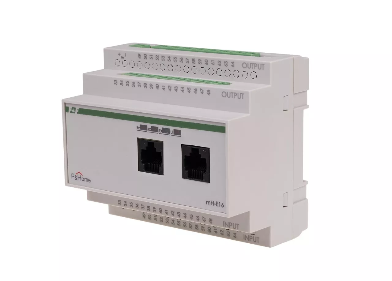 Moduł mieszany mH-IO12E6 dedykowany jest do sterowania zarówno oświetleniem (lub innymi odbiornikami działającymi na zasadzie włącz/wyłącz), oraz odbiornikami silnikowymi (nadaje się zarówno do sterowania roletami zewnętrznymi, jak również żaluzjami pionowymi i poziomymi). Moduł montowany jest w rozdzielni, zajmuje pole 6 modułów i zasilany jest napięciem 24VDC. Do wejść modułu przewodami typu UTP sprowadzane są przyciski rozlokowane na budynku. Moduł zarządza załączaniem oświetlenia lub silnikami za pośrednictwem przekaźnikowych modułów wykonawczych typu mH-R8x8 lub mH-R2x16. Sterowanie odbywa się w pełni po linii niskiego napięcia 24V, co zapewnia pełne bezpieczeństwo i możliwość dowolnego rozmieszczenia przycisków sterujących w budynku. Moduł mH-IO12E6 komunikuje się z panelami dotykowymi poprzez linię CAN. Dowolne wyjście modułu może być wyzwolone z poziomu paneli dotykowych poprzez wybranie konkretnego urządzenia lub sceny (grupy urządzeń). Z poziomu panelu dotykowego istnieje możliwość zaprogramowania czasowego samoczynnego załączania/wyłączania urządzeń lub grup urządzeń sterowanych z modułu wejść/wyjść. W przypadku potrzeby stosowania większej ilości wejść/wyjść można zastosować kilka modułów mieszanych, przy czym należy pamiętać że muszą to być moduły kolejnych poziomów (mH-IO12E6 – poziom 1, mH-IO12E6-poziom 2, …). Wejścia/wyjścia Wejścia modułu mH-IO12E6 przystosowane są do podłączenia zarówno łączników monostabilnych (dzwonkowych) jak i bistabilnych zasilanych napięciem bezpiecznym 24V. Jednakże do obsługi wejść silnikowych zaleca się stosowanie łączników monostabilnych. Wyzwolenie wejścia następuje w momencie zamknięcia łącznika i podania +24V na wejście modułu. Wyjścia modułu mH-IO12E6 przystosowane są do współpracy z modułami wyjść przekaźnikowych typu mH-R8x8 lub mH-R2x16. Dobór ilości oraz rodzaju modułów przekaźnikowych zależny jest od ilości i wielkości obciążenia odbiorników. Moduł mH-IO12E6 oferowany jest w wykonaniu na różne poziomy, umożliwiając w ten sposób rozbudowę sieci wejść/wyjść podłączonych do systemu F&Home. W pierwszej kolejności należy instalować moduł z poziomu 1, następnie z poziomu 2, itd. Każdy z poziomów charakteryzuje się oddzielną numeracją, dzięki czemu zapewniony jest łatwiejszy montaż instalacji. Zasada działania Wejścia. Wyzwolenie wejścia z funkcją bezpośredniej zmiany stanu wyjścia (wejście 1-27) powoduje zmianę na przeciwnym stanu wyjścia o tym samym numerze co wyzwolone wejście. Na przykład pierwsze wyzwolenie wejścia numer 1 spowoduje załączenie wyjścia numer 1, drugie wyzwolenie – wyłączenie wyjścia, a kolejne wyzwolenie – ponowne załączenie. W module na poziomie pierwszym znajduje się specjalne dedykowane wejście 28 Wyłącz wszystko umożliwiające wyłączenie za pomocą jednego przycisku wszystkich obwodów. Cztery ostatnie wejścia modułu (29-32) przeznaczone są do sterowania poprzez sieć CAN modułem ściemniacza typu mH-L4 (ważne jest aby moduł ściemniacza był na tym samym poziomie co moduł IO). W takim wypadku działanie wejść ściemniających jest następujące: krótkie wyzwolenie wejścia spowoduje pełne załączenie oświetlenia (lub pełne wyłączenie gdy światło jest włączone). W przypadku dłuższego wyzwolenia następuje zmiana jasności oświetlenia związanego z wyzwolonym wejściem w pętli rozjaśniania do pełnej jasności - ściemnianie aż do wyłączenia – rozjaśnianie do pełnej jasności. Wejścia silnikowe modułu podzielone są na pary umożliwiające sterowanie kolejnymi silnikami podłączonym poprzez moduły przekaźnikowe. Wyzwolenie wejścia powoduje załączenie wyjścia odpowiadającego wyzwolonemu wejściu tak długo jak długo wyzwolone będzie wejście. W oprogramowaniu sterownika zdefiniowany jest maksymalny czas załączenia napędu, jego przekroczenie spowoduje zatrzymanie silnika pomimo zamkniętego łącznika. Wyjścia umożliwiają poprzez moduły przekaźnikowe mH-R8x8 lub mH-R2x16 załączanie obwodów oświetleniowych (lub innych działających na zasadzie włącz/wyłącz). Stan wyjść 1-28 (lub 27 wejść dla poziomu 1) oraz 33-44 może być ustawiony lokalnie poprzez wyzwolenie odpowiednich wejść modułu, lub zdalnie z poziomu nadrzędnego komputera z panelem dotykowym. Pozostałe wyjścia, czyli 28-32, mogą być ustawiane wyłącznie zdalnie poprzez nadrzędny komputer z panelem dotykowym.