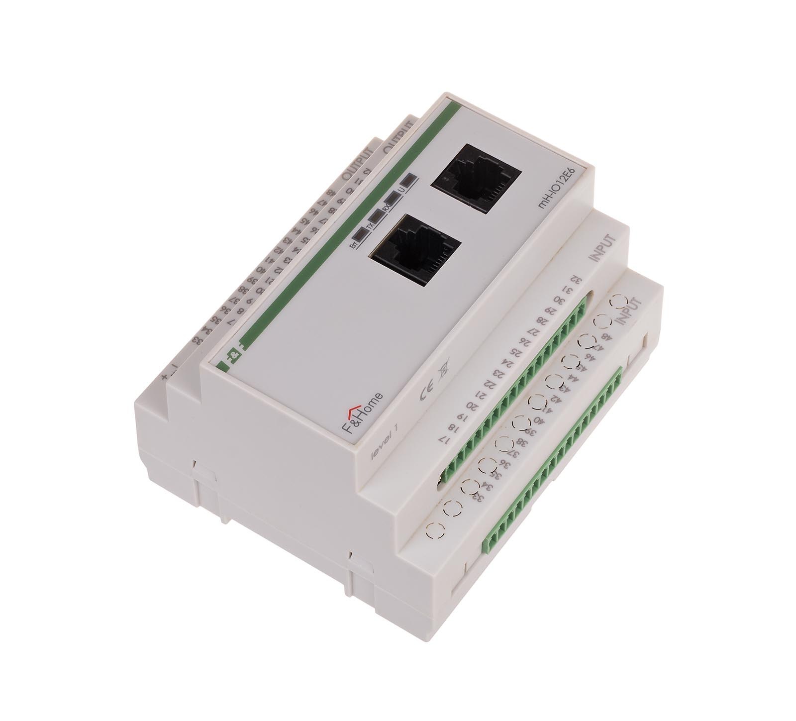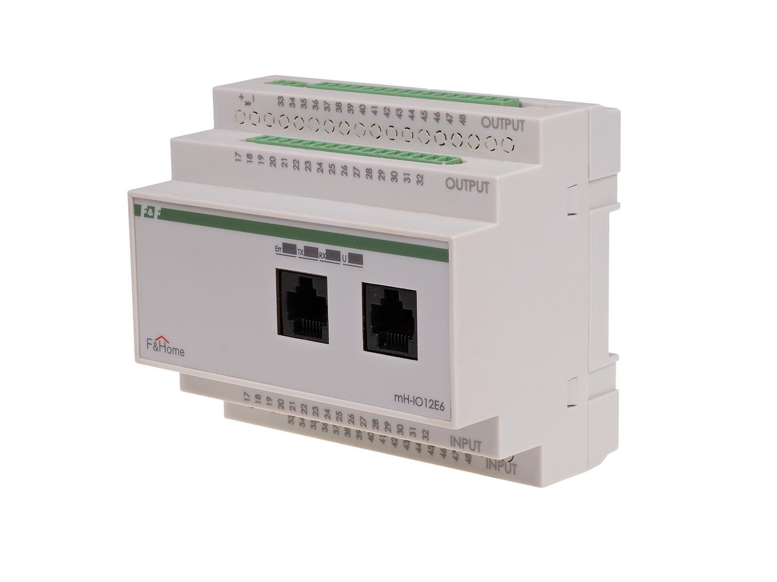 Moduł mieszany mH-IO12E6 dedykowany jest do sterowania zarówno oświetleniem (lub innymi odbiornikami działającymi na zasadzie włącz/wyłącz), oraz odbiornikami silnikowymi (nadaje się zarówno do sterowania roletami zewnętrznymi, jak również żaluzjami pionowymi i poziomymi). Moduł montowany jest w rozdzielni, zajmuje pole 6 modułów i zasilany jest napięciem 24VDC. Do wejść modułu przewodami typu UTP sprowadzane są przyciski rozlokowane na budynku. Moduł zarządza załączaniem oświetlenia lub silnikami za pośrednictwem przekaźnikowych modułów wykonawczych typu mH-R8x8 lub mH-R2x16. Sterowanie odbywa się w pełni po linii niskiego napięcia 24V, co zapewnia pełne bezpieczeństwo i możliwość dowolnego rozmieszczenia przycisków sterujących w budynku. Moduł mH-IO12E6 komunikuje się z panelami dotykowymi poprzez linię CAN. Dowolne wyjście modułu może być wyzwolone z poziomu paneli dotykowych poprzez wybranie konkretnego urządzenia lub sceny (grupy urządzeń). Z poziomu panelu dotykowego istnieje możliwość zaprogramowania czasowego samoczynnego załączania/wyłączania urządzeń lub grup urządzeń sterowanych z modułu wejść/wyjść. W przypadku potrzeby stosowania większej ilości wejść/wyjść można zastosować kilka modułów mieszanych, przy czym należy pamiętać że muszą to być moduły kolejnych poziomów (mH-IO12E6 – poziom 1, mH-IO12E6-poziom 2, …). Wejścia/wyjścia Wejścia modułu mH-IO12E6 przystosowane są do podłączenia zarówno łączników monostabilnych (dzwonkowych) jak i bistabilnych zasilanych napięciem bezpiecznym 24V. Jednakże do obsługi wejść silnikowych zaleca się stosowanie łączników monostabilnych. Wyzwolenie wejścia następuje w momencie zamknięcia łącznika i podania +24V na wejście modułu. Wyjścia modułu mH-IO12E6 przystosowane są do współpracy z modułami wyjść przekaźnikowych typu mH-R8x8 lub mH-R2x16. Dobór ilości oraz rodzaju modułów przekaźnikowych zależny jest od ilości i wielkości obciążenia odbiorników. Moduł mH-IO12E6 oferowany jest w wykonaniu na różne poziomy, umożliwiając w ten sposób rozbudowę sieci wejść/wyjść podłączonych do systemu F&Home. W pierwszej kolejności należy instalować moduł z poziomu 1, następnie z poziomu 2, itd. Każdy z poziomów charakteryzuje się oddzielną numeracją, dzięki czemu zapewniony jest łatwiejszy montaż instalacji. Zasada działania Wejścia. Wyzwolenie wejścia z funkcją bezpośredniej zmiany stanu wyjścia (wejście 1-27) powoduje zmianę na przeciwnym stanu wyjścia o tym samym numerze co wyzwolone wejście. Na przykład pierwsze wyzwolenie wejścia numer 1 spowoduje załączenie wyjścia numer 1, drugie wyzwolenie – wyłączenie wyjścia, a kolejne wyzwolenie – ponowne załączenie. W module na poziomie pierwszym znajduje się specjalne dedykowane wejście 28 Wyłącz wszystko umożliwiające wyłączenie za pomocą jednego przycisku wszystkich obwodów. Cztery ostatnie wejścia modułu (29-32) przeznaczone są do sterowania poprzez sieć CAN modułem ściemniacza typu mH-L4 (ważne jest aby moduł ściemniacza był na tym samym poziomie co moduł IO). W takim wypadku działanie wejść ściemniających jest następujące: krótkie wyzwolenie wejścia spowoduje pełne załączenie oświetlenia (lub pełne wyłączenie gdy światło jest włączone). W przypadku dłuższego wyzwolenia następuje zmiana jasności oświetlenia związanego z wyzwolonym wejściem w pętli rozjaśniania do pełnej jasności - ściemnianie aż do wyłączenia – rozjaśnianie do pełnej jasności. Wejścia silnikowe modułu podzielone są na pary umożliwiające sterowanie kolejnymi silnikami podłączonym poprzez moduły przekaźnikowe. Wyzwolenie wejścia powoduje załączenie wyjścia odpowiadającego wyzwolonemu wejściu tak długo jak długo wyzwolone będzie wejście. W oprogramowaniu sterownika zdefiniowany jest maksymalny czas załączenia napędu, jego przekroczenie spowoduje zatrzymanie silnika pomimo zamkniętego łącznika. Wyjścia umożliwiają poprzez moduły przekaźnikowe mH-R8x8 lub mH-R2x16 załączanie obwodów oświetleniowych (lub innych działających na zasadzie włącz/wyłącz). Stan wyjść 1-28 (lub 27 wejść dla poziomu 1) oraz 33-44 może być ustawiony lokalnie poprzez wyzwolenie odpowiednich wejść modułu, lub zdalnie z poziomu nadrzędnego komputera z panelem dotykowym. Pozostałe wyjścia, czyli 28-32, mogą być ustawiane wyłącznie zdalnie poprzez nadrzędny komputer z panelem dotykowym.