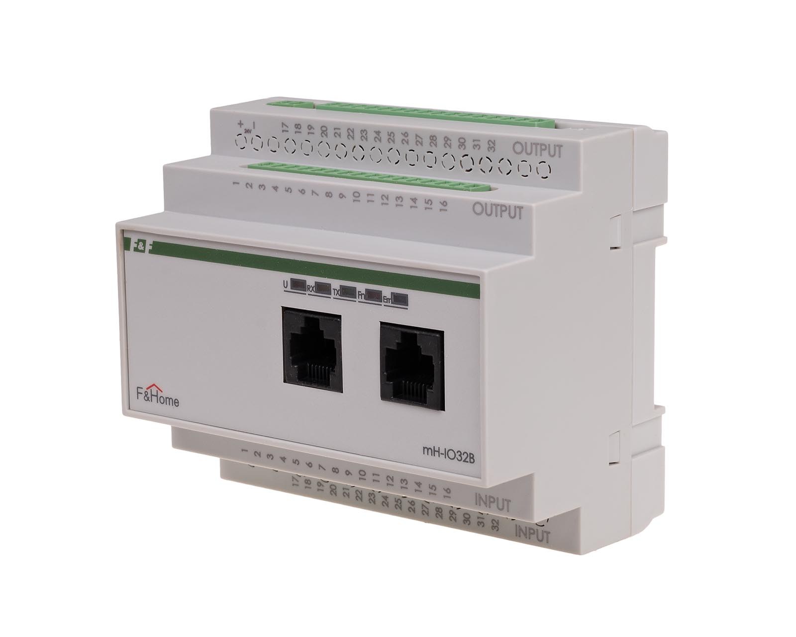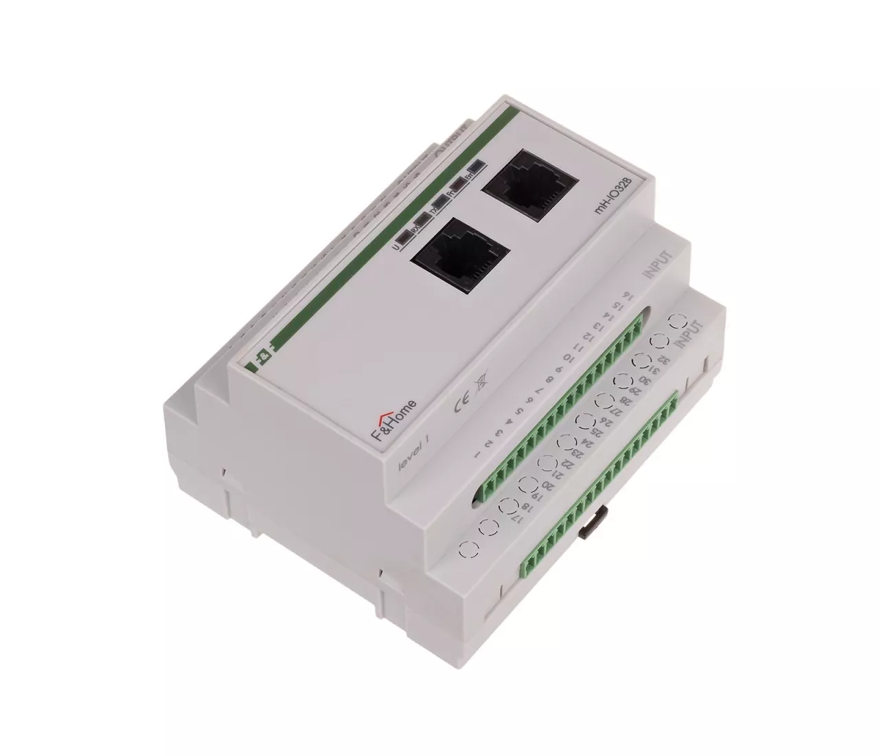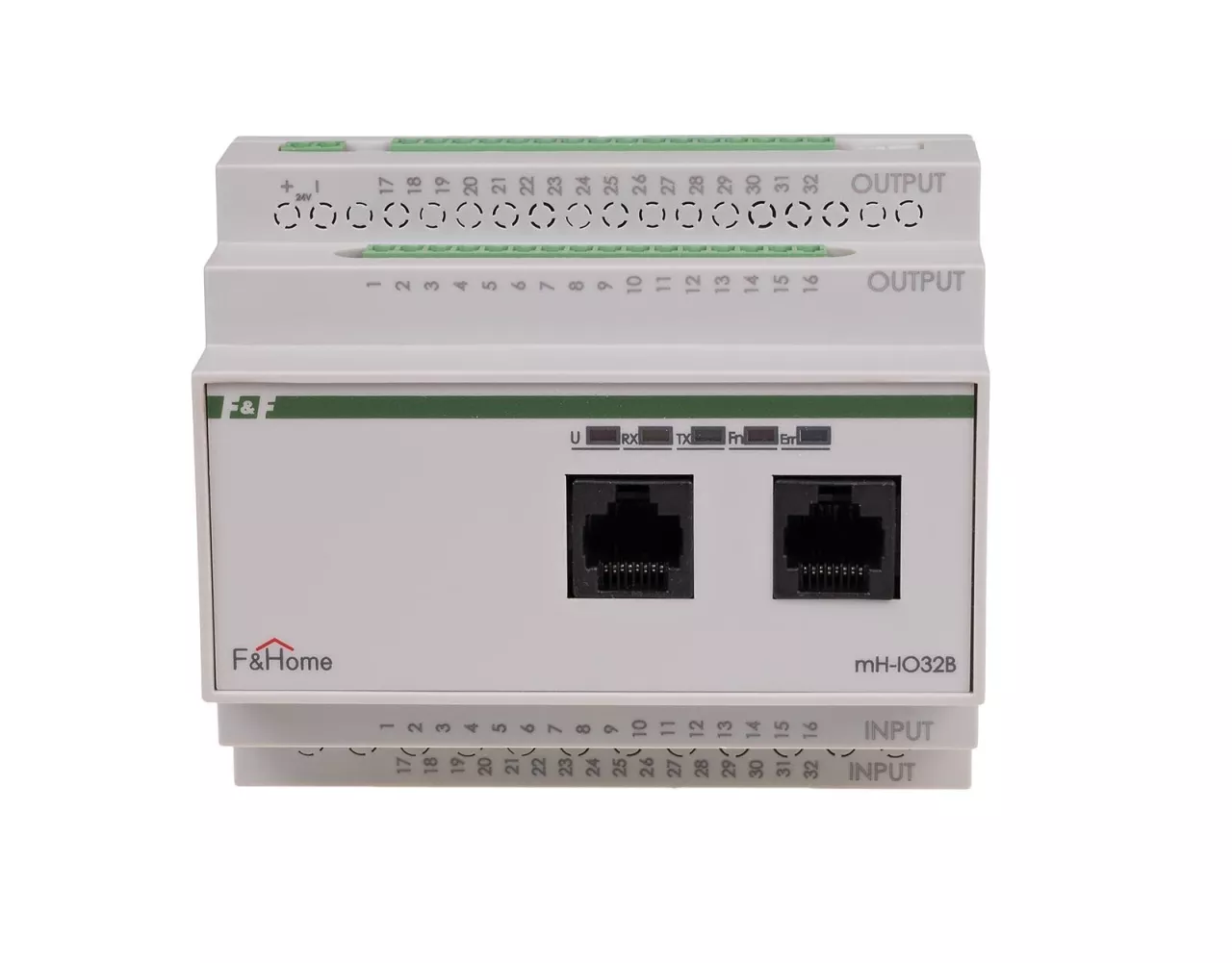 Moduł wejść/wyjść mH-IO32 jest podstawowym modułem systemu F&Home wyposażonym w 32 wejścia i 32 wyjścia binarne (działające na zasadzie włącz-wyłącz). Moduł montowany jest w rozdzielni (zajmuje pole 6 modułów) i zasilany jest napięciem stałym 24V. Do wejść modułu sprowadzane są przyciski rozlokowane na budynku, podłączone za pomocą przewodów typu UTP. Moduł zarządza oświetleniem i innymi odbiornikami na zasadzie włącz-wyłącz za pośrednictwem przekaźnikowych modułów wykonawczych typu mH-R8x8 lub mH-R2x16. Sterowanie odbywa się w pełni po linii niskiego napięcia 24V, co zapewnia pełne bezpieczeństwo i możliwość dowolnego rozmieszczenia przycisków sterujących w budynku. Moduł mH-IO32 komunikuje się z panelami dotykowymi poprzez linię CAN. Dowolne wyjście modułu może być wyzwolone z poziomu paneli dotykowych poprzez wybranie konkretnego urządzenia lub sceny (grupy urządzeń). Z poziomu panela dotykowego istnieje możliwość zaprogramowania czasowego samoczynnego załączania/wyłączania urządzeń lub grup urządzeń sterowanych z modułu wejść/wyjść. Dodatkowo cztery wejścia modułu dedykowane są do sterowania poprzez sieć CAN pracą modułu ściemniaczy oświetlenia typu mH-LH4. W przypadku potrzeby stosowania większej ilości wejść/wyjść można zastosować kilka modułów IO, przy czym należy pamiętać że muszą to być moduły kolejnych poziomów (mH-IO32 – poziom 1, mH-IO32-poziom 2…). Wejścia / wyjścia Wejścia modułu mH-IO32 przystosowane są do podłączenia łączników monostabilnych (dzwonkowych) lub bistabilnych zasilanych napięciem bezpiecznym 24V. Wyzwolenie wejścia następuje w momencie zamknięcia łącznika i podania +24V na wejście modułu. Wyjścia modułu mH-IO32 przystosowane są do współpracy z modułami wyjść przekaźnikowych typu mH-R8x8 lub mHR2x16. Dobór ilości oraz rodzaju modułów przekaźnikowych zależny jest od ilości i wielkości obciążenia odbiorników. Moduł mH-IO32 oferowany jest w wykonaniu na różne poziomy, umożliwiając w ten sposób rozbudowę sieci wejść/wyjść podłączonych do systemu F&Home. W pierwszej kolejności należy instalować moduł z poziomu 1, następnie z poziomu 2, itd. Każdy z poziomów charakteryzuje się oddzielną numeracją, dzięki czemu zapewniony jest łatwiejszy montaż instalacji. Zasada działania Wyzwolenie wejścia z funkcją bezpośredniej zmiany stanu wyjścia (wejście 1-27) powoduje zmianę na przeciwnym stanu wyjścia o tym samym numerze co wyzwolone wejście. Na przykład pierwsze wyzwolenie wejścia numer 1 spowoduje załączenie wyjścia numer 1, drugie wyzwolenie – wyłączenie wyjścia, a kolejne wyzwolenie – ponowne załączenie. W module na poziomie pierwszym znajduje się specjalne dedykowane wejście 28 Wyłącz wszystko umożliwiające wyłączenie za pomocą jednego przycisku wszystkich obwodów. Cztery ostatnie wejścia modułu (29-32) przeznaczone są do sterowania poprzez sieć CAN modułem ściemniacza typu mH-LH4 (ważne jest aby moduł ściemniacza był na tym samym poziomie co moduł IO). W takim wypadku działanie wejść ściemniających jest następujące: krótkie wyzwolenie wejścia spowoduje pełne załączenie oświetlenia (lub pełne wyłączenie gdy światło jest włączone). W przypadku dłuższego wyzwolenia następuje zmiana jasności oświetlenia związanego z wyzwolonym wejściem w pętli rozjaśniania do pełnej jasności - ściemnianie aż do wyłączenia – rozjaśnianie do pełnej jasności. Wyjścia umożliwiają poprzez moduły przekaźnikowe mH-R8x8 lub mH-R2x16 załączanie obwodów oświetleniowych (lub innych działających na zasadzie włącz/wyłącz). Stan pierwszych 28 (lub 27 wejść dla poziomu 1) może być ustawiony lokalnie poprzez wyzwolenie odpowiednich wejść modułu, lub zdalnie z poziomu nadrzędnego komputera z panelem dotykowym. Pozostałe wyjścia mogą być ustawiane wyłącznie zdalnie poprzez nadrzędny komputer z panelem dotykowym.