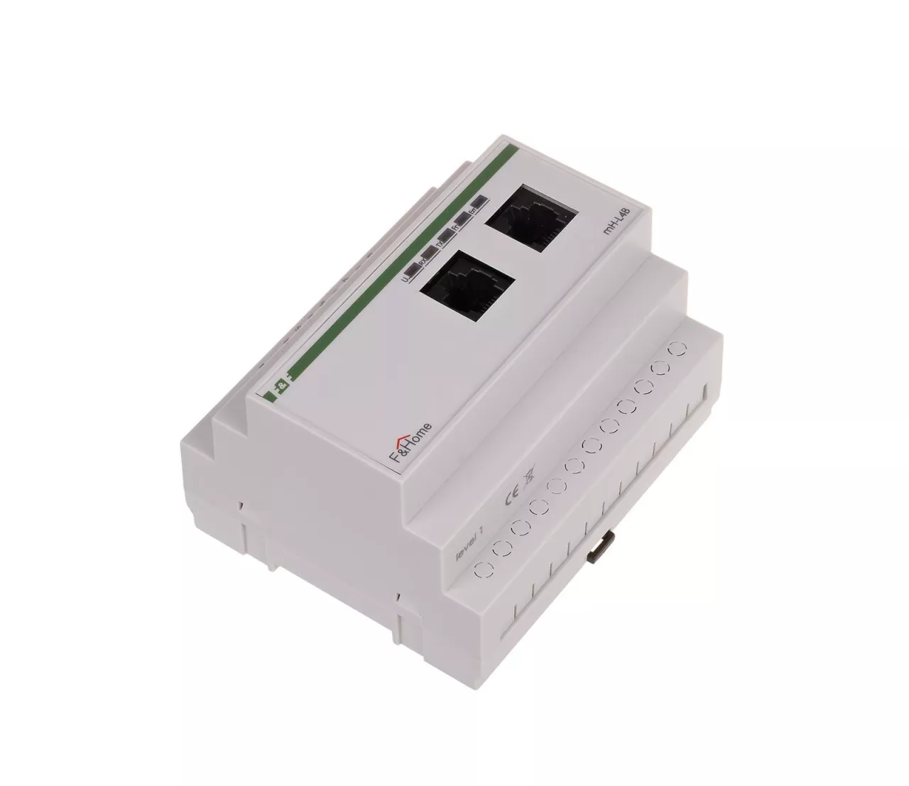 Moduł czterokanałowego (do czterech źródeł światła) ściemniacza dedykowany jest do współpracy z żarowymi i halogenowymi źródłami światła. W przypadku żarówek halogenowych zalecane jest stosowanie źródeł 230V. Moduł montowany jest w rozdzielni i zajmuje pole 5 modułów. Zasilany jest napięciem 230V z zastosowaniem dodatkowego filtru mH-SP w obwodzie zasilania, co poprawia stabilność świecenia źródeł światła. Ściemniacz pozwala na załączenie źródeł z dowolną jasnością, lub całkowite załączenie oświetlenia. Moduł komunikuje się z urządzeniami sterującymi poprzez sieć CAN, a samo sterowanie odbywa się z przycisków rozlokowanych w budynku (i podłączonych do modułów mH-IO32 lub mH-IO12E6) lub też poprzez panel dotykowy. Panel dotykowy można dodatkowo wykorzystać od zdefiniowania scen świetlnych, gdzie można ustawić jasność świecenia poszczególnych źródeł, jak i czasowe samoczynne załączanie/wyłączanie. W przypadku potrzeby stosowania większej ilości wejść/wyjść można zastosować kilka modułów ściemniaczy, przy czym należy pamiętać że muszą to być moduły kolejnych poziomów (mH-L4 – poziom 1, mH-L4-poziom 2…). Wejścia/wyjścia Moduł mH-L4 oferowany jest w wykonaniu na różne poziomy, umożliwiając w ten sposób rozbudowę sieci wejść/wyjść podłączonych do systemu F&Home. W pierwszej kolejności należy instalować moduł z poziomu 1, następnie z poziomu 2, itd. Każdy z poziomów charakteryzuje się oddzielną numeracją, dzięki czemu zapewniony jest łatwiejszy montaż instalacji. Zasada działania Źródła światła podłączone do modułu ściemniacza mH-L4 sterowane są wyłącznie poprzez sieć CAN. Sterowanie może odbywać się za pośrednictwem przycisków podłączonych do wejść modułów mH-IO32 oraz mH-IO12E6. Jeżeli ściemniacze wyzwalane są z przycisków, to krótkie naciśnięcie przycisku spowoduje pełne włączenie/wyłączenie źródła światła. W przypadku dłuższego wyzwolenia następuje zmiana jasności oświetlenia związanego z wyzwolonym wejściem w pętli rozjaśniania do pełnej jasności - ściemnianie aż do wyłączenia – rozjaśnianie do pełnej jasności. Jeżeli ściemniacz wyzwalany jest z panelu dotykowego, to panel decyduje o jasności i załączeniu źródła światła. Uwagi Należy pamiętać, że stosowanie kolejnego ściemniacza wiąże się z potrzebą zainstalowania kolejnego modułu sterującego mH-IO32 lub mH-IO12E6 o poziomie odpowiadającym poziomowi ściemniacza. Dla każdego zastosowanego ściemniacza należy zastosować oddzielny moduł filtra mH-SP.