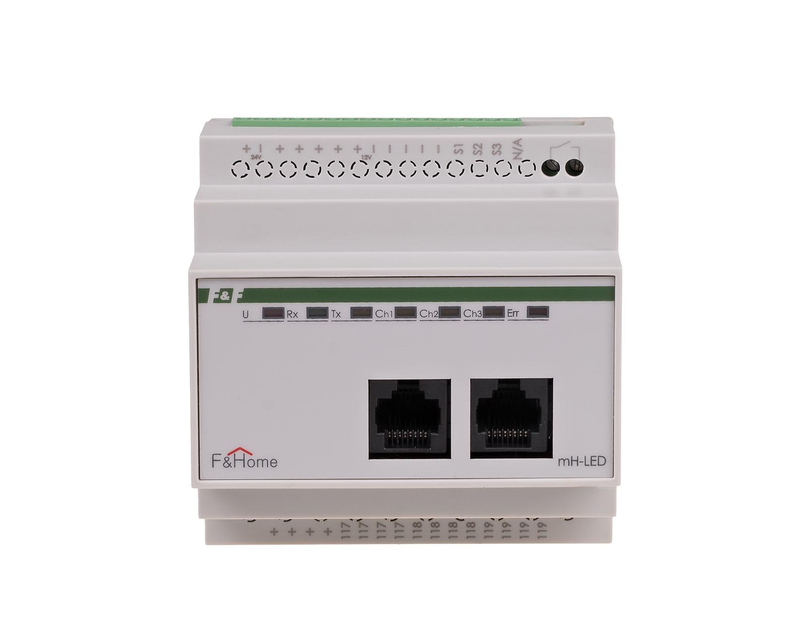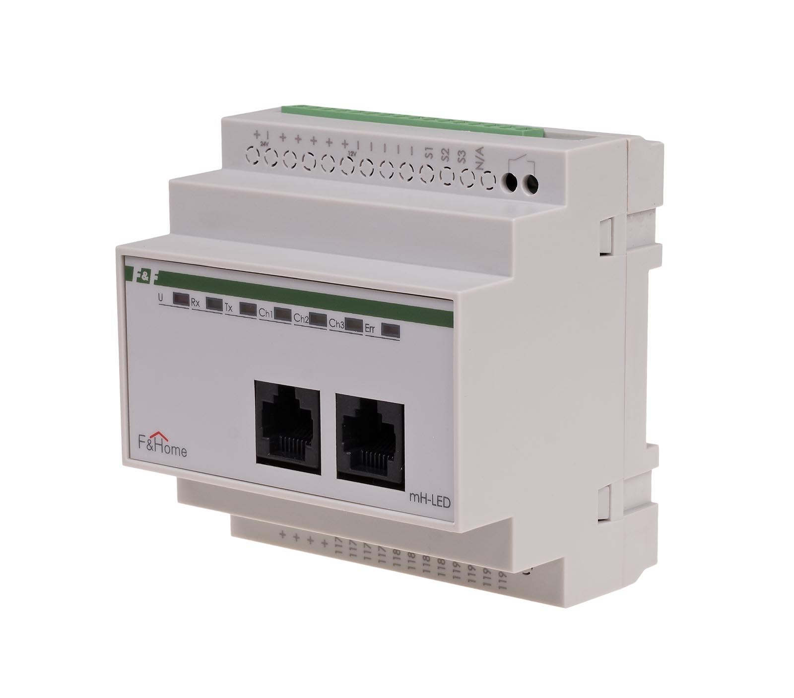 Opis produktu Trzykanałowy ściemniacz oświetlenia niskonapięciowego (12 V) LED- mH-LED Do modułu należy podłączyć źródła światła LED np. paski, węże jednobarwne. Moduł posiada trzy wejścia lokalne do podłączenia przycisków działających analogicznie jak w ściemniaczach (krótkie przyciśnięcie włącza-wyłącza, dłuższe przytrzymanie ściemnia-rozjaśnia). Istnieje możliwość sterowania każdym kanałem niezależnie za pomocą panela dotykowego. Moduł wymaga podłączenia niezależnego zasilacza 12 V DC o mocy dobranej do podłączonego obciążenia LED.