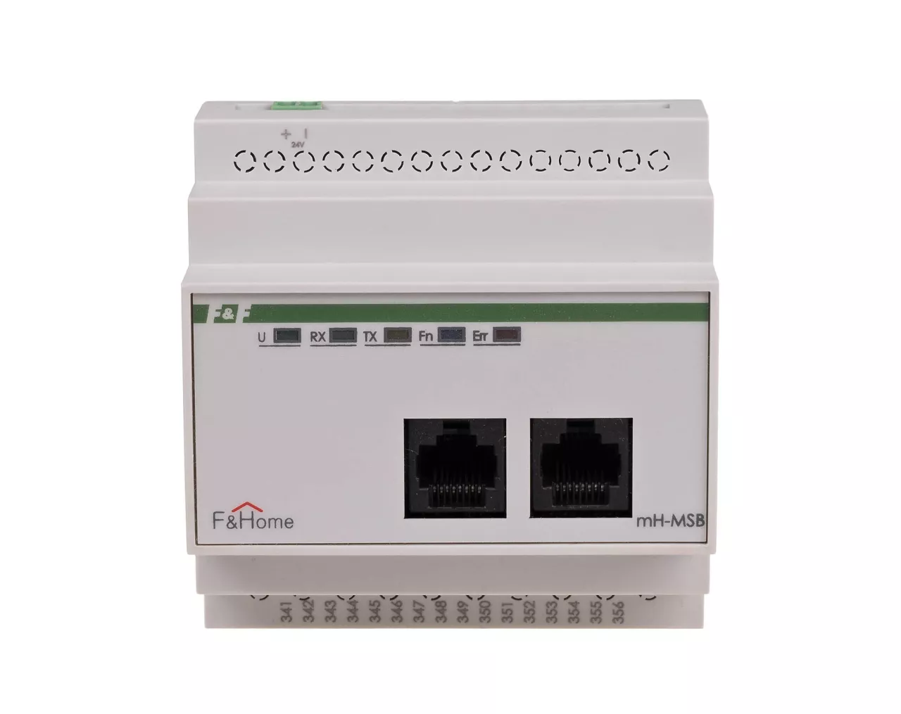 Moduł mH-MS jest szesnastokanałowym modułem wejściowym, do którego wejść podłączone są przyciski monostabilne (sterowanie impulsem jak w modułach IO). Do każdego z wejść użytkownik przypisuje dwie sceny zdefiniowane w panelu głównym systemu. Sterownik rozróżnia krótkie i długie naciśnięcie, a więc jednym przyciskiem możemy wywołać dwie różne sceny. Moduł scen jest zależny od panela systemowego i nie pracuje autonomicznie. Moduł zasilany jest napięciem 24V. Jeżeli w obiekcie wymagane jest sterowanie większą ilością scen (więcej niż 16) należy zastosować dodatkowe moduły scen w kolejnych poziomach.