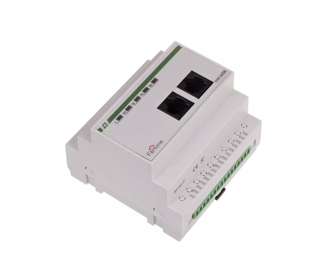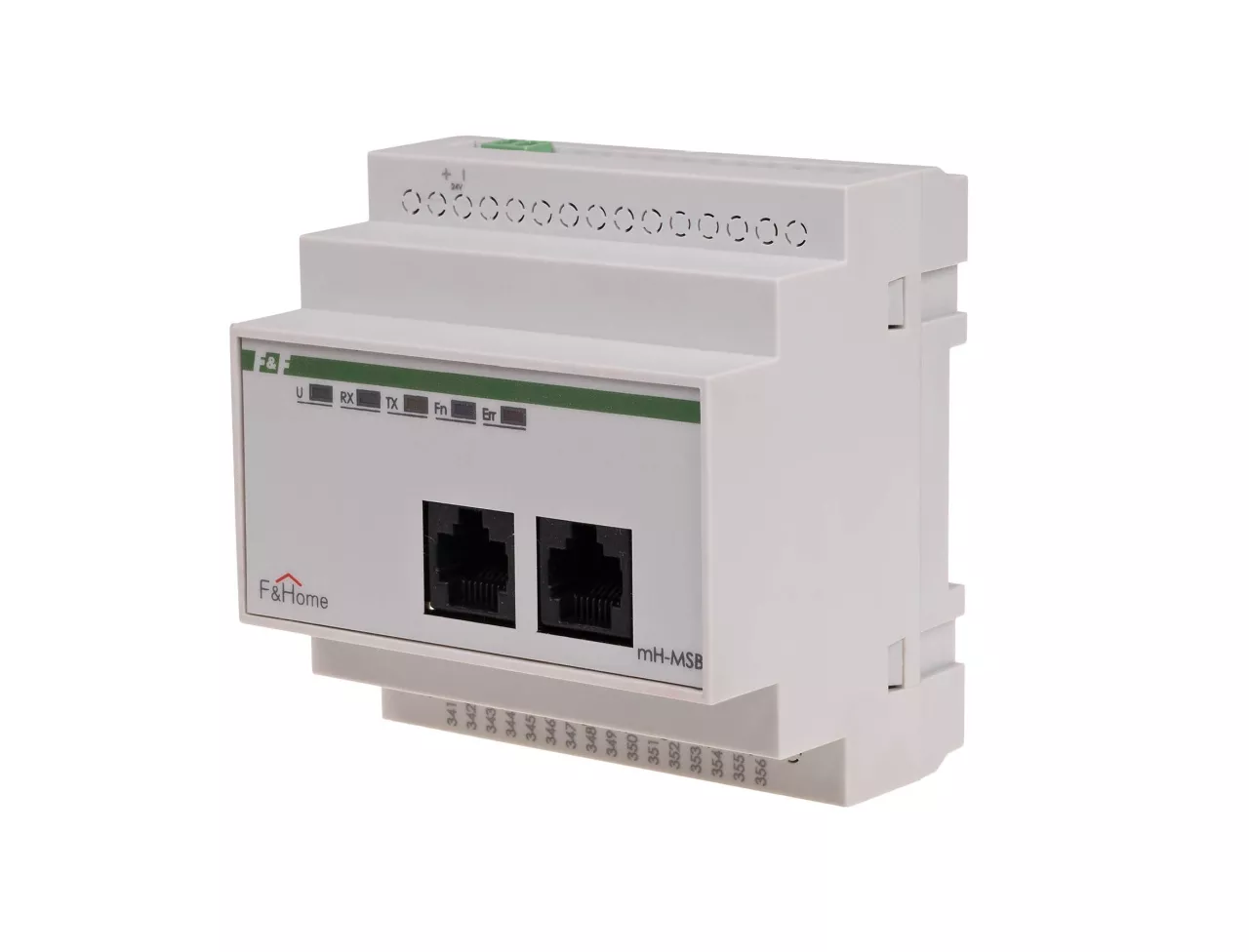 Moduł mH-MS jest szesnastokanałowym modułem wejściowym, do którego wejść podłączone są przyciski monostabilne (sterowanie impulsem jak w modułach IO). Do każdego z wejść użytkownik przypisuje dwie sceny zdefiniowane w panelu głównym systemu. Sterownik rozróżnia krótkie i długie naciśnięcie, a więc jednym przyciskiem możemy wywołać dwie różne sceny. Moduł scen jest zależny od panela systemowego i nie pracuje autonomicznie. Moduł zasilany jest napięciem 24V. Jeżeli w obiekcie wymagane jest sterowanie większą ilością scen (więcej niż 16) należy zastosować dodatkowe moduły scen w kolejnych poziomach.