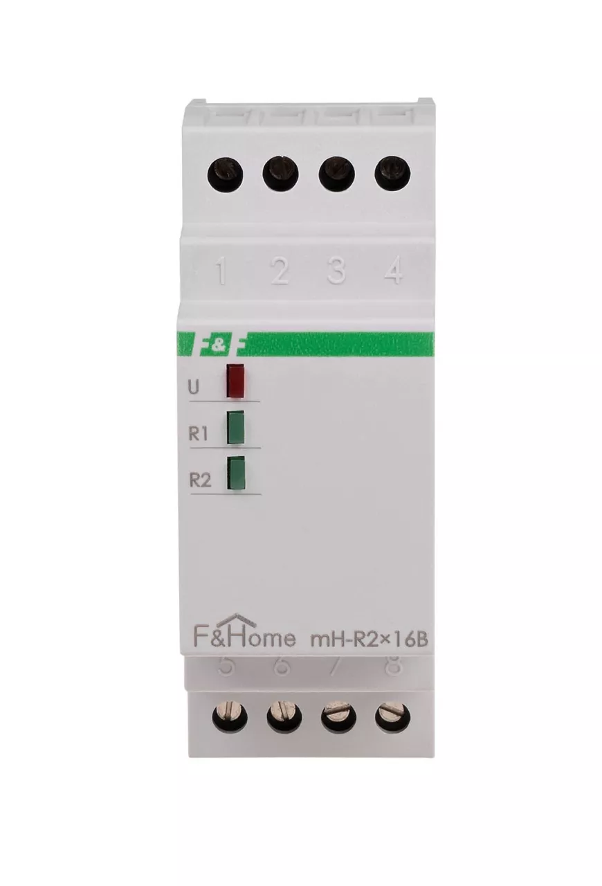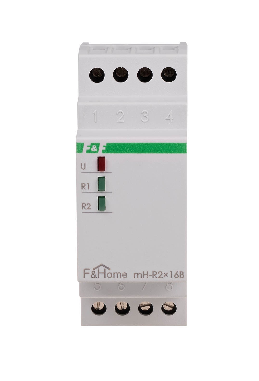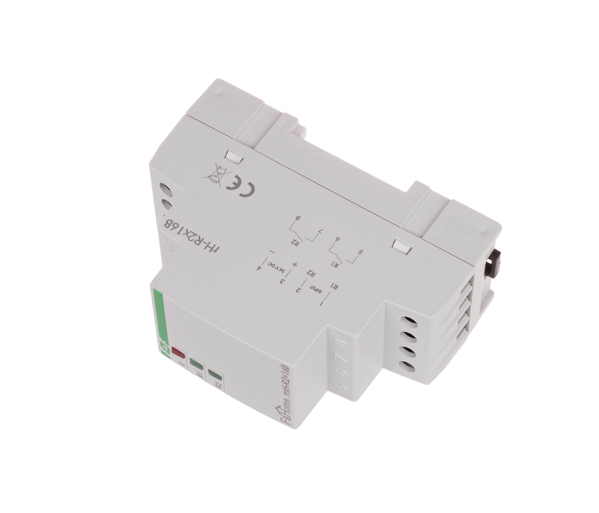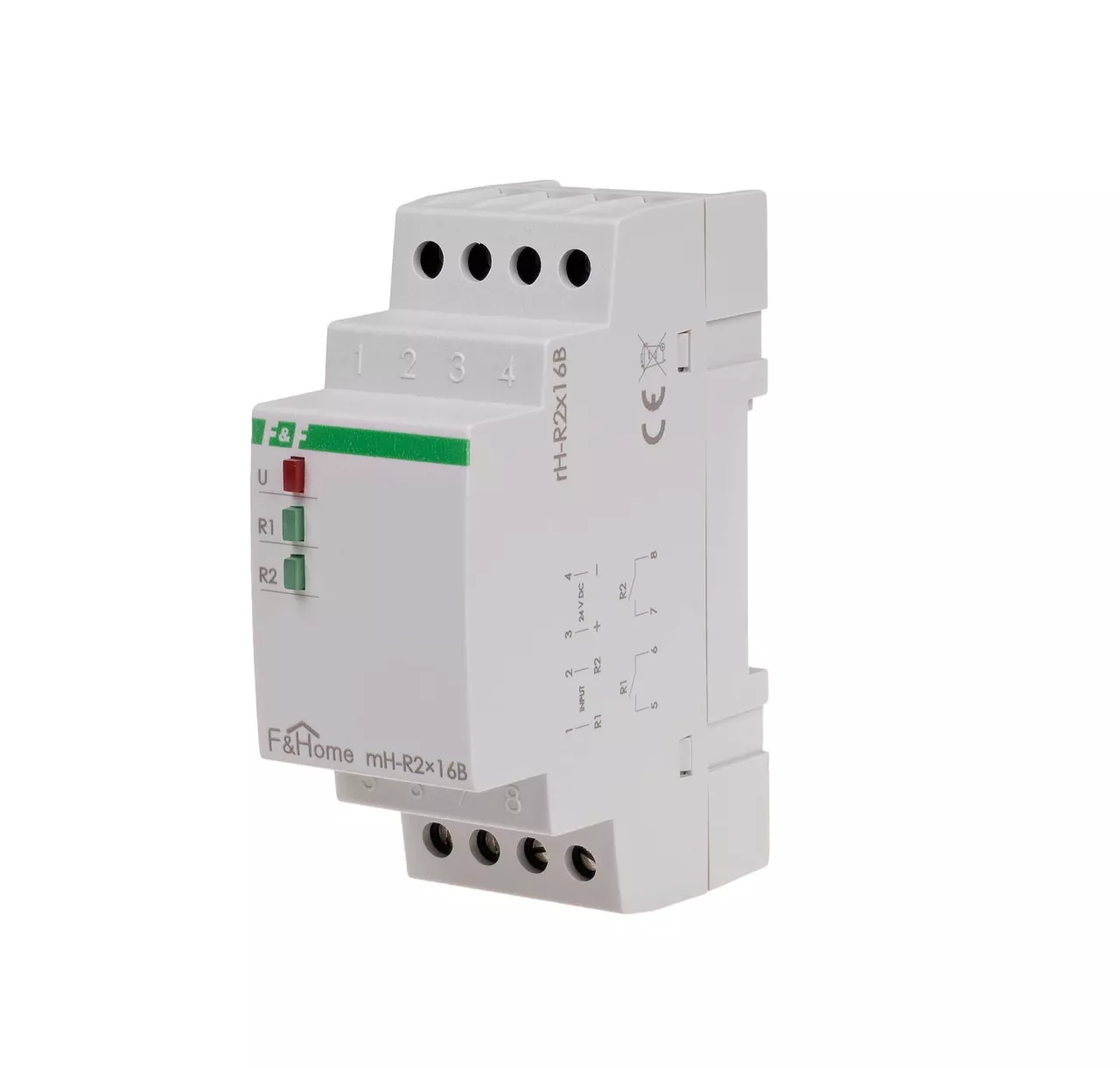 Moduł przekaźnikowy mH-R2x16 jest modułem wykonawczym przeznaczonym do bezpośredniego podłączenia do modułów sterujących mH-IO32, mH-E16 oraz mH-IO12E6. Moduł wyposażony jest w dwa niezależenie sterowane wyjścia typu NO (normalnie otwarte) o maksymalnej obciążalności 16A . Moduł montowany jest w rozdzielni, zajmuje pole 2 modułów i zasilany jest napięciem 24VDC. Zamknięcie styku odbywa się poprzez podanie na odpowiadające mu wejście sygnału +24V. Uwagi Wejścia w module zlokalizowane są na górze, a wyjścia na dole. Należy zwrócić szczególną uwagę na polaryzację zasilania modułu i upewnić się, że jest poprawnie podłączony do modułów mH-IO32, mH-IO12E6 lub mH-E16.