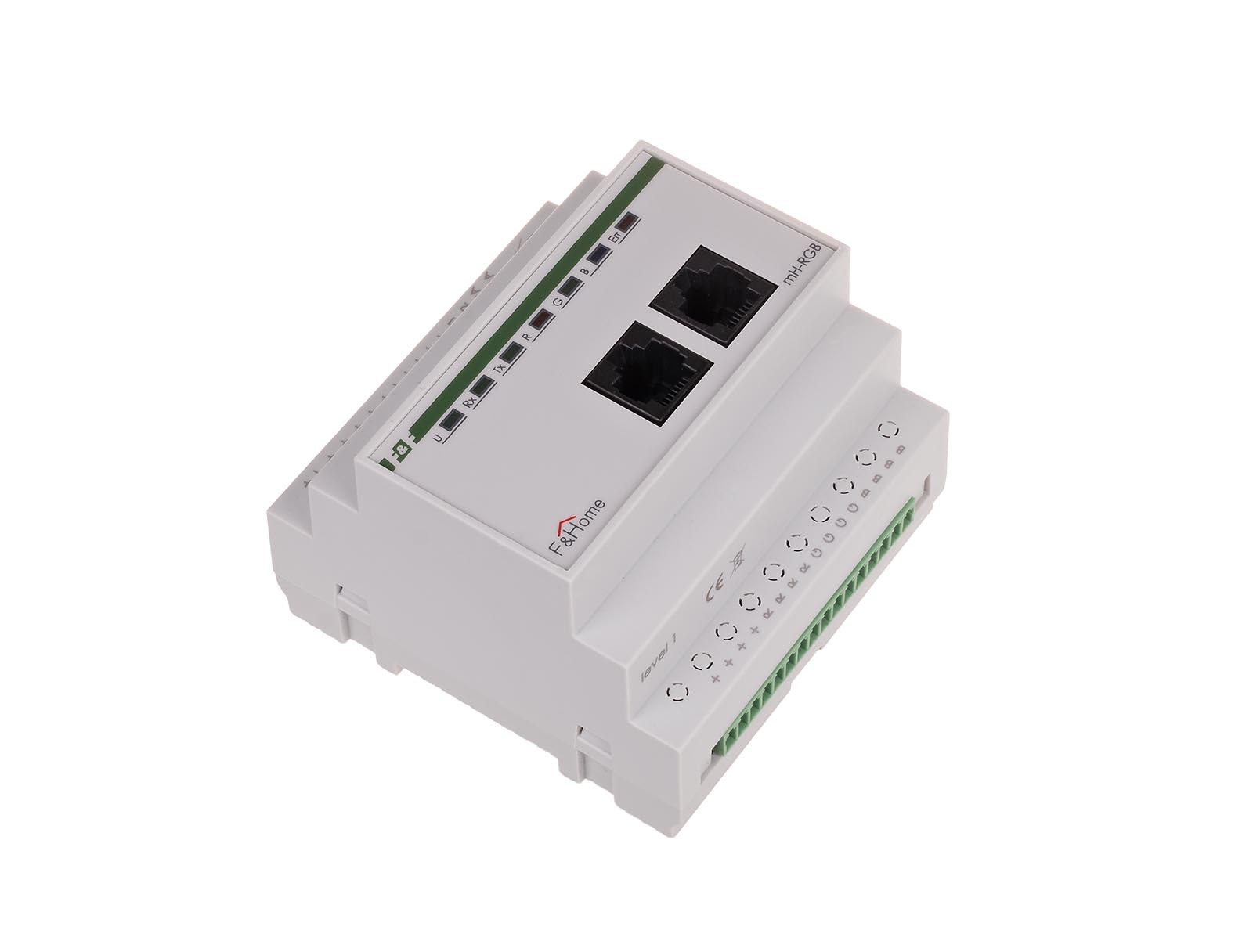 Moduł RGB przystosowany jest do sterowania niskonapięciowych (12V) źródeł światła LED na zasadzie ustawiania jasności i barwy oświetlenia. Do modułu należy podłączyć wielobarwne źródła RGB (np. paski, węże RGB) i regulować jasność oraz barwę światła. W przypadku źródeł światła RGB należy stosować źródła ze stałym plusem zasilania (sterowanie minusem). Moduł posiada dwa wejścia lokalne: jedno do podłączenia przycisku działającego analogicznie jak w ściemniaczach (krótkie przyciśnięcie włącza-wyłącza, dłuższe przytrzymanie ściemnia-rozjaśnia) i drugie serwisowe do zmiany barwy światła bez udziału panela dotykowego. Za pomocą panela dotykowego możliwe jest pełne sterowanie jasnością, barwą oraz czasami rozjaśniania-ściemniania. Moduł wymaga podłączenia niezależnego zasilacza 12V DC o mocy dobranej do podłączonego obciążenia LED. Bardzo istotna jest poprawna polaryzacja zasilania. Odwrotne podłączenie grozi uszkodzeniem podłączonego źródła światła (moduł jest zabezpieczony). Wyróżniamy dwa typy modułów RGB: model starszy z 2012 roku i nowszy model z 2013 roku. Nowszy model ma wprowadzony dodatkowy przekaźnik załączający zasilacz 12V. Generalna zasada działania opiera się na fakcie, że oświetlenie typu RGB nie jest załączone na stałe i nie ma powodu aby zasilacz 12V był stale załączony. Moduł jest zasilany z zasilacza systemowego 24V, a zasilacz 12V jest załączany tylko jeżeli zachodzi taka potrzeba.