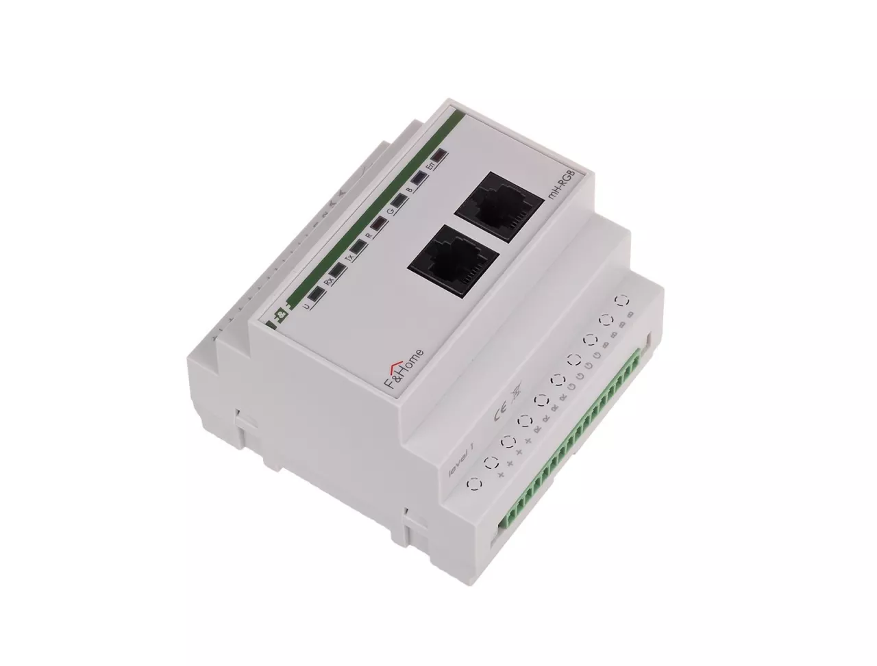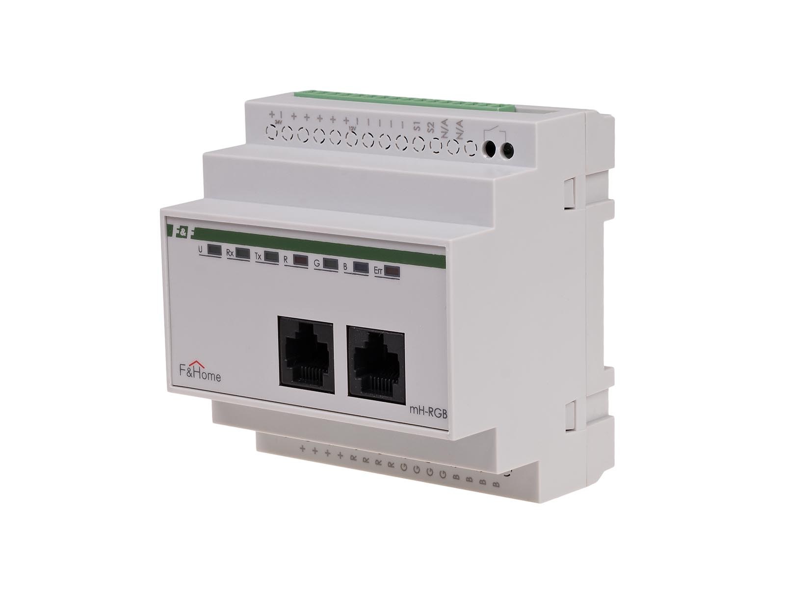 Moduł RGB przystosowany jest do sterowania niskonapięciowych (12V) źródeł światła LED na zasadzie ustawiania jasności i barwy oświetlenia. Do modułu należy podłączyć wielobarwne źródła RGB (np. paski, węże RGB) i regulować jasność oraz barwę światła. W przypadku źródeł światła RGB należy stosować źródła ze stałym plusem zasilania (sterowanie minusem). Moduł posiada dwa wejścia lokalne: jedno do podłączenia przycisku działającego analogicznie jak w ściemniaczach (krótkie przyciśnięcie włącza-wyłącza, dłuższe przytrzymanie ściemnia-rozjaśnia) i drugie serwisowe do zmiany barwy światła bez udziału panela dotykowego. Za pomocą panela dotykowego możliwe jest pełne sterowanie jasnością, barwą oraz czasami rozjaśniania-ściemniania. Moduł wymaga podłączenia niezależnego zasilacza 12V DC o mocy dobranej do podłączonego obciążenia LED. Bardzo istotna jest poprawna polaryzacja zasilania. Odwrotne podłączenie grozi uszkodzeniem podłączonego źródła światła (moduł jest zabezpieczony). Wyróżniamy dwa typy modułów RGB: model starszy z 2012 roku i nowszy model z 2013 roku. Nowszy model ma wprowadzony dodatkowy przekaźnik załączający zasilacz 12V. Generalna zasada działania opiera się na fakcie, że oświetlenie typu RGB nie jest załączone na stałe i nie ma powodu aby zasilacz 12V był stale załączony. Moduł jest zasilany z zasilacza systemowego 24V, a zasilacz 12V jest załączany tylko jeżeli zachodzi taka potrzeba.