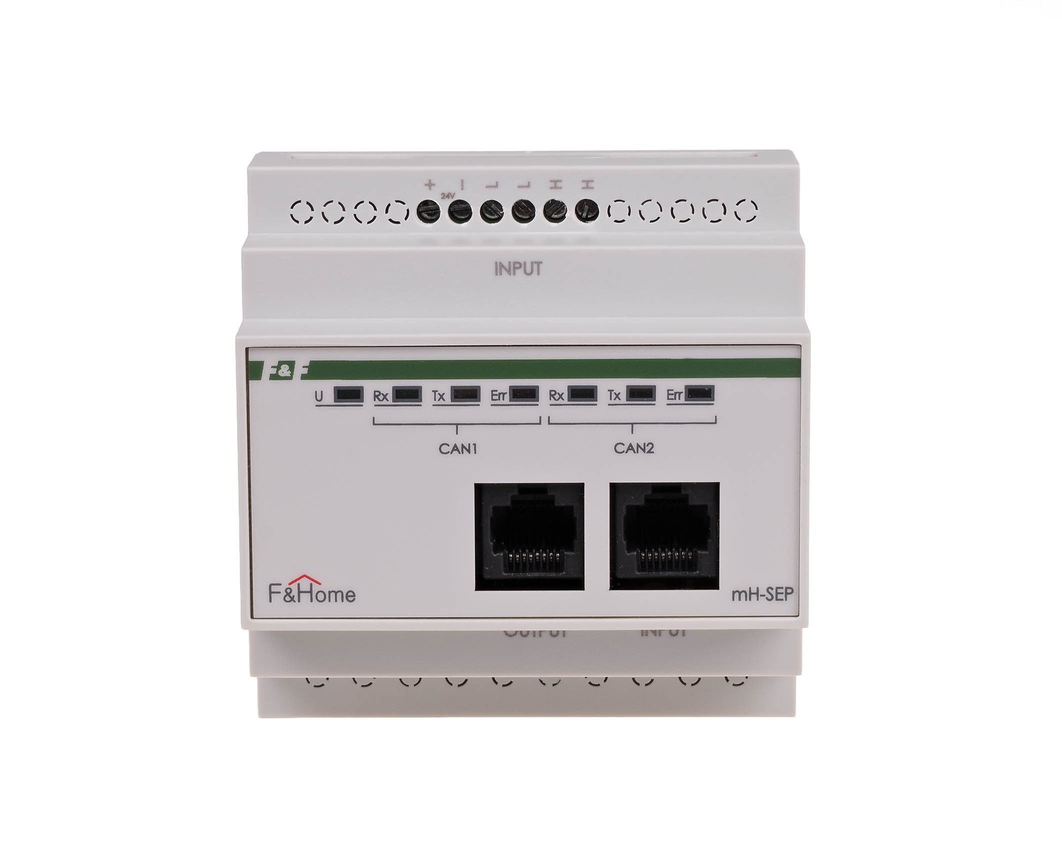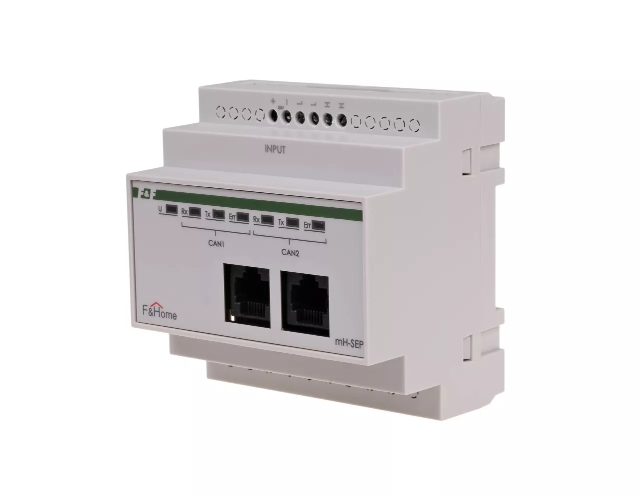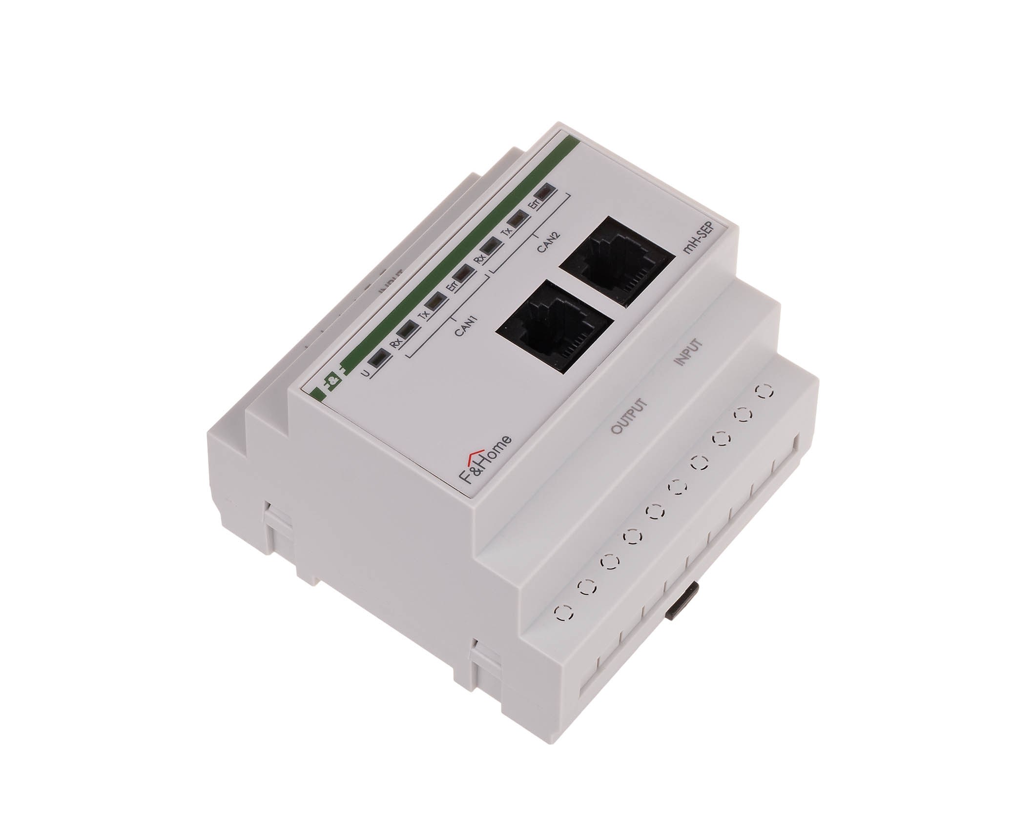 Moduł mH-S8 jest ośmiokanałowym sterownikiem współpracującym z cyfrowymi czujnikami temperatury mierzącymi temperatury w zakresie od +5 do +40 stopni z dokładnością do 0,1 stopnia i przystosowany jest do działania z modułami wykonawczymi mH-V8 sterującymi elektrozaworami w obwodzie ogrzewania. Moduł montowany jest w rozdzielni i zajmuje pole 5 modułów, a napięcie zasilania modułu wynosi 24 VDC. Do modułu sprowadzone są przewody FTP z czujników temperatury (po jednym przewodzie na każdy czujnik). Moduł pracuje autonomicznie w oparciu o szczegółowe ustawienia wprowadzone z panelu dotykowego (niezależnie ustawiana temperatura i histereza dla każdego pomieszczenia) i na podstawie tych ustawień steruje bezpośrednio modułem wykonawczym regulującym temperaturę w pomieszczeniu. W przypadku potrzeby stosowania podłączenia większej ilości czujników temperatury można zastosować kilka modułów mh-S8, przy czym należy pamiętać że muszą to być moduły kolejnych poziomów (mH-S8 – poziom 1, mH-S8-poziom 2…). Wejścia / wyjścia Moduł mH-S8 oferowany jest w wykonaniu na różne poziomy, umożliwiając w ten sposób rozbudowę sieci wejść/wyjść podłączonych do systemu F&Home. W pierwszej kolejności należy instalować moduł z poziomu 1, następnie z poziomu 2, itd. Każdy z poziomów charakteryzuje się oddzielną numeracją, dzięki czemu zapewniony jest łatwiejszy montaż instalacji. Zestawienie wyjść dla modułu mH-S4 przedstawione jest w poniższej tabeli. Zasada działania Do modułu sprowadzone są przewody FTP z czujników temperatury (po jednym przewodzie na każdy czujnik). Moduł pracuje autonomicznie w oparciu o szczegółowe ustawienia wprowadzone z panelu dotykowego (niezależnie ustawiana temperatura i histereza dla każdego pomieszczenia) i na podstawie tych ustawień steruje bezpośrednio modułem wykonawczym regulującym temperaturę w pomieszczeniu, przy czym zachowana jest zasada że na podstawie wskazań pierwszego modułu regulowana jest praca pierwszego elektrozaworu podłączonego do modułu wykonawczego. Programowanie modułu odbywa się w cyklu rocznym z krokiem 15 min. co pozwala uwzględnić porę dnia, dzień tygodnia oraz porę roku. Odczyt temperatury może być dokonywany z poziomu głównego panelu dotykowego. Uwagi Należy bezwzględnie przestrzegać sposobu podłączenia czujników temperatury. Zmiana kolejności przewodów może zakończyć się uszkodzeniem zarówno czujników jak i modułu mH-S8. Każdy z czujników podłączony jest za pomocą trzech żył przewodu FTP, przy czym należy zapewnić takie połączenie, aby przewód sygnałowy czujnika (zielony) razem z przewodem minusowym (biały) podłączony był do jednej pary przewodu FTP. Każdy czujnik musi być podłączony do oddzielnego przewodu FTP.
