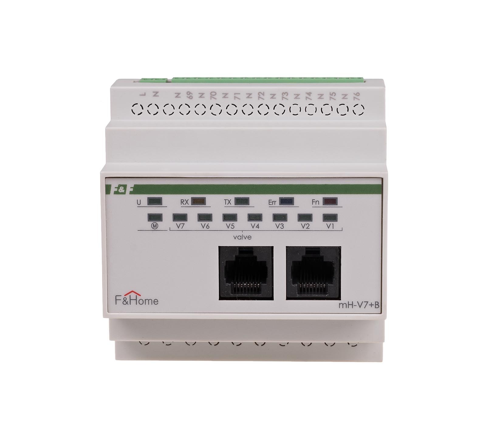 Moduł mH-V7+ jest siedmiokanałowym modułem wykonawczym, sterującym elektrozaworami zasilanymi napięciem 230V. Moduł współpracuje z modułem czujników mH-S8 pracującym w tym samym poziomie. Elementami wykonawczymi są elementy półprzewodnikowe, co daje dużą trwałość urządzenia (brak elementów mechanicznych – przekaźników). Dodatkowo ósmy kanał wykonawczy steruje pompką CO na zasadzie: jeżeli przynajmniej jeden elektrozawór zostaje załączony (otwarty) – załączona również zostaje pompka. Funkcja ta zapobiega pracy pompki przy zamkniętych wszystkich elektrozaworach, co zabezpiecza ją przed uszkodzeniem. Moduł zasilany jest napięciem 230V. Jeżeli w obiekcie wymagane jest sterowanie większą ilością obwodów ogrzewania należy zastosować dodatkowe moduły kolejnych poziomów pamiętając, że należy zastosować również moduły czujników w tym samym poziomie (np. S8-1 i V7+-1 lub S8-2 i V7+-2). Bardzo istotny jest dobór elektrozaworów. Ważne jest aby cewki były zasilane napięciem 230V.