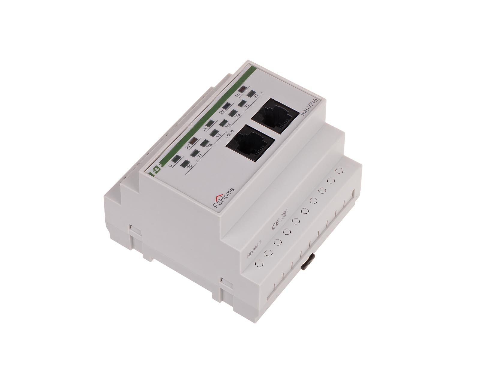 Moduł mH-V7+ jest siedmiokanałowym modułem wykonawczym, sterującym elektrozaworami zasilanymi napięciem 230V. Moduł współpracuje z modułem czujników mH-S8 pracującym w tym samym poziomie. Elementami wykonawczymi są elementy półprzewodnikowe, co daje dużą trwałość urządzenia (brak elementów mechanicznych – przekaźników). Dodatkowo ósmy kanał wykonawczy steruje pompką CO na zasadzie: jeżeli przynajmniej jeden elektrozawór zostaje załączony (otwarty) – załączona również zostaje pompka. Funkcja ta zapobiega pracy pompki przy zamkniętych wszystkich elektrozaworach, co zabezpiecza ją przed uszkodzeniem. Moduł zasilany jest napięciem 230V. Jeżeli w obiekcie wymagane jest sterowanie większą ilością obwodów ogrzewania należy zastosować dodatkowe moduły kolejnych poziomów pamiętając, że należy zastosować również moduły czujników w tym samym poziomie (np. S8-1 i V7+-1 lub S8-2 i V7+-2). Bardzo istotny jest dobór elektrozaworów. Ważne jest aby cewki były zasilane napięciem 230V.