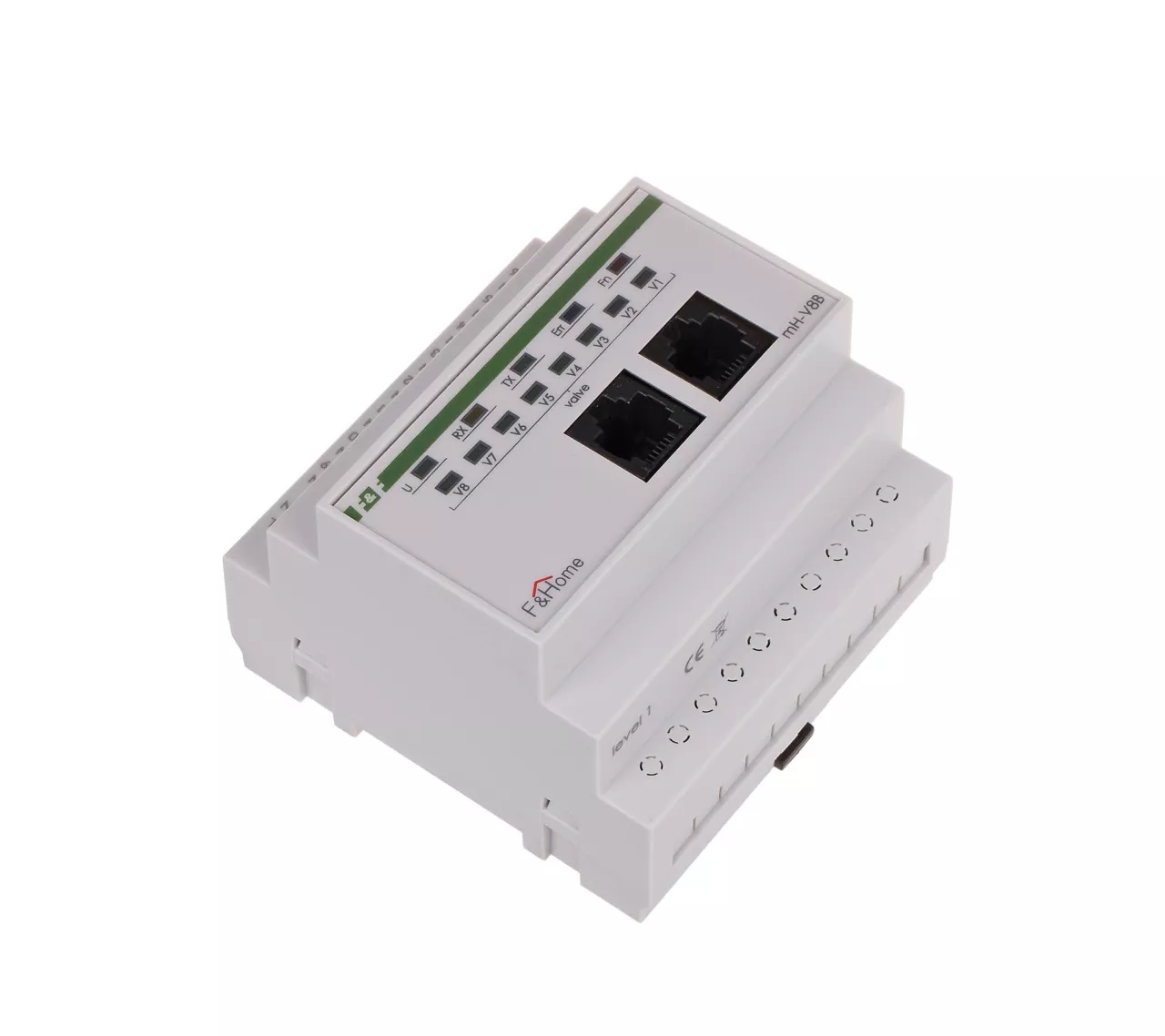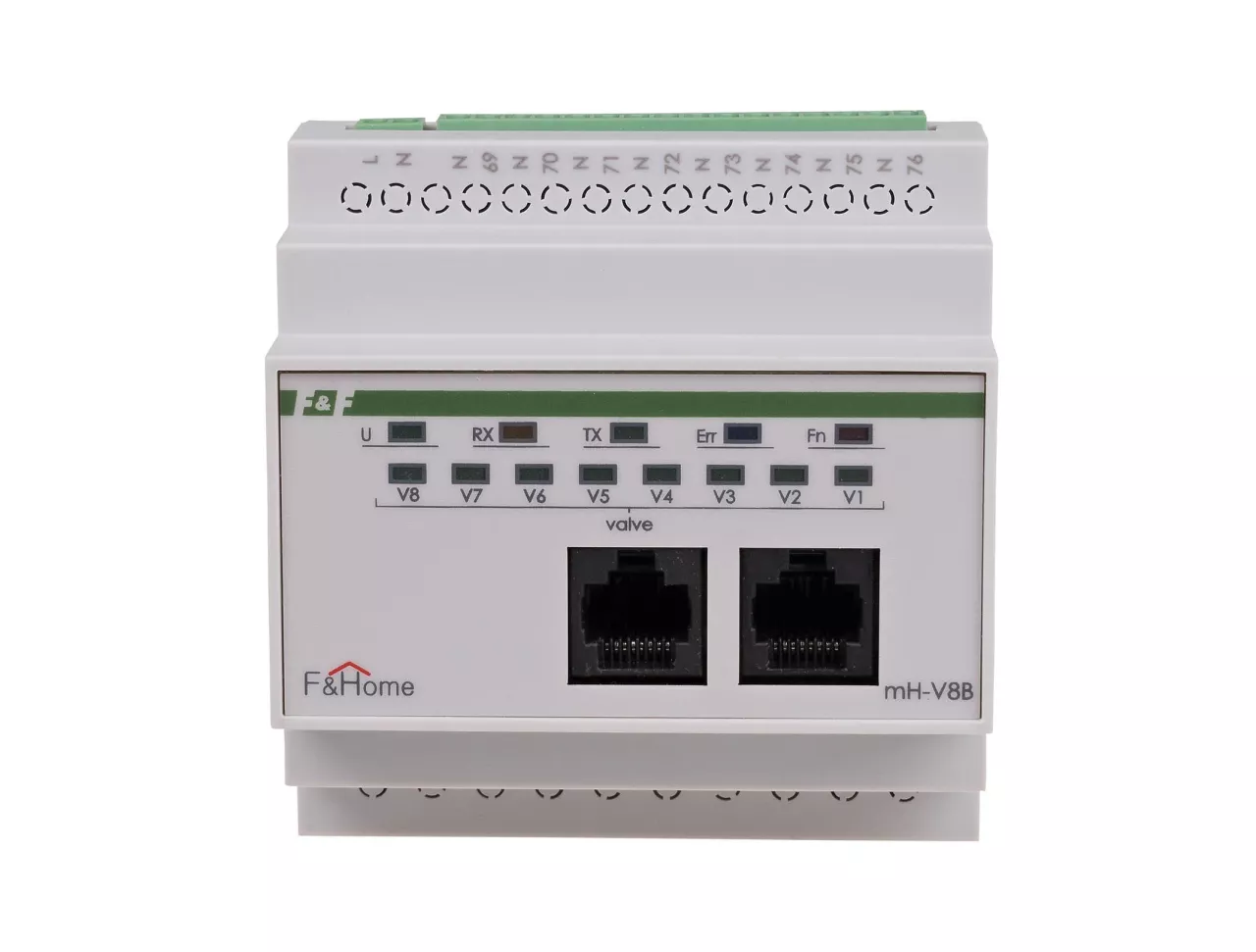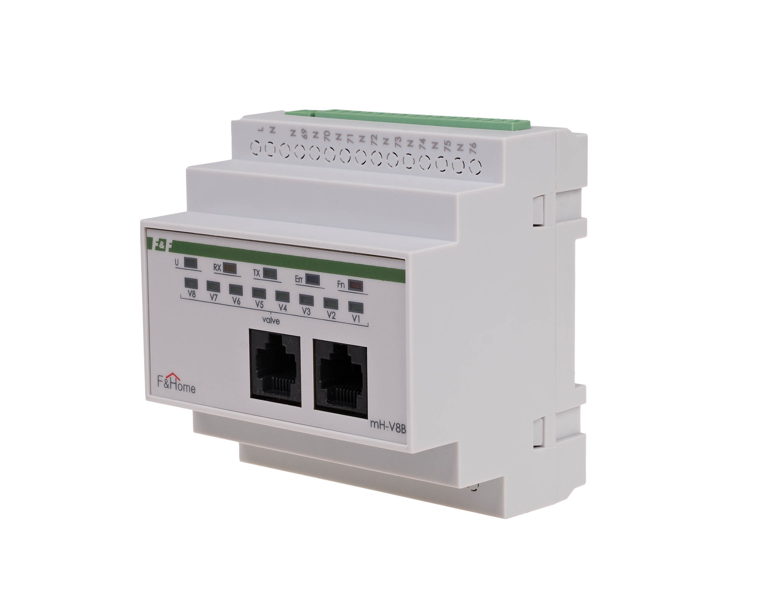 Moduł mH-V8 jest ośmiokanałowym modułem wykonawczym sterującym pracą elektrozaworów podłączonych do wyjść modułu i przystosowany jest do pracy z modułami czujników temperatury mH-S8. Moduł montowany jest w rozdzielni i zajmuje pole 5 modułów, a napięcie zasilania modułu wynosi 230 VAC. Moduł nadaje się do sterowania elektrozaworami w obwodach ogrzewania (zazwyczaj zainstalowanymi na kolektorze) o napięciu cewki 230 VAC i działa na zasadzie włącz-wyłącz, niezależnie od głównego panelu dotykowego (stanowi autonomiczną parę z modułem mH-S8 znajdującego się na tym samym poziomie). W przypadku potrzeby stosowania podłączenia większej ilości czujników temperatury można zastosować kilka modułów mH-V8, przy czym należy pamiętać że muszą to być moduły kolejnych poziomów (mH-V8 – poziom 1, mH-V8-poziom 2, …). Wejścia / wyjścia Moduł mH-V8 oferowany jest w wykonaniu na różne poziomy, umożliwiając w ten sposób rozbudowę sieci wejść/wyjść podłączonych do systemu F&Home. W pierwszej kolejności należy instalować moduł z poziomu 1, następnie z poziomu 2, itd. Każdy z poziomów charakteryzuje się oddzielną numeracją, dzięki czemu zapewniony jest łatwiejszy montaż instalacji. Zestawienie wyjść dla modułu mH-V8 przedstawione jest w poniższej tabeli. Zasada działania Moduł wykonawczy mH-V8 sterowany jest poprzez sieć CAN z modułu czujnikowego mH-S8 znajdującego się na tym samym poziomie. W zależności od ustalonego programu pracy oraz wskazania temperatury na danym wejściu czujnikowym wyzwolone będzie odpowiednie wyjście modułu mH-V8. Para modułów mH-S8 – mH-V8 działa niezależnie od głównego panelu dotykowego, który służy tylko do ustalenia programu pracy. Uszkodzenie lub brak panelu dotykowego nie przerywa pracy układu regulacji temperatury.