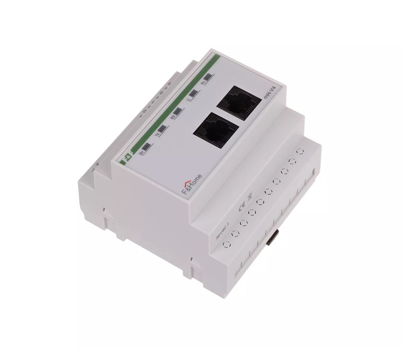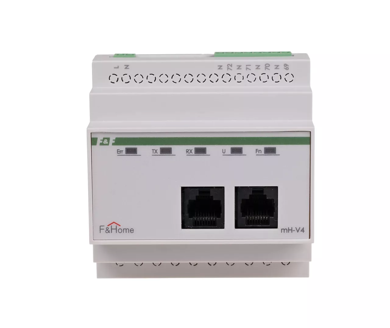 Moduł mH-V4 jest czterokanałowym modułem wykonawczym sterującym pracą elektrozaworów podłączonych do wyjść modułu i przystosowany jest do pracy z modułami czujników temperatury mH-S4. Moduł montowany jest w rozdzielni i zajmuje pole 5 modułów, a napięcie zasilania modułu wynosi 230 VAC. Moduł nadaje się do sterowania elektrozaworami w obwodach ogrzewania (zazwyczaj zainstalowanymi na kolektorze) o napięciu cewki 230 VAC i działa na zasadzie włącz-wyłącz, niezależnie od głównego panelu dotykowego (stanowi autonomiczną parę z modułem mH-S4 znajdującego się na tym samym poziomie). W przypadku potrzeby stosowania podłączenia większej ilości czujników temperatury można zastosować kilka modułów mH-V4, przy czym należy pamiętać że muszą to być moduły kolejnych poziomów (mH-V4 – poziom 1, mH-V4-poziom 2…). Wejścia / wyjścia Moduł mH-V4 oferowany jest w wykonaniu na różne poziomy, umożliwiając w ten sposób rozbudowę sieci wejść/wyjść podłączonych do systemu F&Home. W pierwszej kolejności należy instalować moduł z poziomu 1, następnie z poziomu 2, itd. Każdy z poziomów charakteryzuje się oddzielną numeracją, dzięki czemu zapewniony jest łatwiejszy montaż instalacji. Zestawienie wyjść dla modułu mH-V4 przedstawione jest w poniższej tabeli. Zasada działania Moduł wykonawczy mH-V4 sterowany jest poprzez sieć CAN z modułu czujnikowego mH-S4 znajdującego się na tym samym poziomie. W zależności od ustalonego programu pracy oraz wskazania temperatury na danym wejściu czujnikowym wyzwolone będzie odpowiednie wyjście modułu mH-V4. Para modułów mH-S4 – mH-V4 działa niezależnie od głównego panelu dotykowego, który służy tylko do ustalenia programu pracy. Uszkodzenie lub brak panelu dotykowego nie przerywa pracy układu regulacji temperatury.