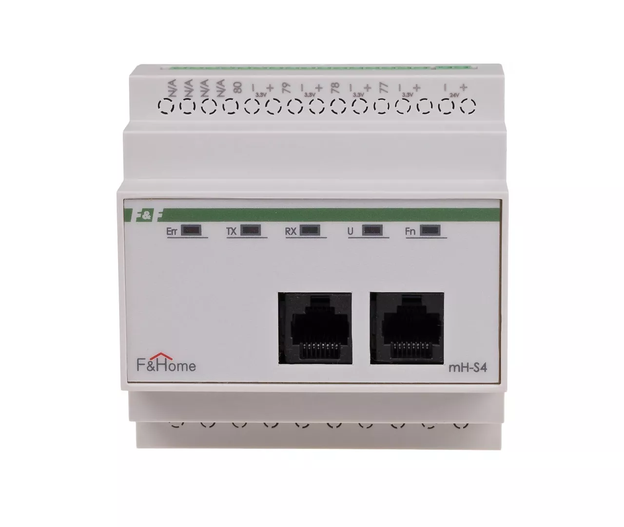 Moduł mH-S4 jest czterokanałowym sterownikiem współpracującym z cyfrowymi czujnikami temperatury mierzącymi temperatury w zakresie od +5 do +40 stopni z dokładnością do 0,1 stopnia i przystosowany jest do działania z modułami wykonawczymi mH-V4 sterującymi elektrozaworami w obwodzie ogrzewania. Moduł montowany jest w rozdzielni i zajmuje pole 5 modułów, a napięcie zasilania modułu wynosi 24 VDC. Do modułu sprowadzone są przewody FTP z czujników temperatury (po jednym przewodzie na każdy czujnik). Moduł pracuje autonomicznie w oparciu o szczegółowe ustawienia wprowadzone z panelu dotykowego (niezależnie ustawiana temperatura i histereza dla każdego pomieszczenia) i na podstawie tych ustawień steruje bezpośrednio modułem wykonawczym regulującym temperaturę w pomieszczeniu. W przypadku potrzeby stosowania podłączenia większej ilości czujników temperatury można zastosować kilka modułów mh-S4, przy czym należy pamiętać że muszą to być moduły kolejnych poziomów (mH-S4 – poziom 1, mH-S4-poziom 2, …). Wejścia / wyjścia Moduł mH-S4 oferowany jest w wykonaniu na różne poziomy, umożliwiając w ten sposób rozbudowę sieci wejść/wyjść podłączonych do systemu F&Home. W pierwszej kolejności należy instalować moduł z poziomu 1, następnie z poziomu 2, itd. Każdy z poziomów charakteryzuje się oddzielną numeracją, dzięki czemu zapewniony jest łatwiejszy montaż instalacji. Zestawienie wyjść dla modułu mH-S4 przedstawione jest w poniższej tabeli. Zasada działania Do modułu sprowadzone są przewody FTP z czujników temperatury (po jednym przewodzie na każdy czujnik). Moduł pracuje autonomicznie w oparciu o szczegółowe ustawienia wprowadzone z panelu dotykowego (niezależnie ustawiana temperatura i histereza dla każdego pomieszczenia) i na podstawie tych ustawień steruje bezpośrednio modułem wykonawczym regulującym temperaturę w pomieszczeniu, przy czym zachowana jest zasada że na podstawie wskazań pierwszego modułu regulowana jest praca pierwszego elektrozaworu podłączonego do modułu wykonawczego. Programowanie modułu odbywa się w cyklu rocznym z krokiem 15 min. co pozwala uwzględnić porę dnia, dzień tygodnia oraz porę roku. Odczyt temperatury może być dokonywany z poziomu głównego panelu dotykowego. Uwagi Należy bezwzględnie przestrzegać sposobu podłączenia czujników temperatury. Zmiana kolejności przewodów może zakończyć się uszkodzeniem zarówno czujników jak i modułu mH-S4 Każdy z czujników podłączony jest za pomocą trzech żył przewodu FTP, przy czym należy zapewnić takie połączenie, aby przewód sygnałowy czujnika (zielony) razem z przewodem minusowym (biały) podłączony był do jednej pary przewodu FTP. Każdy czujnik musi być podłączony do oddzielnego przewodu FTP