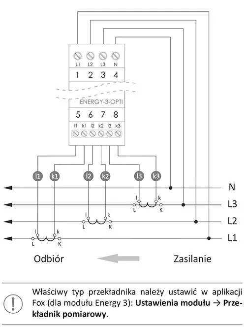 Napięcie zasilania 3× 230/400 V AC (-25%÷15%) Częstotliwość 50÷60 Hz Instalacja 3-fazowa, 4-przewodowa Dokładność miernik 1% Dokładność - przekładniki pomiarowe 0,5% Przekładniki - prąd pierwotny 40 A Przekładniki - prąd wtórny 30 mA Przekładniki - średnica przewodu ≤10 mm Stała miernika 1000 imp/kWh Wilgotność (bez kondensacji) ≤ 90% Częstotliwość radia 2,4 GHz Transmisja WI-FI Moc radia (IEEE 802.11n) ≤ 20 dBm Czułość odbiornika -98 dBm Przyłącze zaciski śrubowe 2,5 mm² (linka); zaciski śrubowe 4,0 mm² (drut) Moment dokręcający 0,5 Nm Pobór mocy ≤ 2 W Temperatura pracy -20÷50°C Wymiary 2 moduły (35 mm) Montaż na szynie 35 mm Stopień ochrony IP20