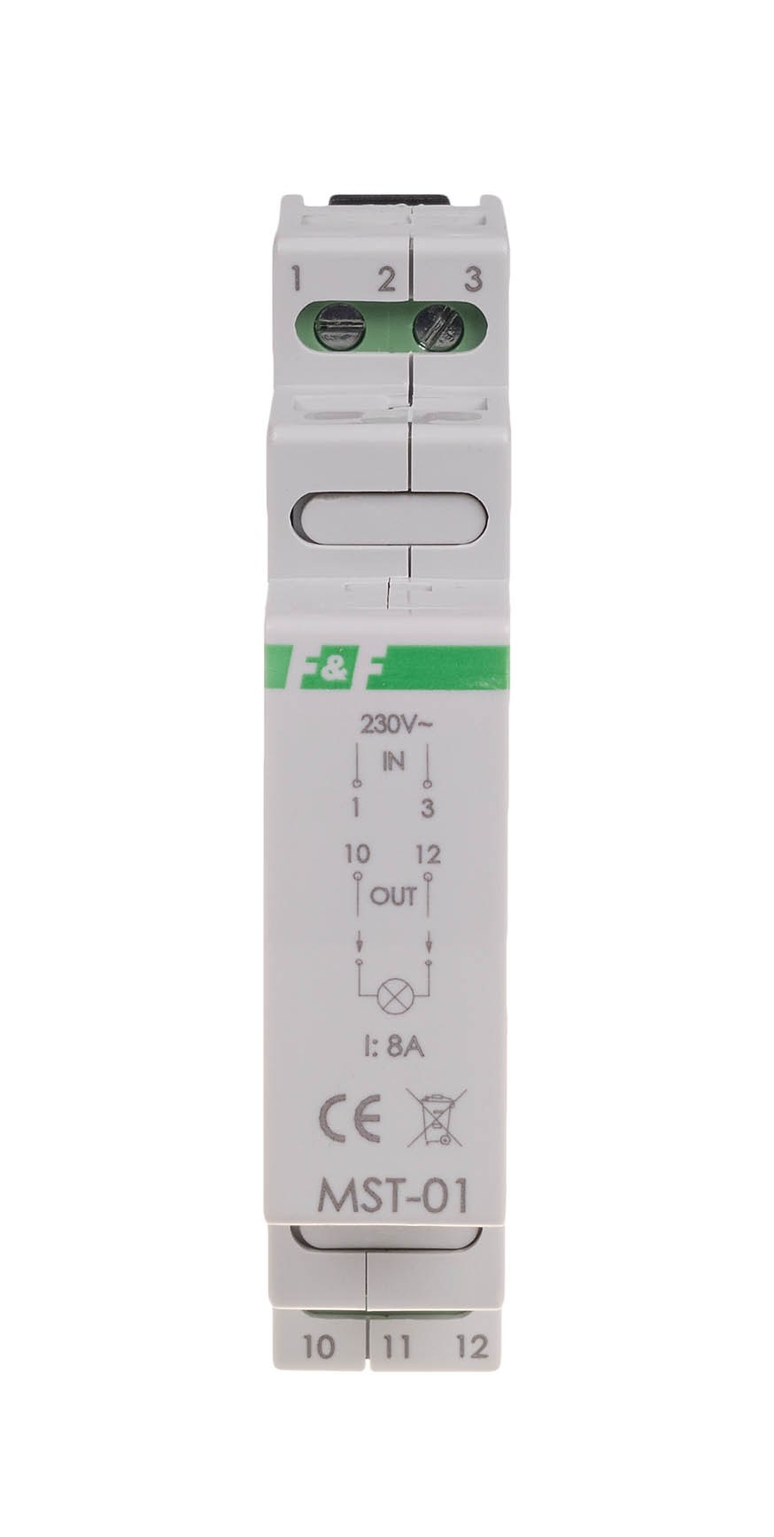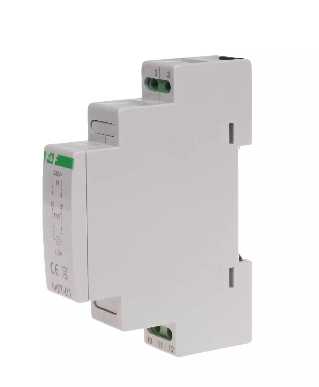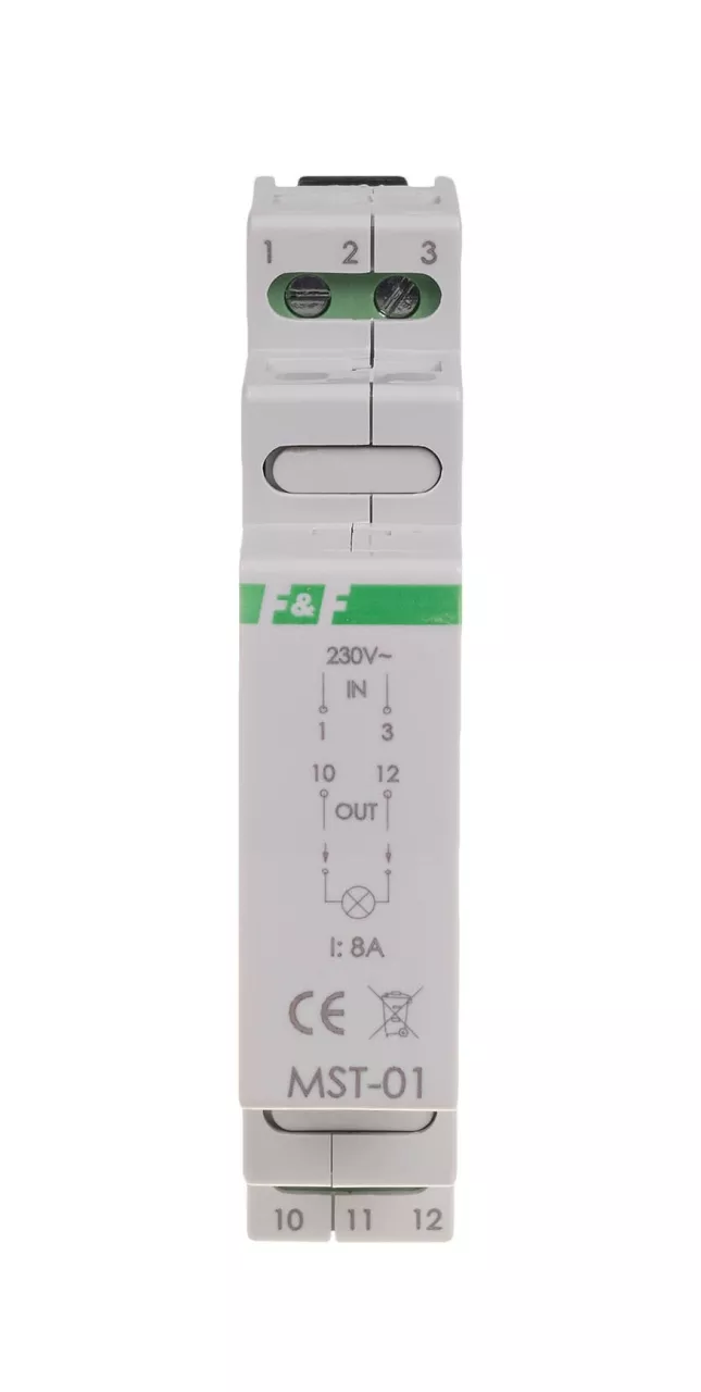 Maksymalny prąd obciążenia AC-1 8 A Element wykonawczy przekaźnik Konfiguracja styków 1 × NO Napięcie wyjściowe OUT 230 V AC Czas przełączania 1 s Napięcie wejściowe IN 230 V AC Przyłącze zaciski śrubowe 2,5 mm² Moment dokręcający 0,4 Nm Pobór mocy 0,1 W Temperatura pracy -25 ÷ 50 °C Wymiary 1 moduł (18 mm) Montaż na szynie 35 mm Stopień ochrony IP20