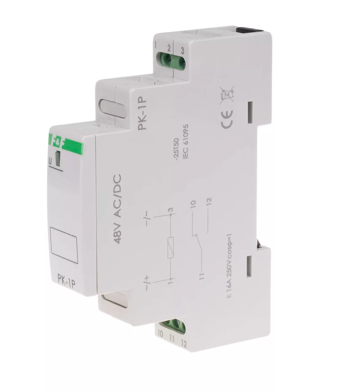 Napięcie zasilania 48 V AC/DC Tolerancja napięcia zasilania -15 ÷ 10 % Maksymalny prąd obciążenia AC-1 16 A Element wykonawczy przekaźnik Konfiguracja styków 1 × NO/NC Separacja styku TAK Maksymalny pobór prądu 25 mA Trwałość łączeniowa mechaniczna min. 5x10⁶ cykli Przyłącze zaciski śrubowe 2,5 mm² Moment dokręcający 0,4 Nm Temperatura pracy -25 ÷ 50 °C Wymiary 1 moduł (18 mm) Montaż na szynie 35 mm Stopień ochrony IP20