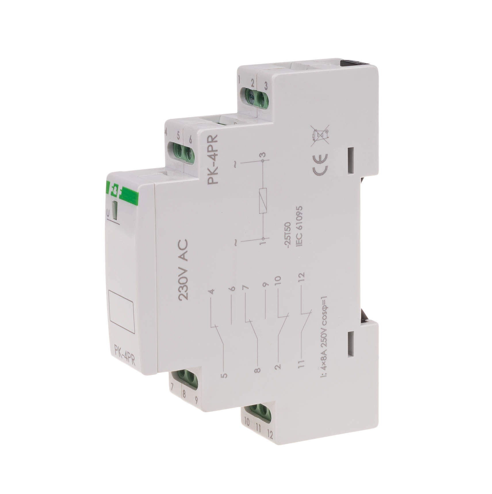 Napięcie zasilania 230 V AC Tolerancja napięcia zasilania -15 ÷ 10 % Maksymalny prąd obciążenia AC-1 8 A Element wykonawczy przekaźnik Konfiguracja styków 2 × NO/NC + 2 × NC Separacja styku TAK Maksymalny pobór prądu 25 mA Trwałość łączeniowa mechaniczna min. 5x10⁶ cykli Przyłącze zaciski śrubowe 2,5 mm² Moment dokręcający 0,4 Nm Temperatura pracy -25 ÷ 50 °C Wymiary 1 moduł (18 mm) Montaż na szynie 35 mm Stopień ochrony IP20