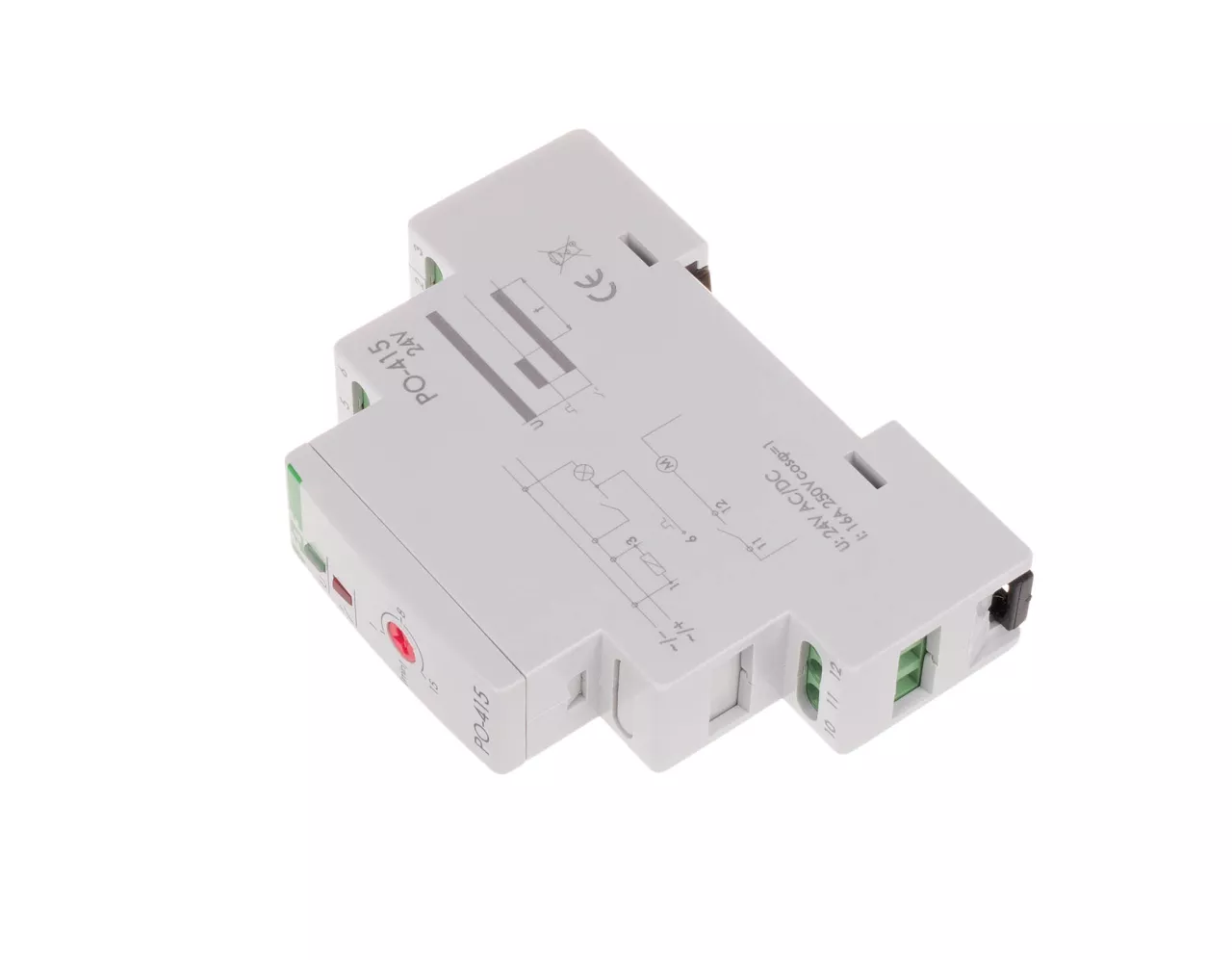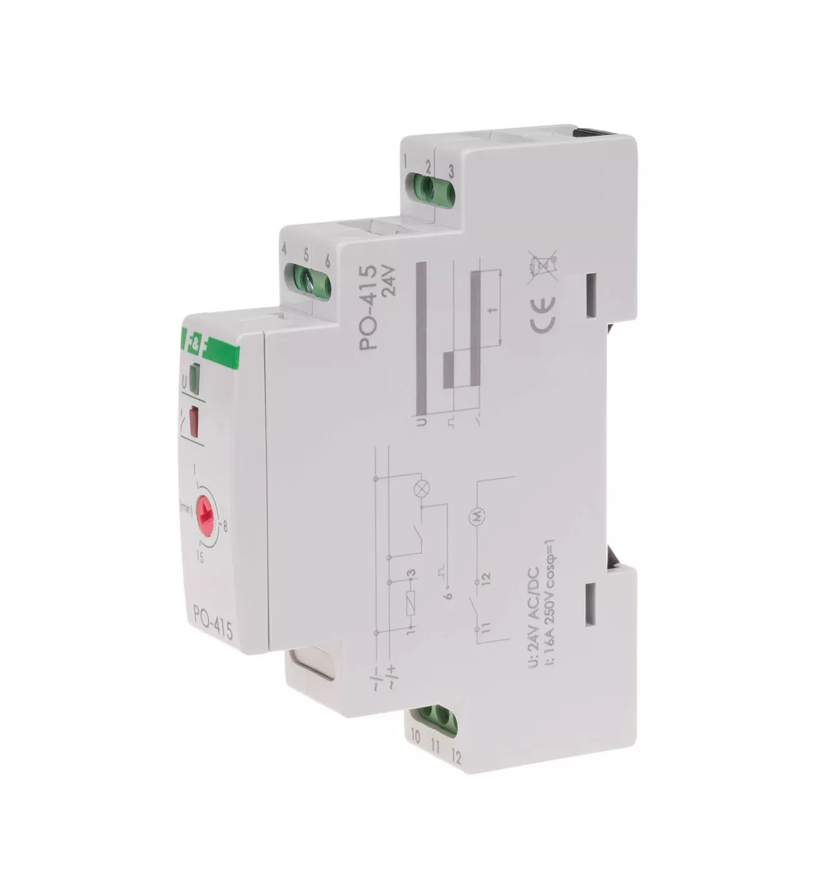 z opóźnionym odpadaniem ; zakres czasowy 1÷15m ; Un=24V AC/DC ; Io<16A ; montaż na szynie TH-37
