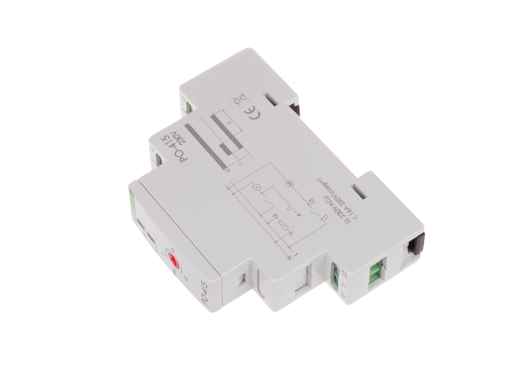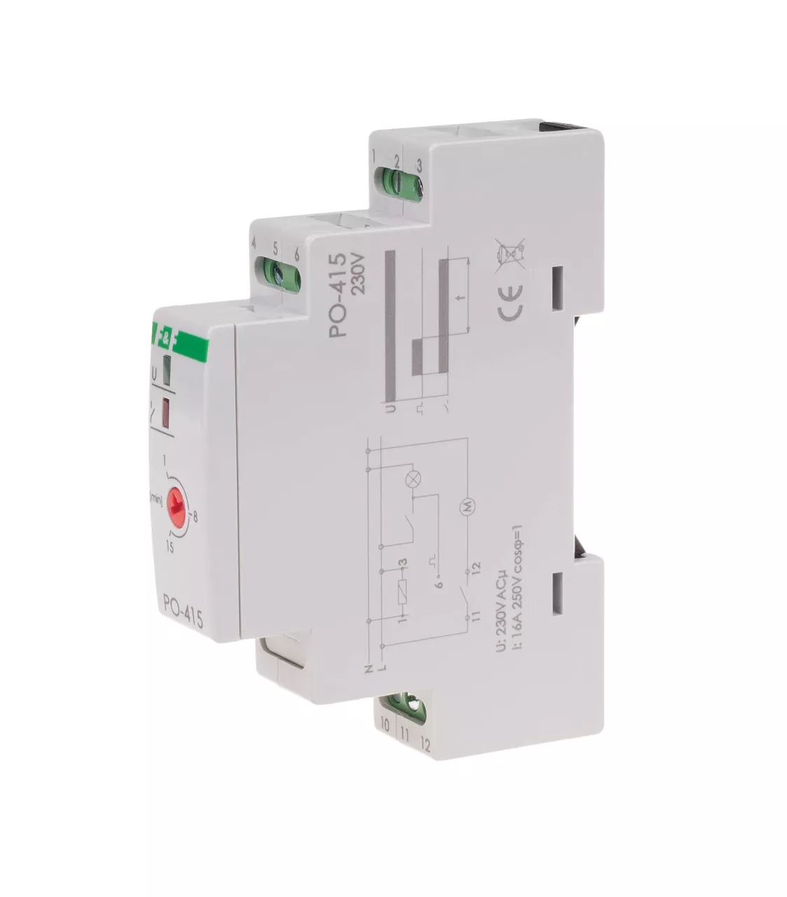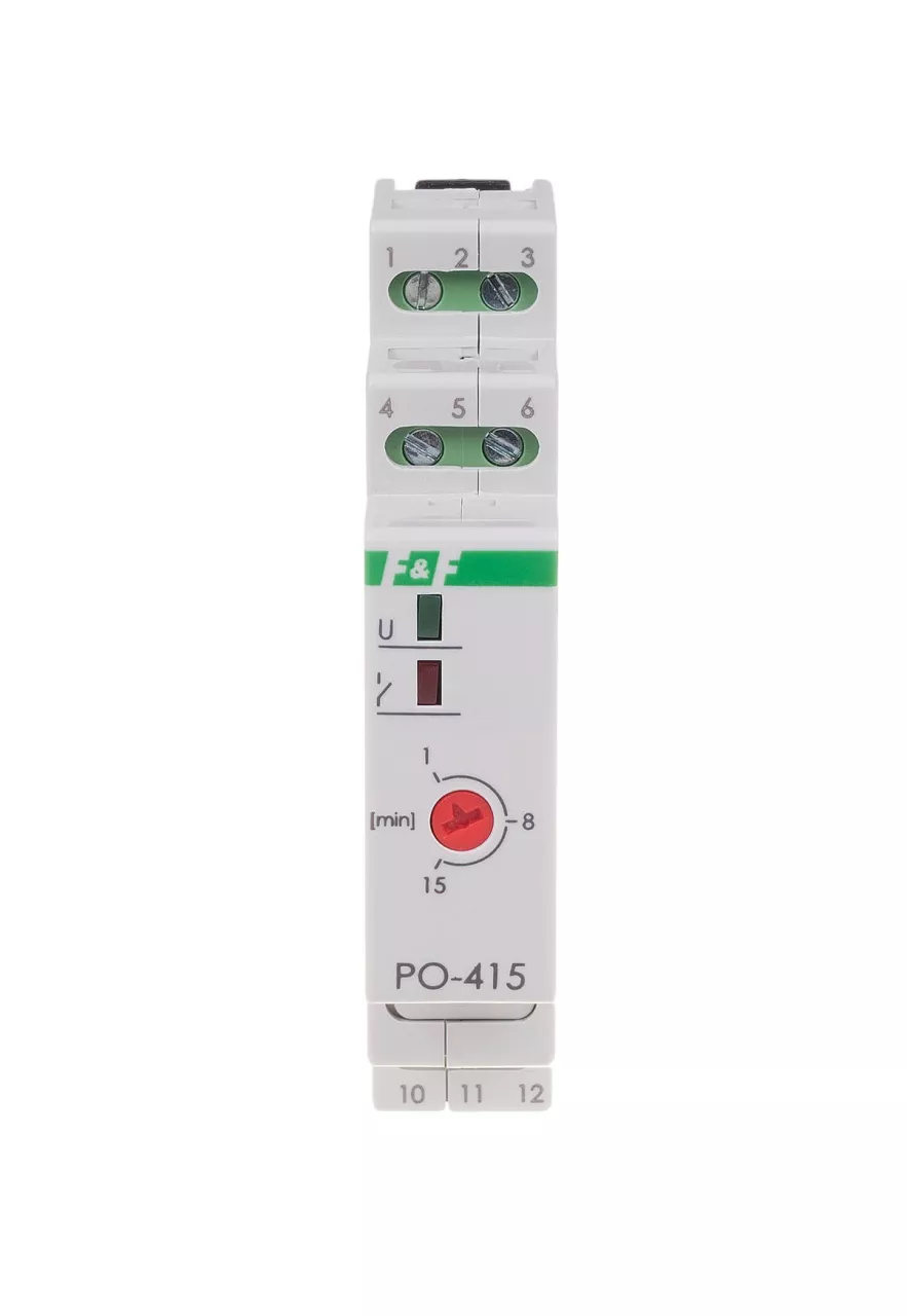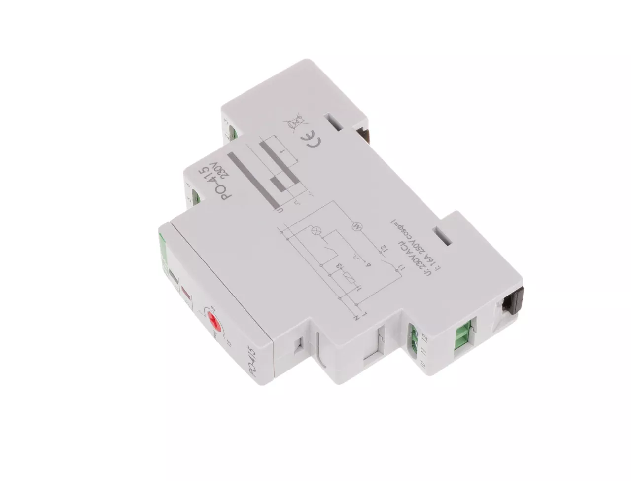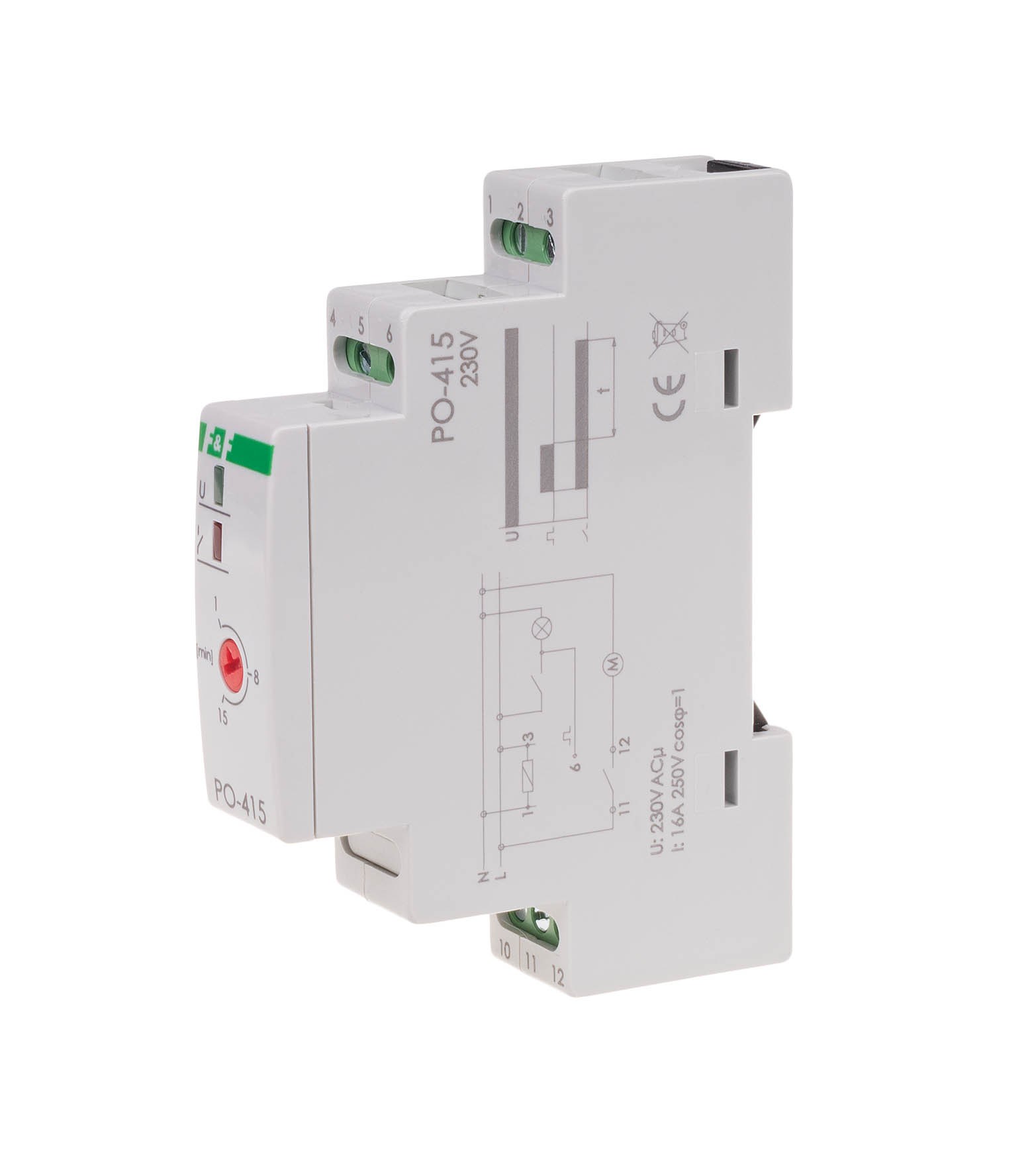 Napięcie zasilania 230 V AC Tryb pracy z opóźnionym odpadaniem Element wykonawczy przekaźnik Maksymalny prąd obciążenia 10 A Konfiguracja styków 1 × NO/NC Separacja styku TAK Prąd impulsu sterującego mniej niż 300 mA Sygnalizacja stanu styku LED czerwona Sygnalizacja zasilania LED zielona Czas podtrzymania 1÷15 min. Przyłącze zaciski śrubowe 2,5 mm² Moment dokręcający 0,4 Nm Pobór mocy 0,56 W Temperatura pracy -25 ÷ 50 °C Wymiary 1 moduł (18 mm) Montaż na szynie 35 mm Stopień ochrony IP20