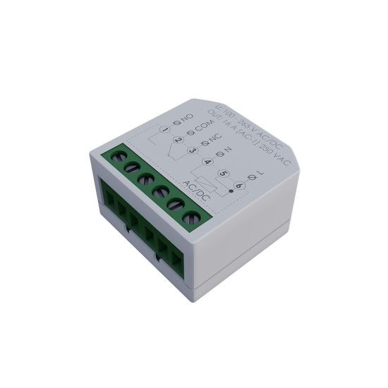 Napięcie zasilania 100÷265 V AC Maksymalny prąd obciążenia AC-1 16 A Element wykonawczy przekaźnik Konfiguracja styków 1 × NO/NC Separacja styku TAK Trwałość łączeniowa mechaniczna min. 5x10⁶ cykli Przyłącze zaciski śrubowe 2,5 mm² Moment dokręcający 0,4 Nm Pobór mocy 0,15 W czuwanie/0,6 W praca Temperatura pracy -25 ÷ 50 °C Wymiary 35×36×19 mm Montaż w puszce podtynkowej Ø60 Stopień ochrony IP20