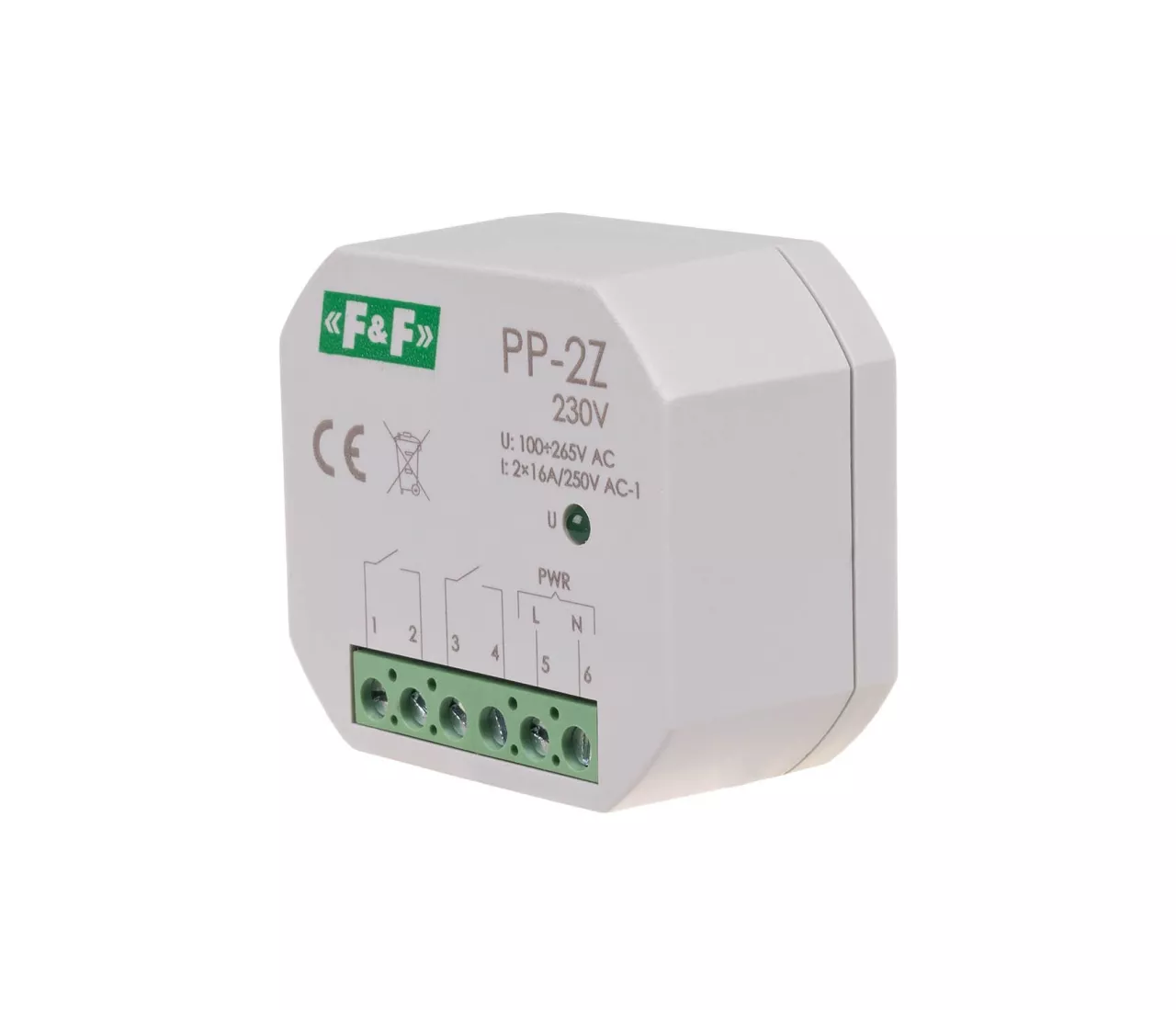 Napięcie zasilania 100÷265 V AC Maksymalny prąd obciążenia AC-1 16 A Element wykonawczy przekaźnik Konfiguracja styków 2 × NO Separacja styku TAK Trwałość łączeniowa mechaniczna min. 5x10⁶ cykli Przyłącze zaciski śrubowe 2,5 mm² Moment dokręcający 0,4 Nm Pobór mocy 0,6 W Temperatura pracy -25 ÷ 50 °C Wymiary Ø54 (48×43 mm), wysokość: 25 mm Montaż w puszce podtynkowej Ø60 Stopień ochrony IP20