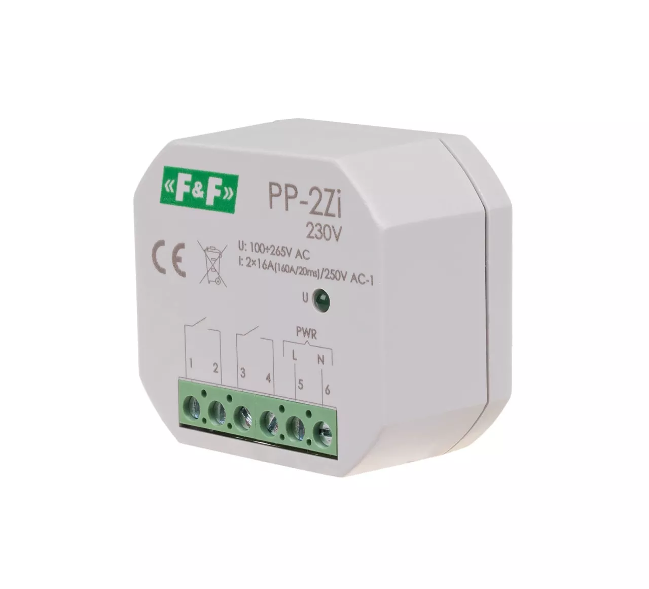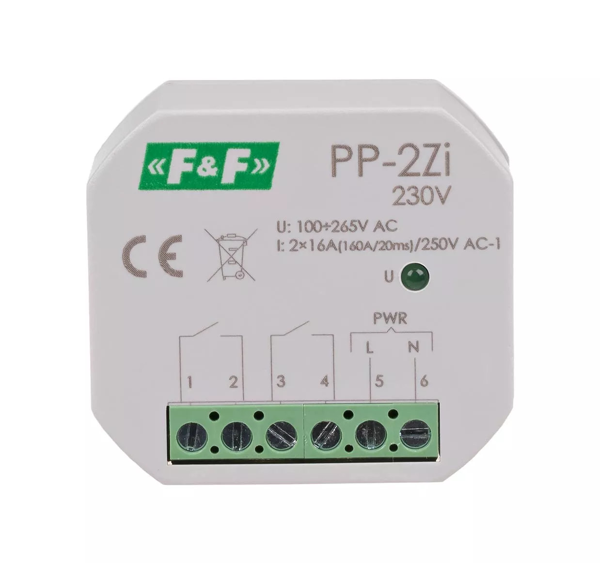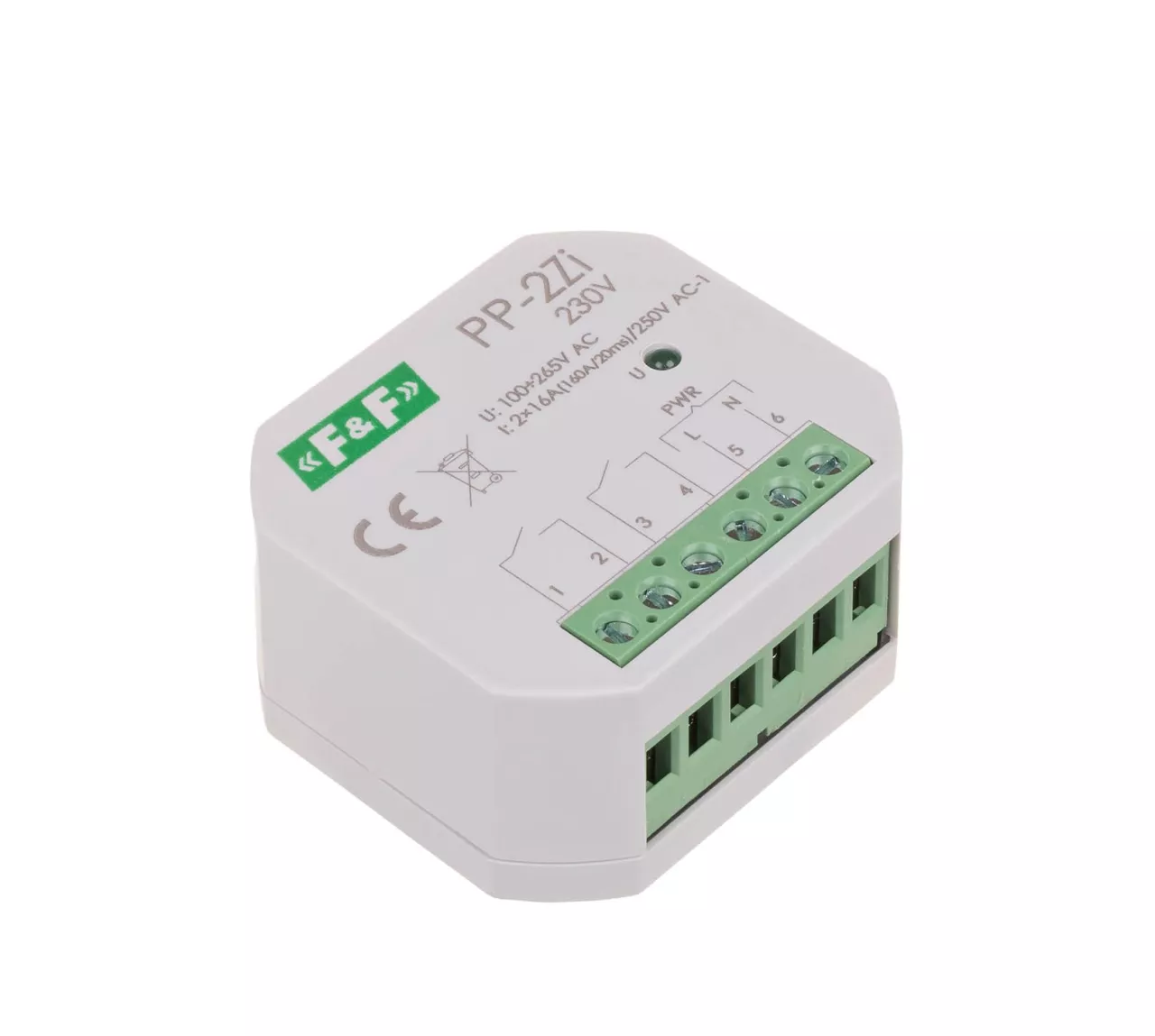Napięcie zasilania 100÷265 V AC Maksymalny prąd obciążenia AC-1 16 A (160 A/20 ms) Element wykonawczy przekaźnik Konfiguracja styków 2 × NO Separacja styku TAK Trwałość łączeniowa mechaniczna min. 5x10⁶ cykli Przyłącze zaciski śrubowe 2,5 mm² Moment dokręcający 0,4 Nm Pobór mocy 0,6 W Temperatura pracy -25 ÷ 50 °C Wymiary Ø54 (48×43 mm), wysokość: 25 mm Montaż w puszce podtynkowej Ø60 Stopień ochrony IP20