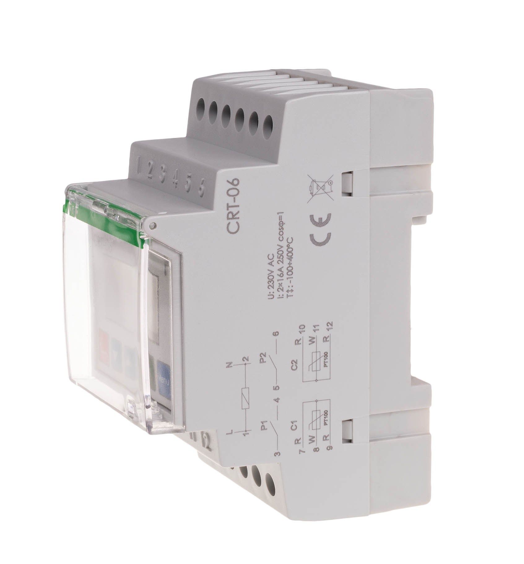 Napięcie zasilania 230 V AC Element wykonawczy 2 × przekaźnik Maksymalny prąd obciążenia 2 × 16 A Konfiguracja styków 2 × NO Separacja styku TAK Zakres regulacji temperatury -100÷400°C Histereza - regulowana 0÷100°C Dokładność nastawy 1°C Sonda temperatury 2 x RT56 (PT-100) Korekcja wzorcowa ±20°C Czas zwłoki przełączenia - regulowany 0÷45 min. Gradient - regulowany 4°C /1s÷6°C/1min. Częstotliwość próbkowania - regulowana 1÷120 próbek/1min. Przyłącze zaciski śrubowe 4,0 mm² Moment dokręcający 0,5 Nm Pobór mocy 1,5 W Temperatura pracy -20÷40°C Wymiary 3 moduły (52,5 mm) Montaż na szynie 35 mm Stopień ochrony IP20