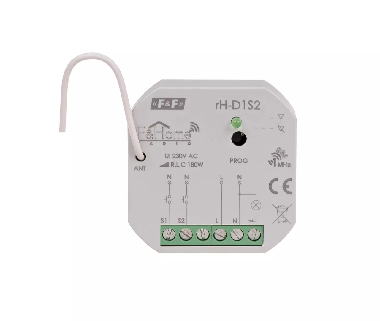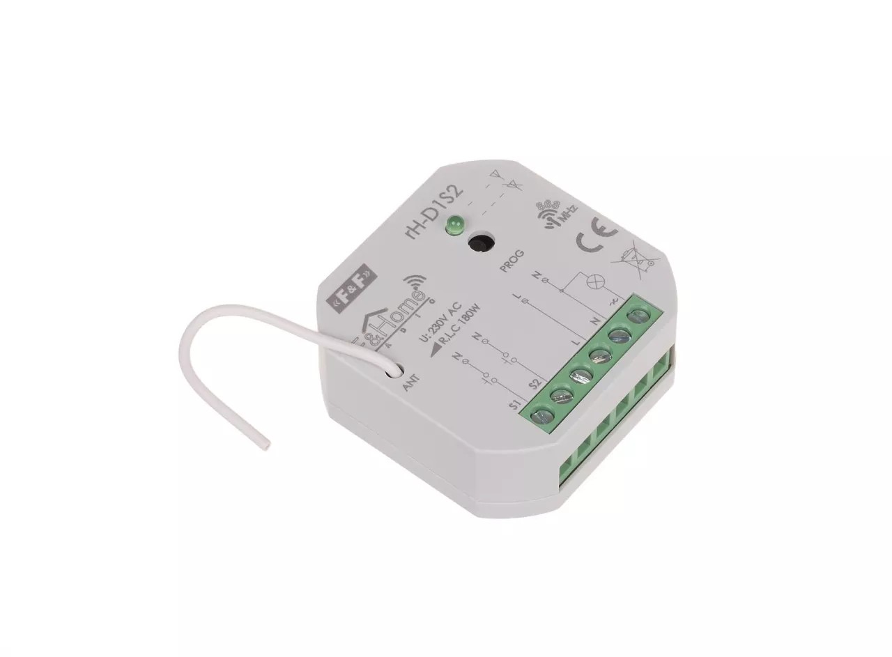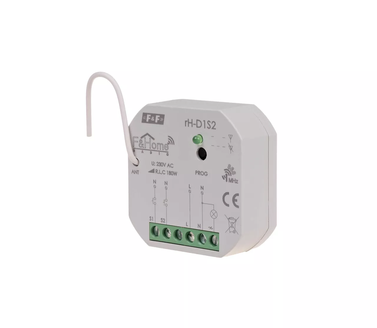 Ściemniacz z nadajnikiem dwukanałowym rH-D1S2 jest połączeniem ściemniacza i dwóch wejść stykowych. Moduł wysyła informacje o zwarciu lub rozwarciu styków do systemu oraz steruje odbiornikiem AC230V. Komunikacja z serwerem odbywa się drogą radiową. Moduł posiada dwa fizyczne wejścia do podłączenia dwóch monostabilnych styków bezpotencjałowych, oraz jedno wejście do podłączenia odbiornika. Obciążenie wejścia mocy może być rezystancyjne (lampy żarowe), indukcyjne (silniki AC i transformatory) i pojemnościowe (lampy jarzeniowe). Regulacja mocy odbywa się na zasadzie modulacji fazy z wyłączeniem w fazie, w zakresie 0-100%. rH-D1S2 szczególnie nadaje się do sterownia oświetleniem, wentylatorem malej mocy, grzałką.