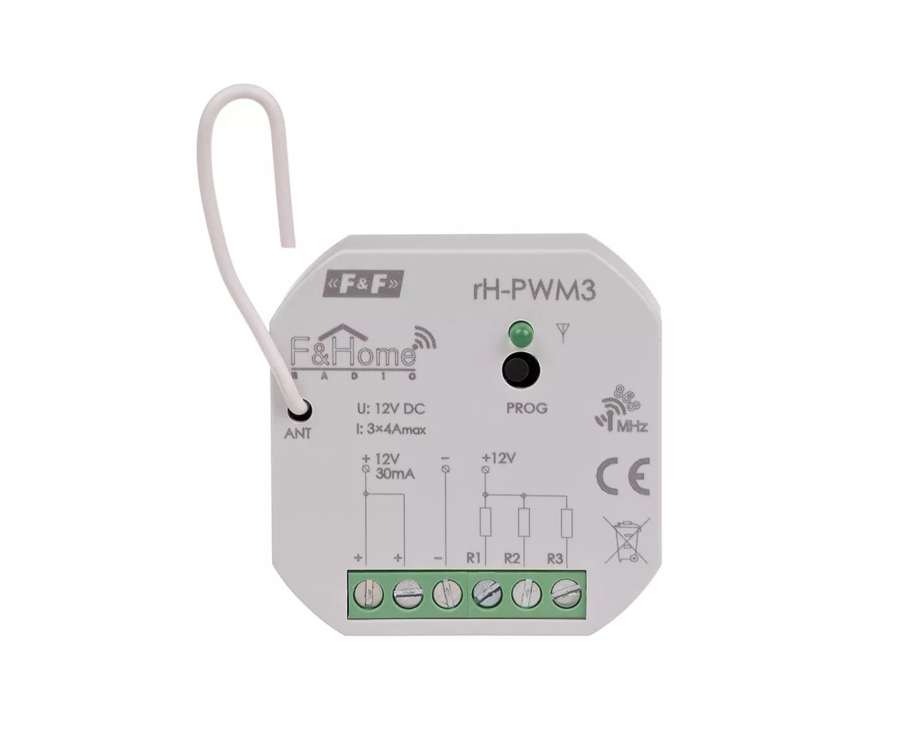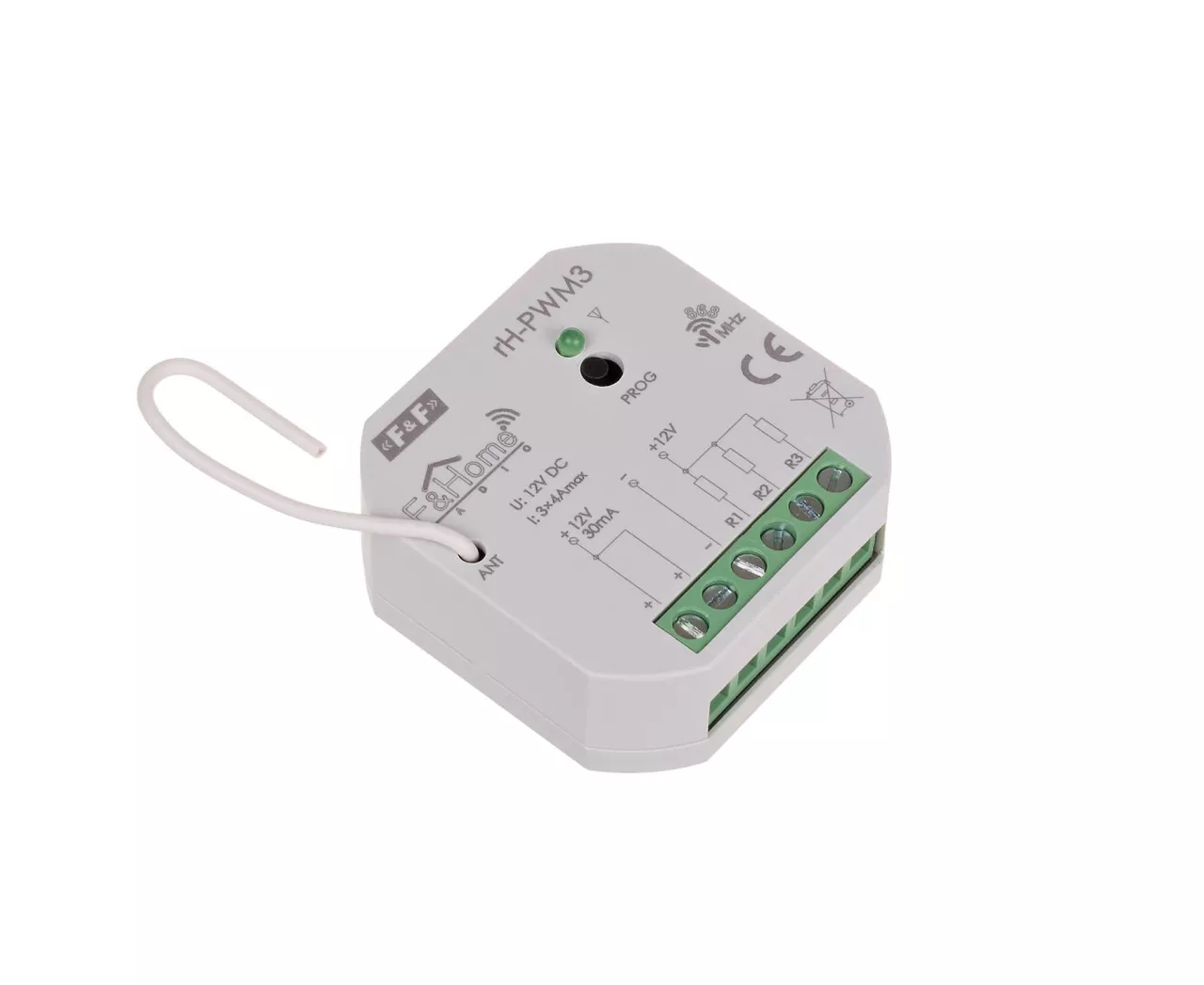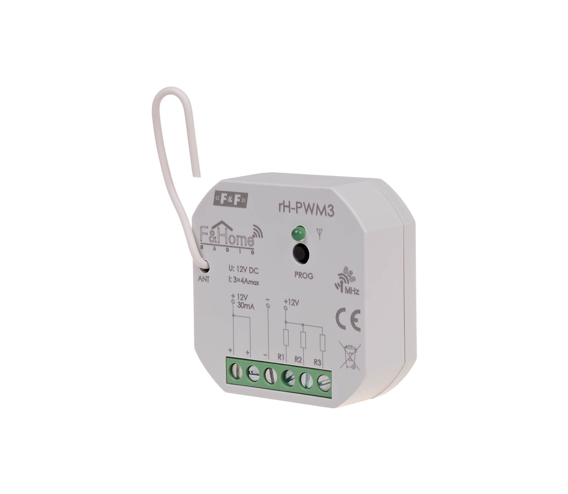 Sterownik PWM trzykanałowy niskiego napięcia rH-PWM3 służy do sterowania trzema odbiornikami niskiego napięcia zasilanymi z zewnętrznego zasilacza. Regulacja mocy odbywa się poprzez modulację szerokości impulsu załączającego odbiornik (PWM). Częstotliwość impulsów ustawiana jest w zakresie 100Hz do 1 kHz. Komunikacja z serwerem odbywa się drogą radiową. rH-PWM3 szczególnie nadaje się do sterowania diodami LED, załączania zamków elektromagnetycznych i innych niskonapięciowych elementów wykonawczych.