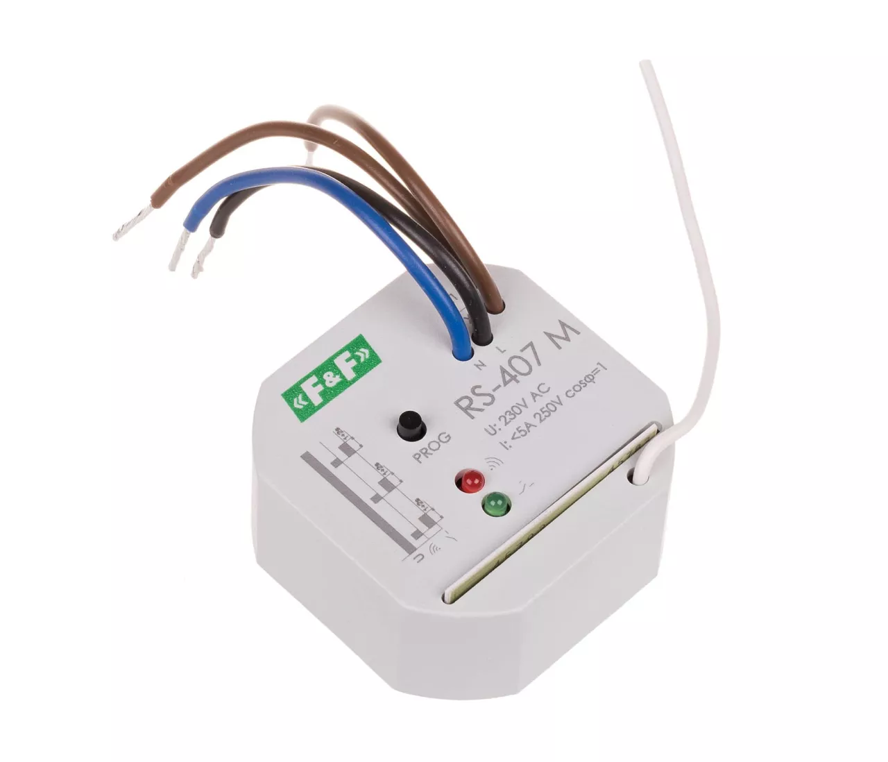 Napięcie zasilania 230 V AC Element wykonawczy przekaźnik Maksymalny prąd obciążenia 5 A Konfiguracja styków separowany 1 × NO Separacja styku TAK Sygnalizacja stanu styku LED zielona Sygnalizacja odbioru / programowania LED czerwona Przyłącze 4×LY 1 mm² , l: 10 cm Pobór mocy 0,8 W Temperatura pracy -25 ÷ 50 °C Wymiary Ø 55 mm, h: 21 mm Montaż w puszce podtynkowej Ø60 Stopień ochrony IP20
