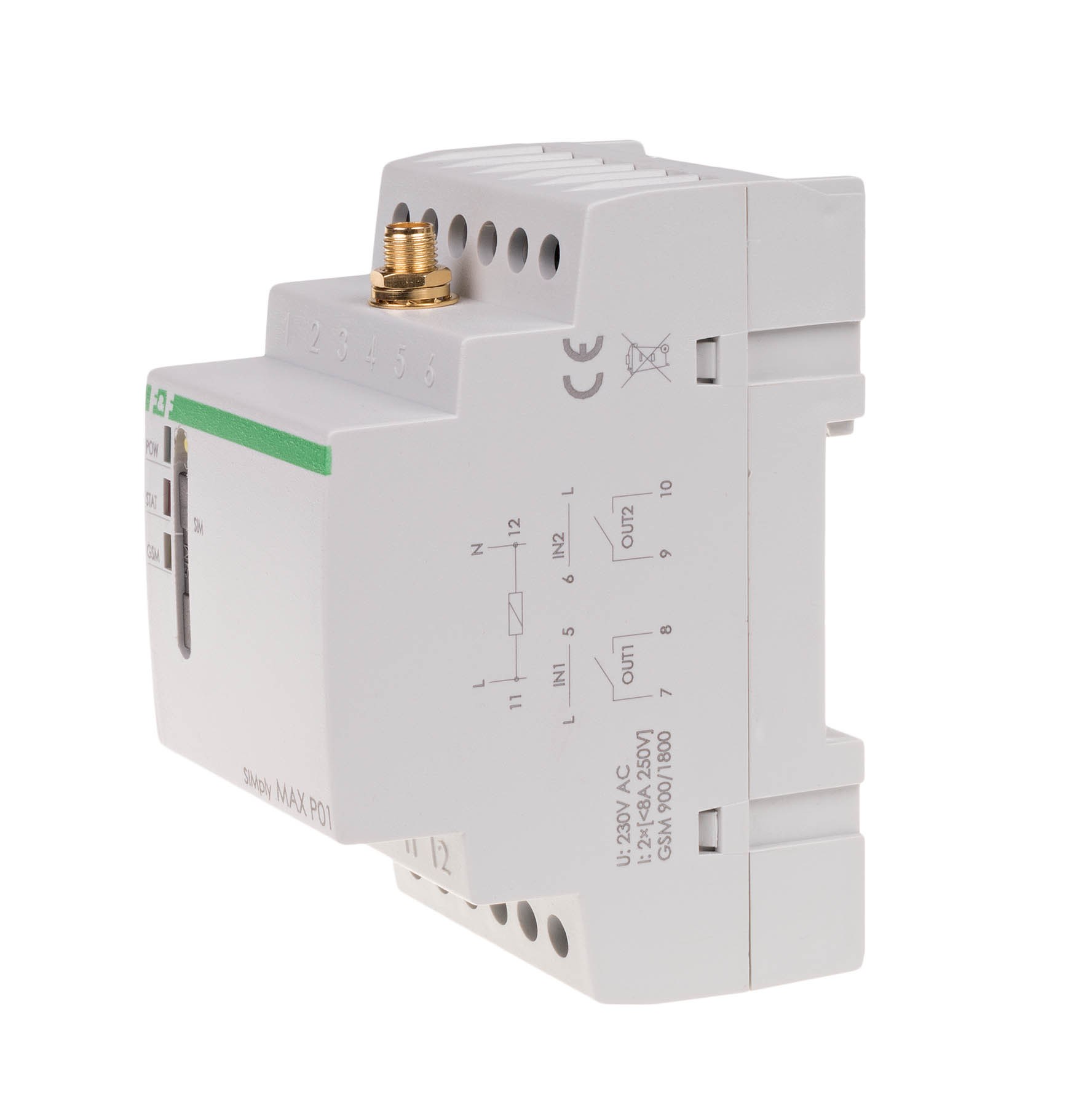 Napięcie zasilania 230 V AC Element wykonawczy 2 x przekaźnik Maksymalny prąd obciążenia 8 A Konfiguracja styków 2 × NO Wejścia ilość 2 Wejścia - tolerancja napięciowa 160÷260 V AC Porty SIM Typ złącza anteny SMA Antena GSM wymiary 20 mm x 100 mm Długość przewodu anteny 2,5 m Przyłącze zaciski śrubowe 4,0 mm² Moment dokręcający 0,5 Nm Pobór mocy czuwanie/praca 1,3 W / 3 W Temperatura pracy -10÷50°C Wymiary 3 moduły (52,5 mm) Montaż na szynie 35 mm Stopień ochrony IP20