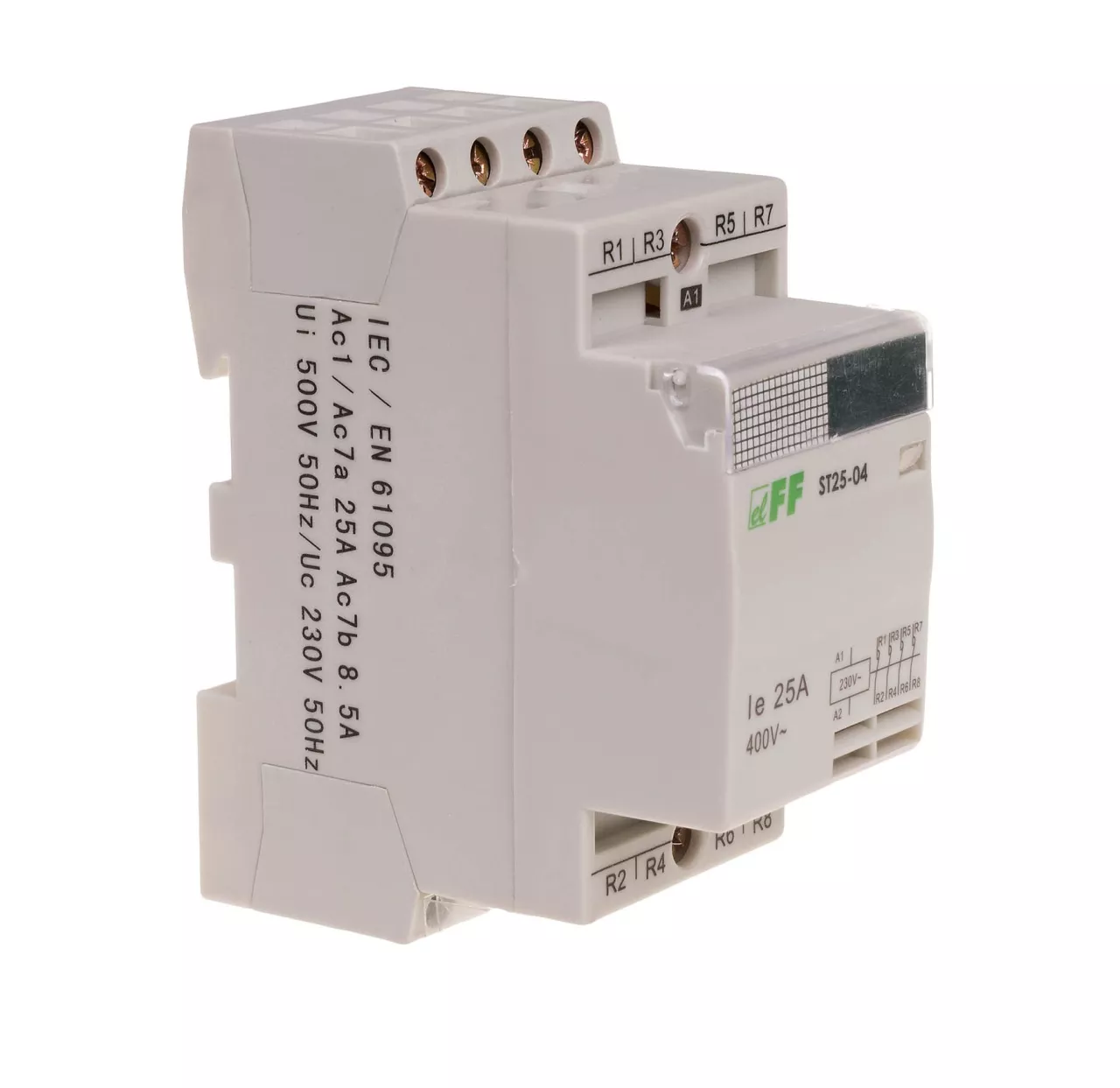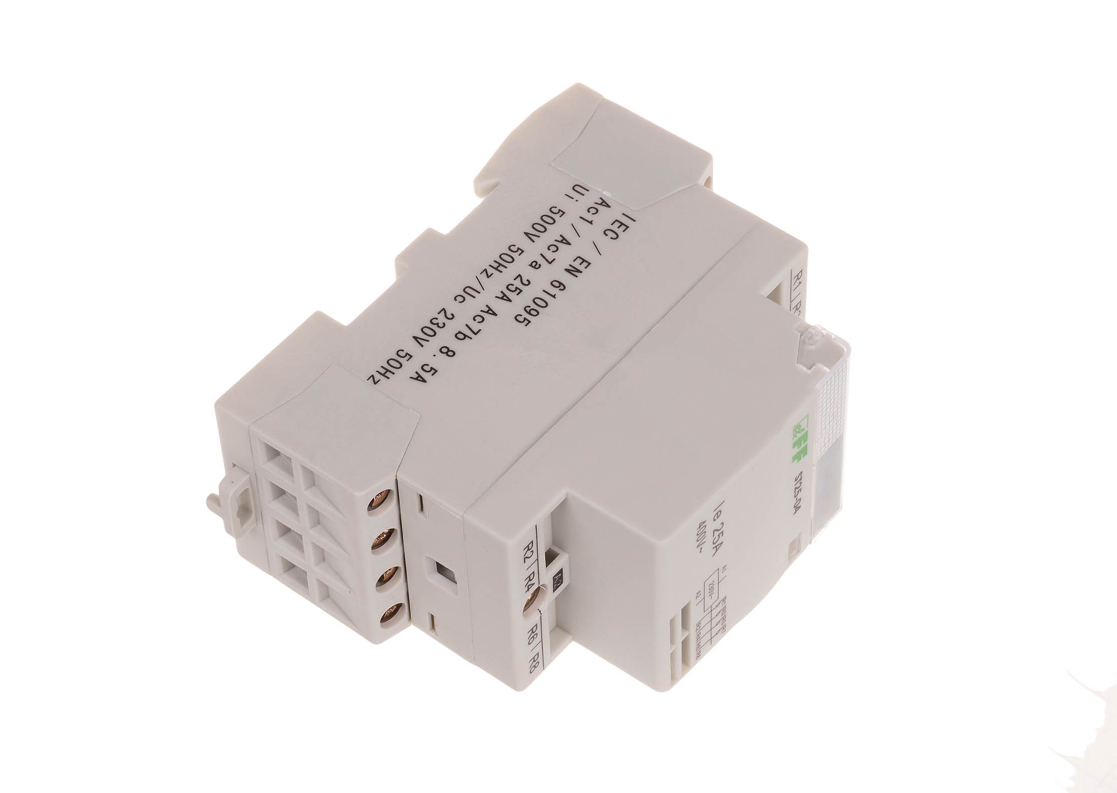 Napięcie zasilania cewki 230 V AC Konfiguracja styków 4×NC Prąd torów głównych 25 A Moc łączeniowa kat. AC1 (230V) 9 kW Moc łączeniowa kat. AC3 (230V) 2,2 kW Moduł 2 Nr normy IEC 61095 Trwałość łączeniowa elektryczna 1x10⁵ Trwałość łączeniowa mechaniczna 1x10⁶ Waga 168 g Zaciski śrubowe 6 mm² Napięcie izolacji 4 kV Pobór mocy 4 W Temperatura pracy -25 ÷ 50 °C Montaż na szynie 35 mm Stopień ochrony IP20