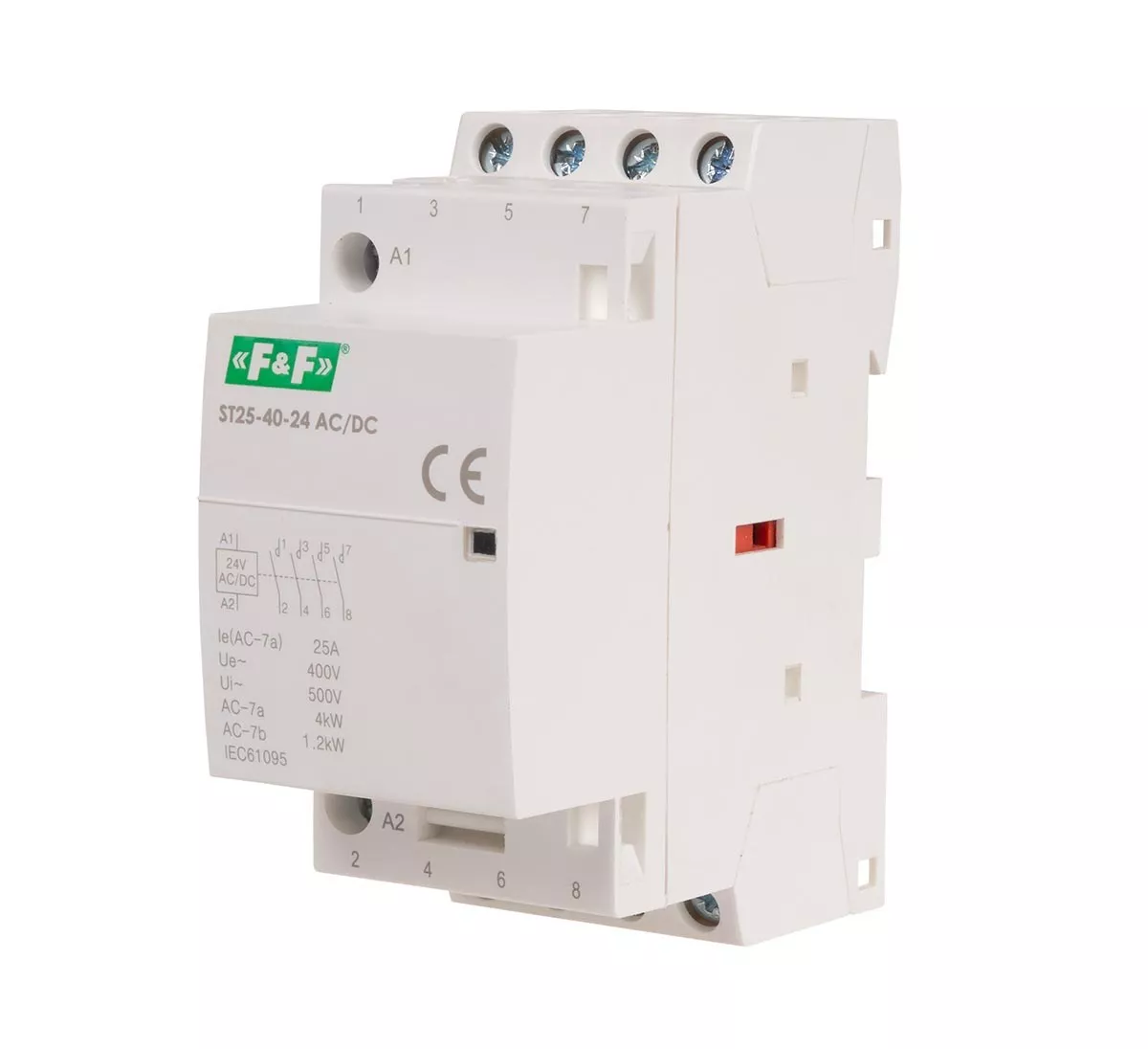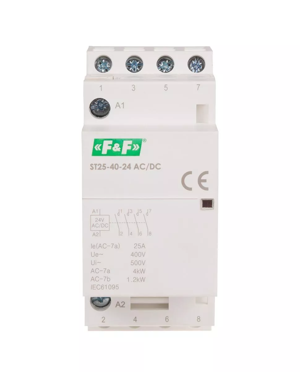 Napięcie zasilania cewki 24V AC DC Konfiguracja styków 4xNO Prąd torów głównych 25 A Moc łączeniowa kat. AC1 (230V) 9 kW Moc łączeniowa kat. AC3 (230V) 2,2 kW Nr normy IEC 61095 Trwałość łączeniowa elektryczna 1x10⁵ Trwałość łączeniowa mechaniczna 1x10⁶ Waga 106 g Zaciski śrubowe 4 mm² Napięcie izolacji 4 kV Pobór mocy 4 W Temperatura pracy -25 ÷ 50 °C Wymiary 2 moduły Montaż na szynie 35 mm Stopień ochrony IP23